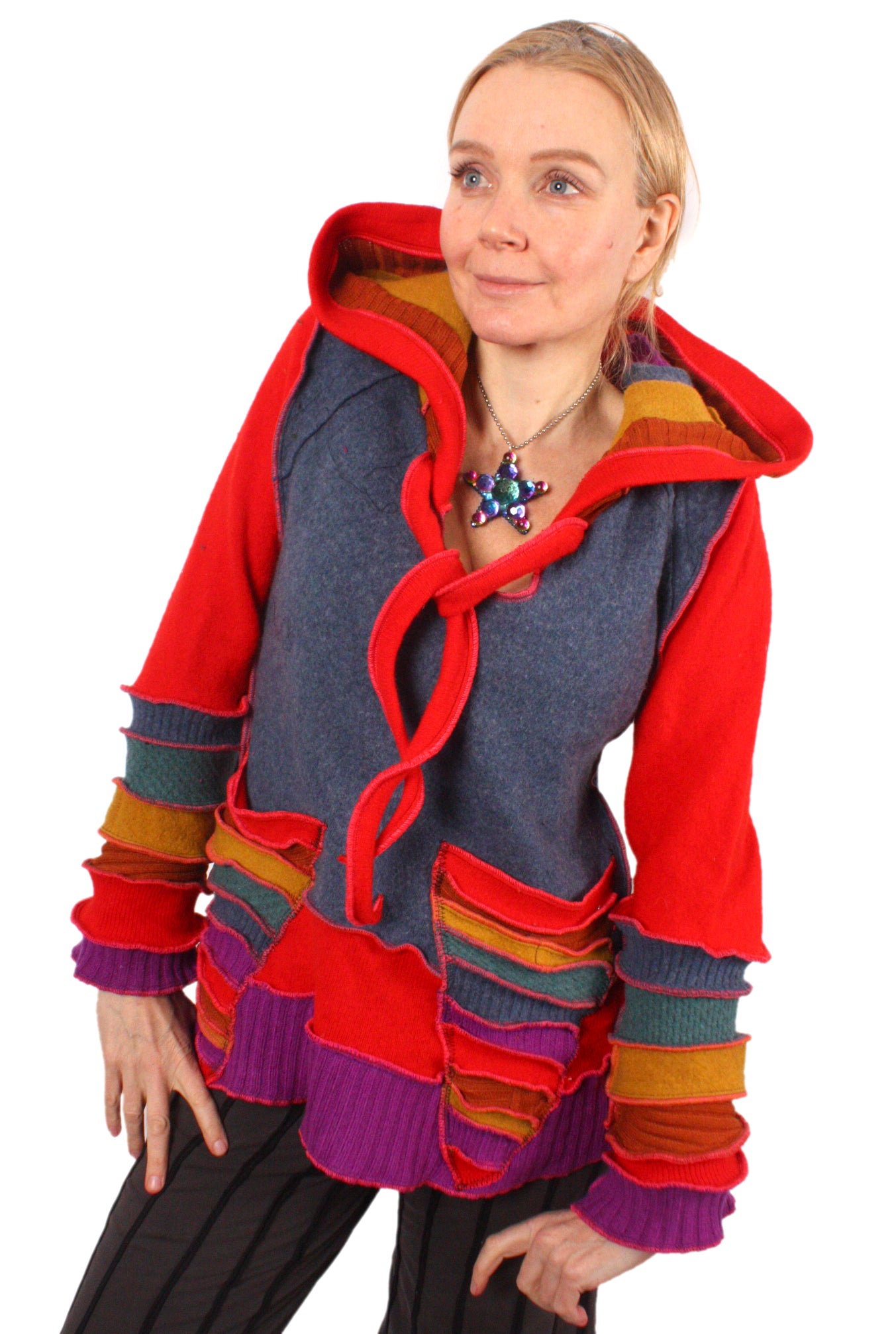 Each Katwise sweater is one-of-a-kind, sewn by me in my attic. They are perfectly imperfect, sometimes borderline wonky. They are all upcycled from sweaters I find in my vast thrift shopping expeditions. There is a huge variety in the texture and stretchiness of these knits, so no two are ever quite alike.