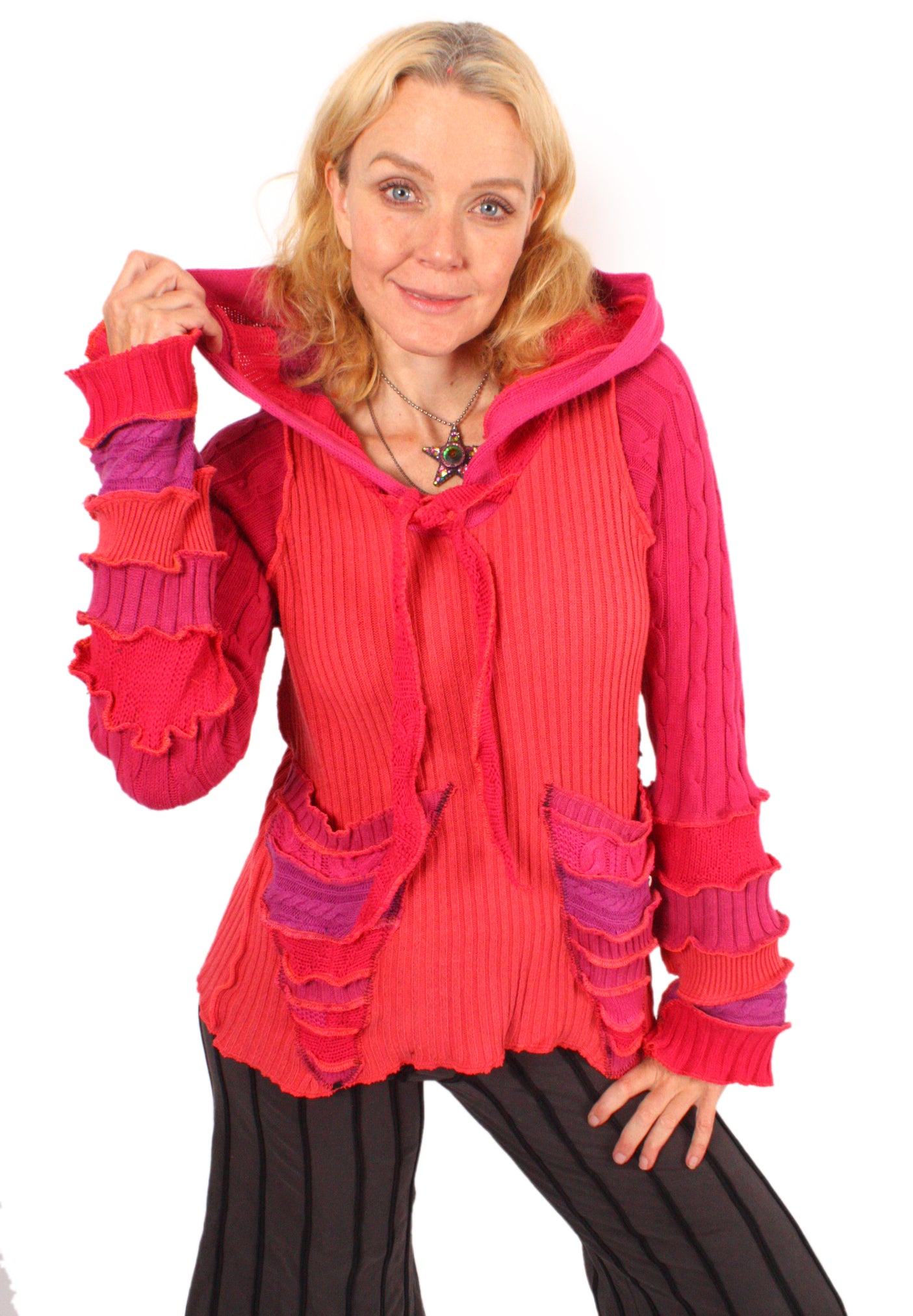 Each Katwise sweater is one-of-a-kind, sewn by me in my attic. They are perfectly imperfect, sometimes borderline wonky. They are all upcycled from sweaters I find in my vast thrift shopping expeditions. There is a huge variety in the texture and stretchiness of these knits, so no two are ever quite alike.