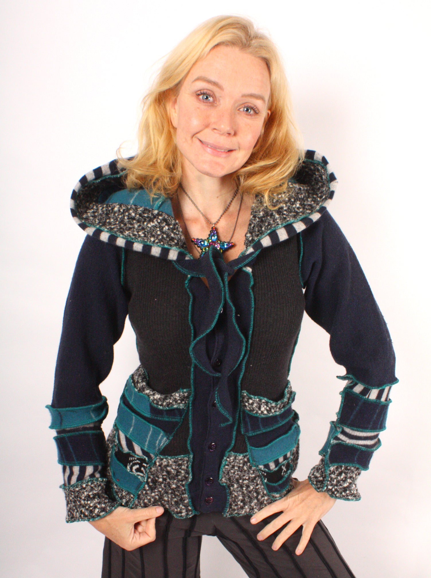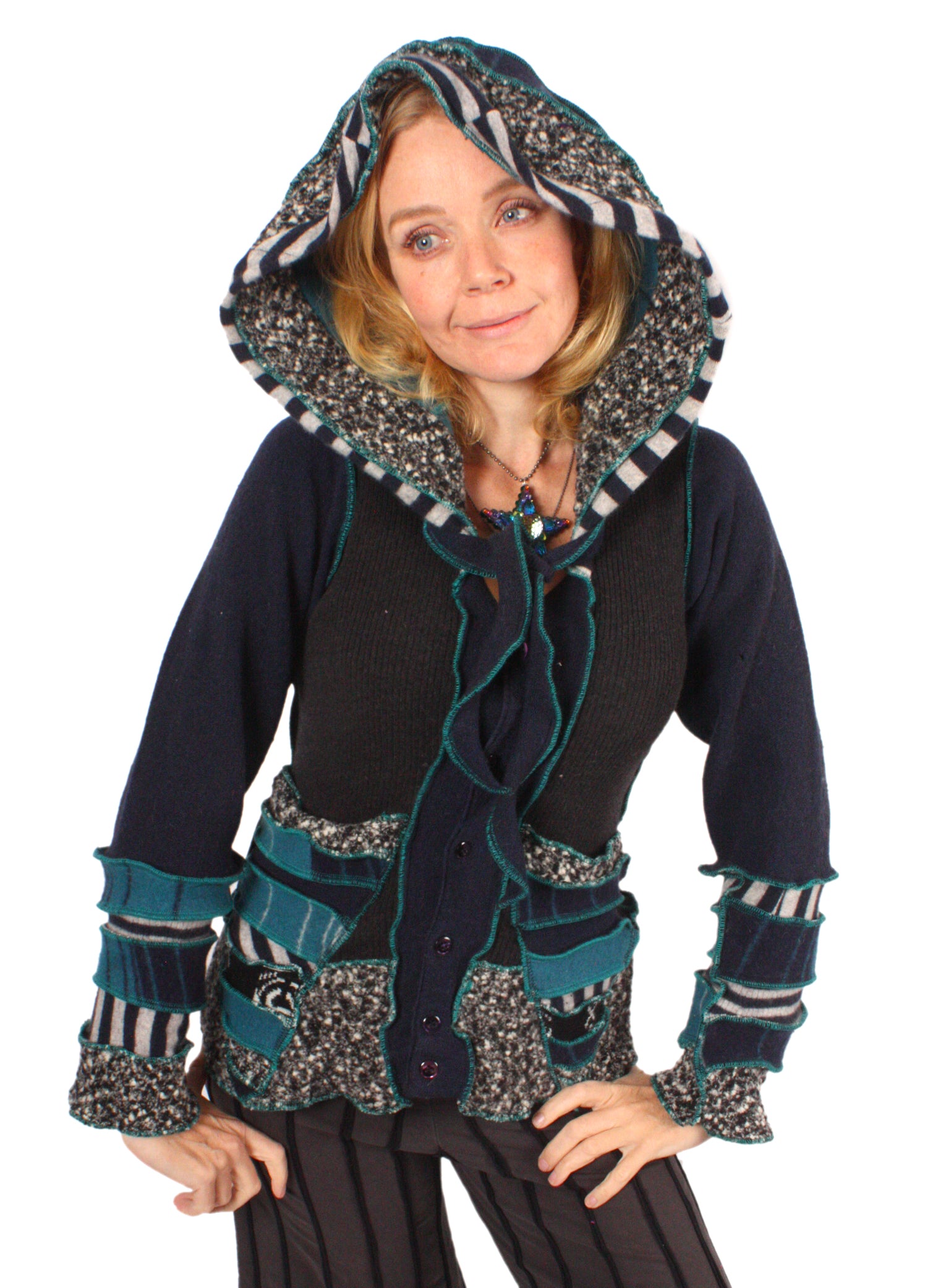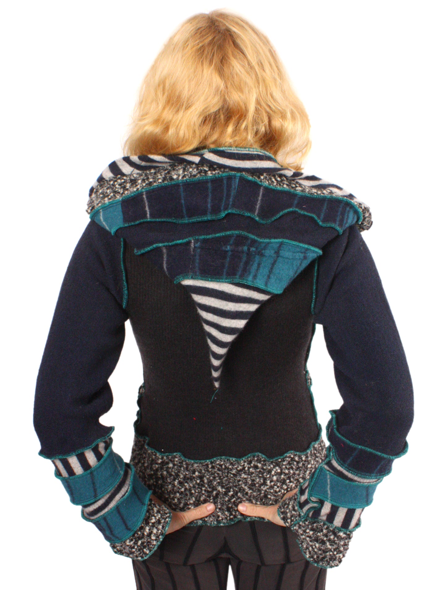 Each Katwise sweater is one-of-a-kind, sewn by me in my attic. They are perfectly imperfect, sometimes borderline wonky. They are all upcycled from sweaters I find in my vast thrift shopping expeditions. There is a huge variety in the texture and stretchiness of these knits, so no two are ever quite alike.
