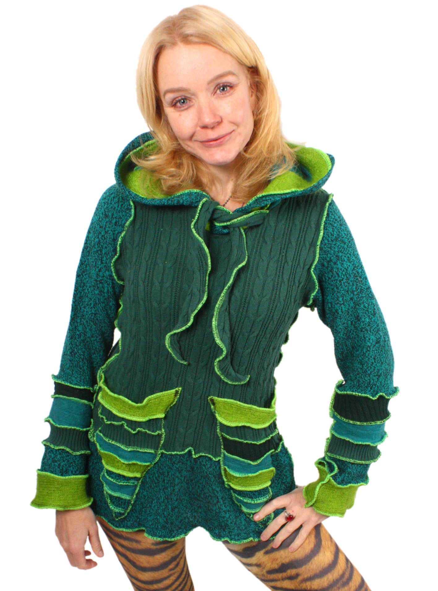 Each Katwise sweater is one-of-a-kind, sewn by me in my attic. They are perfectly imperfect, sometimes borderline wonky. They are all upcycled from sweaters I find in my vast thrift shopping expeditions. There is a huge variety in the texture and stretchiness of these knits, so no two are ever quite alike.