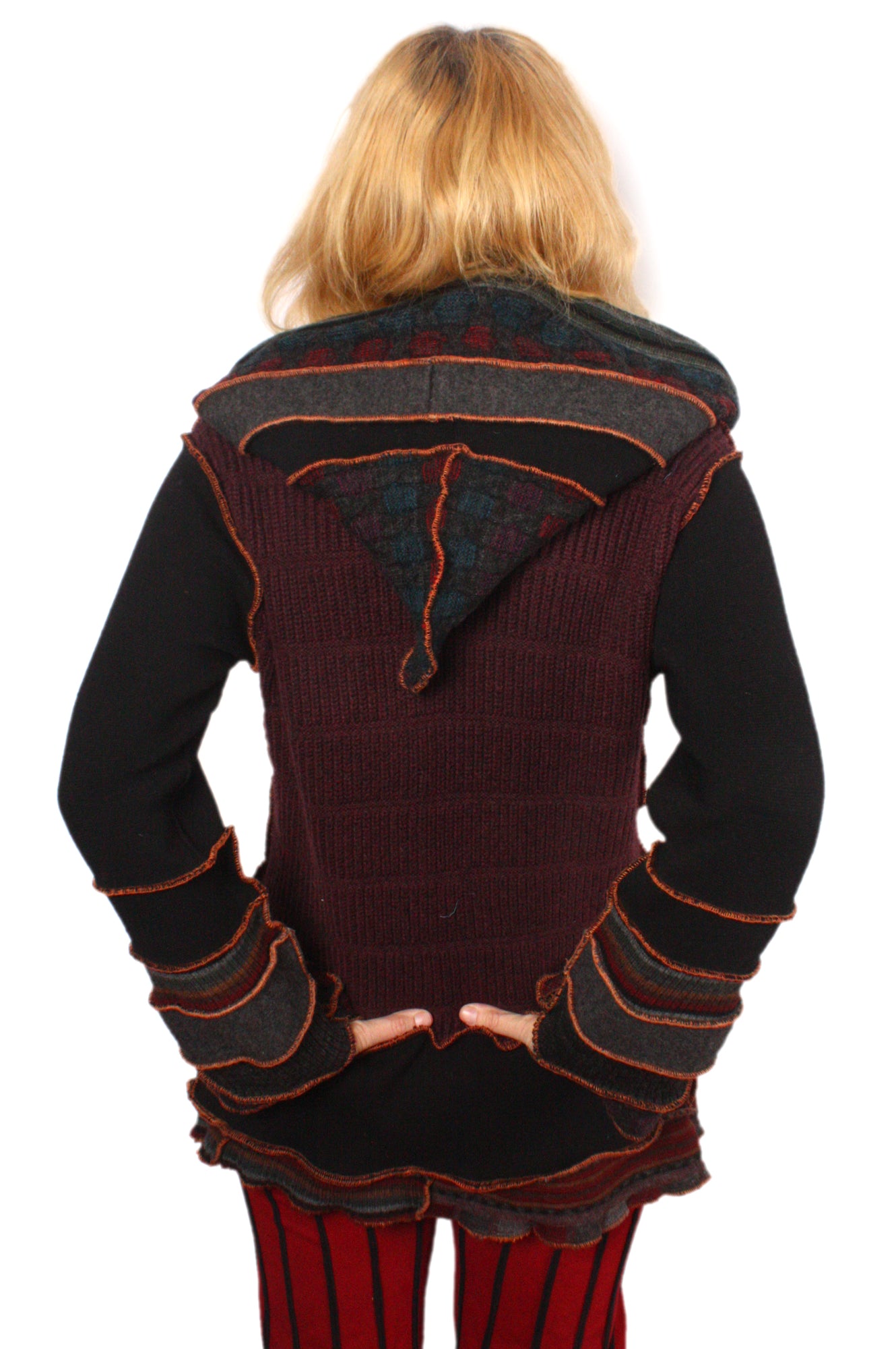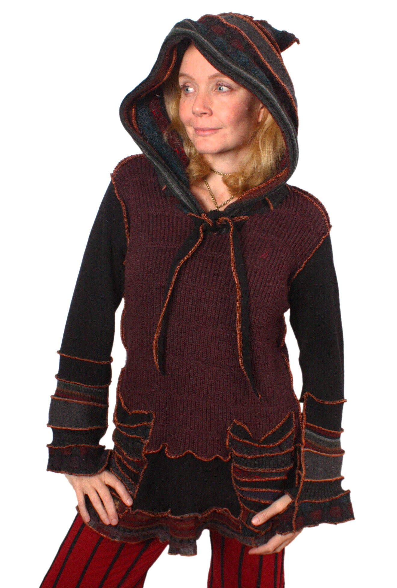 Cat Brier is a warm dark burgundy pullover with all sorts of subtle rusty patterns. It's a combination of cotton and wool.