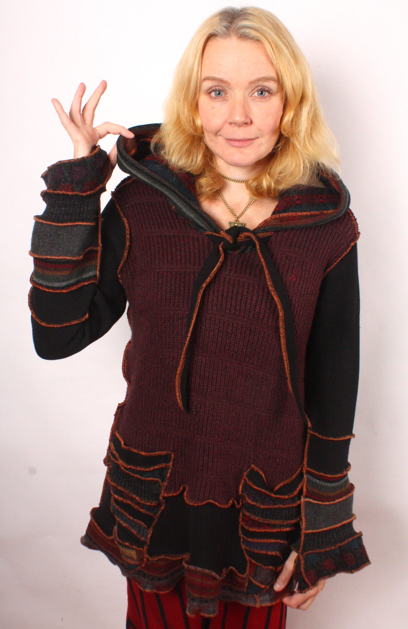 Each Katwise sweater is one-of-a-kind, sewn by me in my attic. They are perfectly imperfect, sometimes borderline wonky. They are all upcycled from sweaters I find in my vast thrift shopping expeditions. There is a huge variety in the texture and stretchiness of these knits, so no two are ever quite alike.