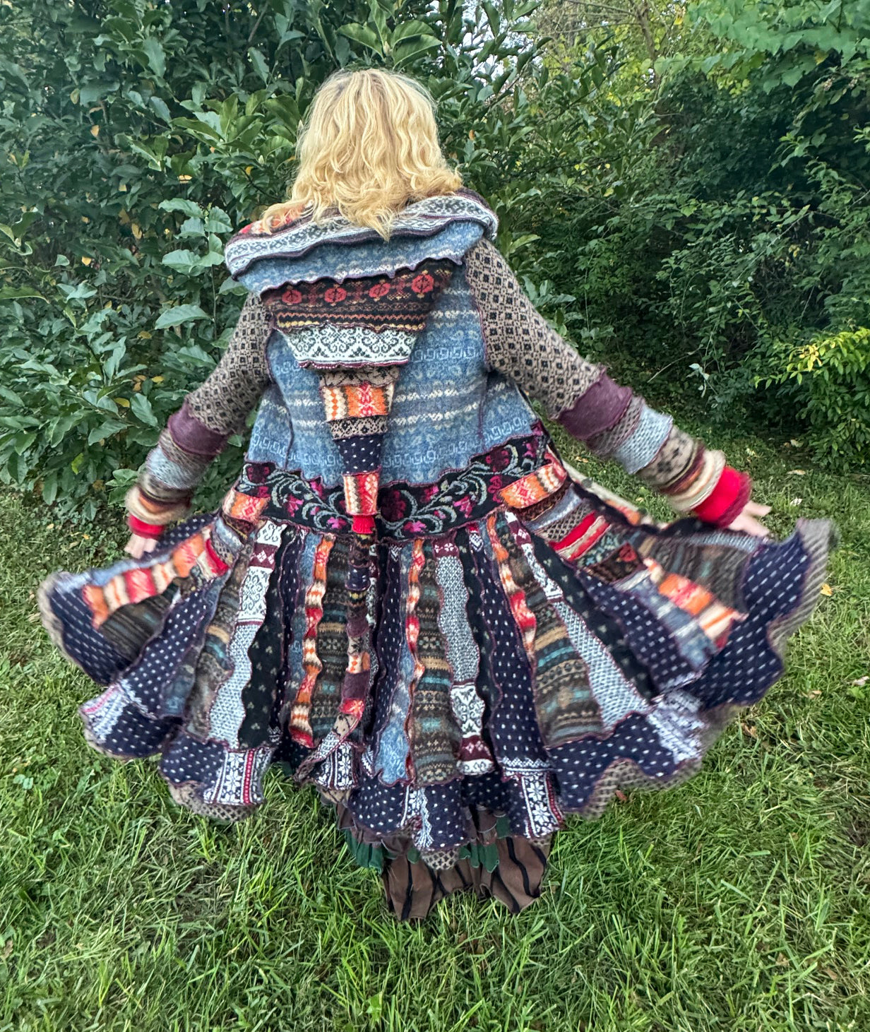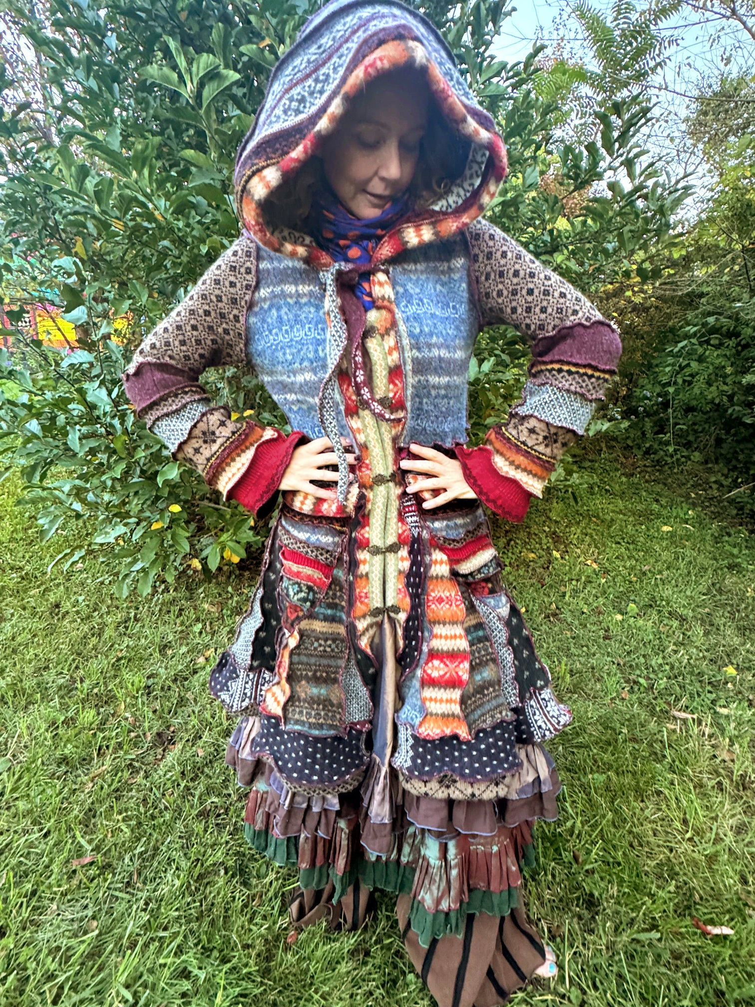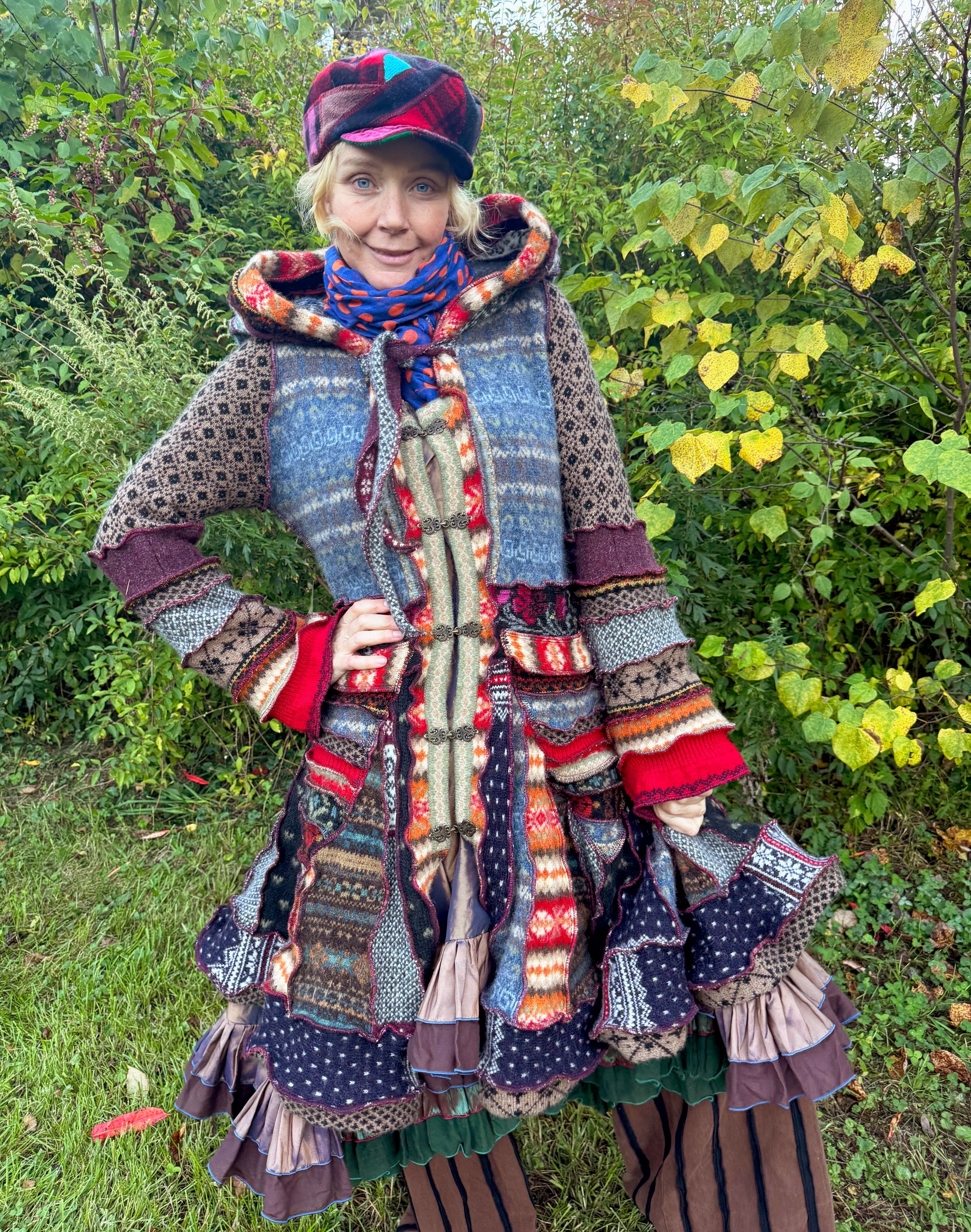 Each Katwise sweater is one-of-a-kind, sewn by me in my attic. They are perfectly imperfect, sometimes borderline wonky. They are all upcycled from sweaters I find in my vast thrift shopping expeditions. There is a huge variety in the texture and stretchiness of these knits, so no two are ever quite alike.