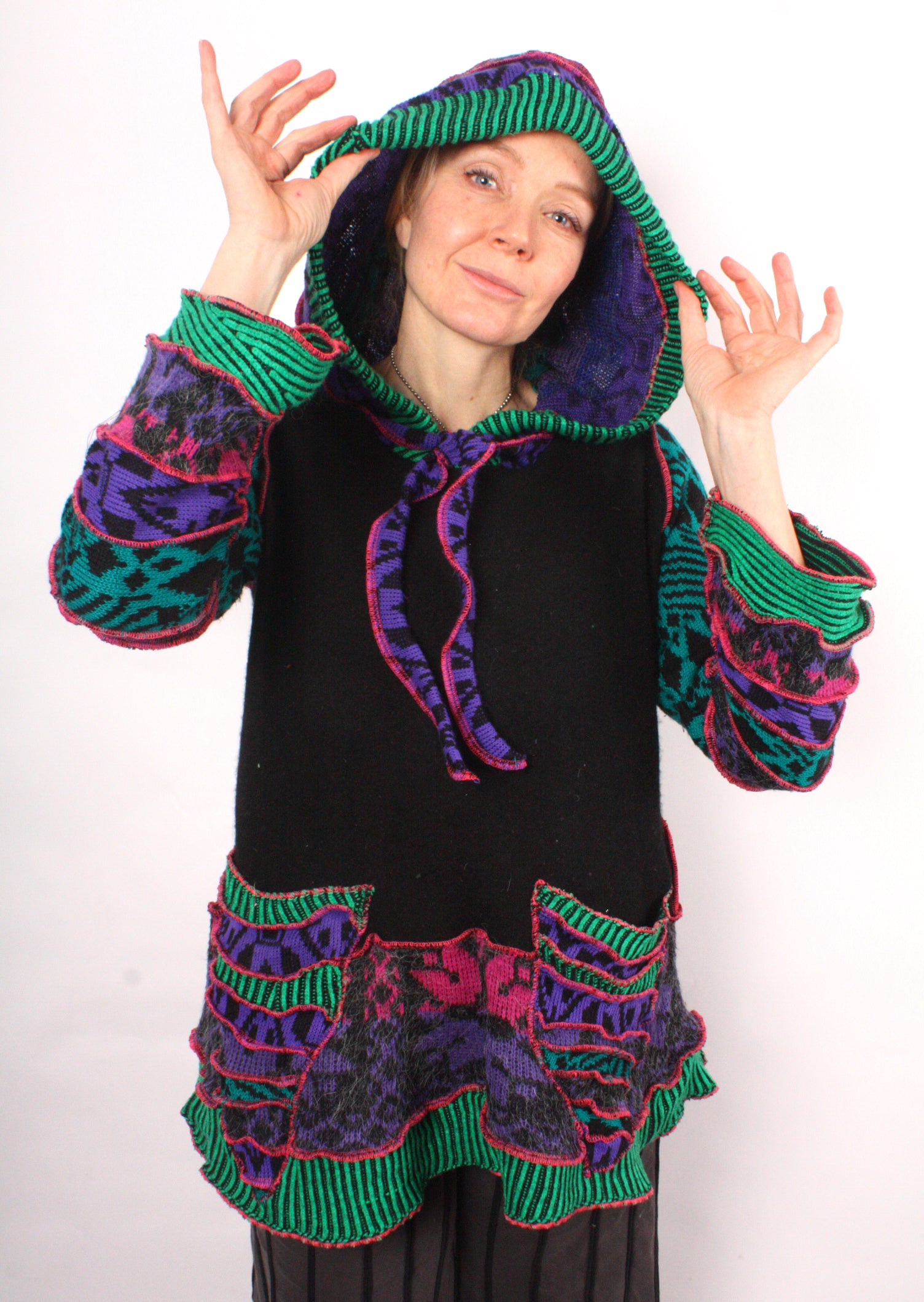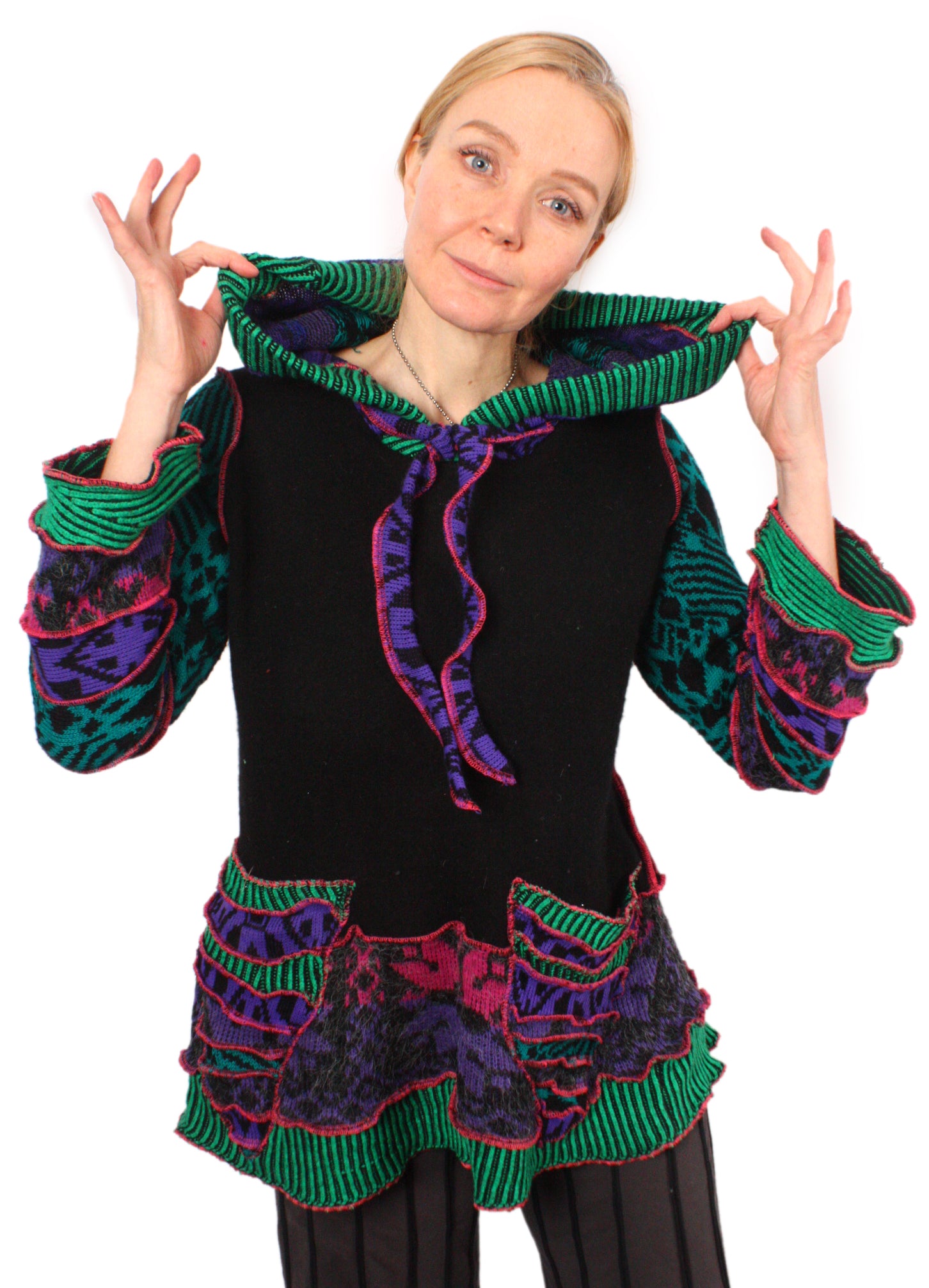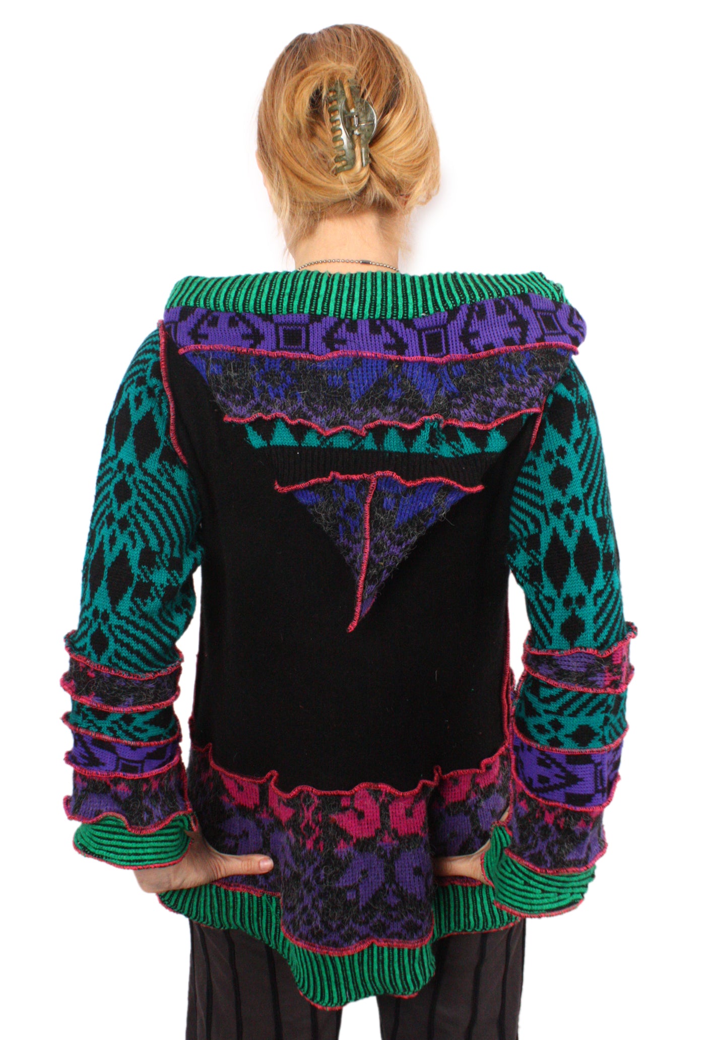 Each Katwise sweater is one-of-a-kind, sewn by me in my attic. They are perfectly imperfect, sometimes borderline wonky. They are all upcycled from sweaters I find in my vast thrift shopping expeditions. There is a huge variety in the texture and stretchiness of these knits, so no two are ever quite alike.