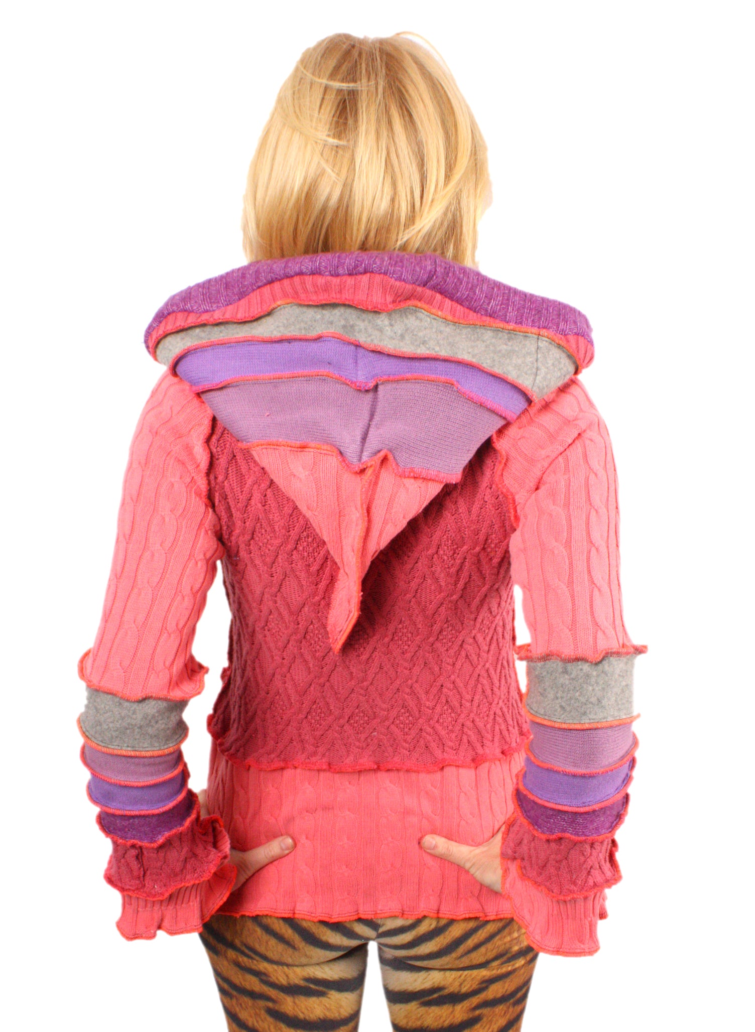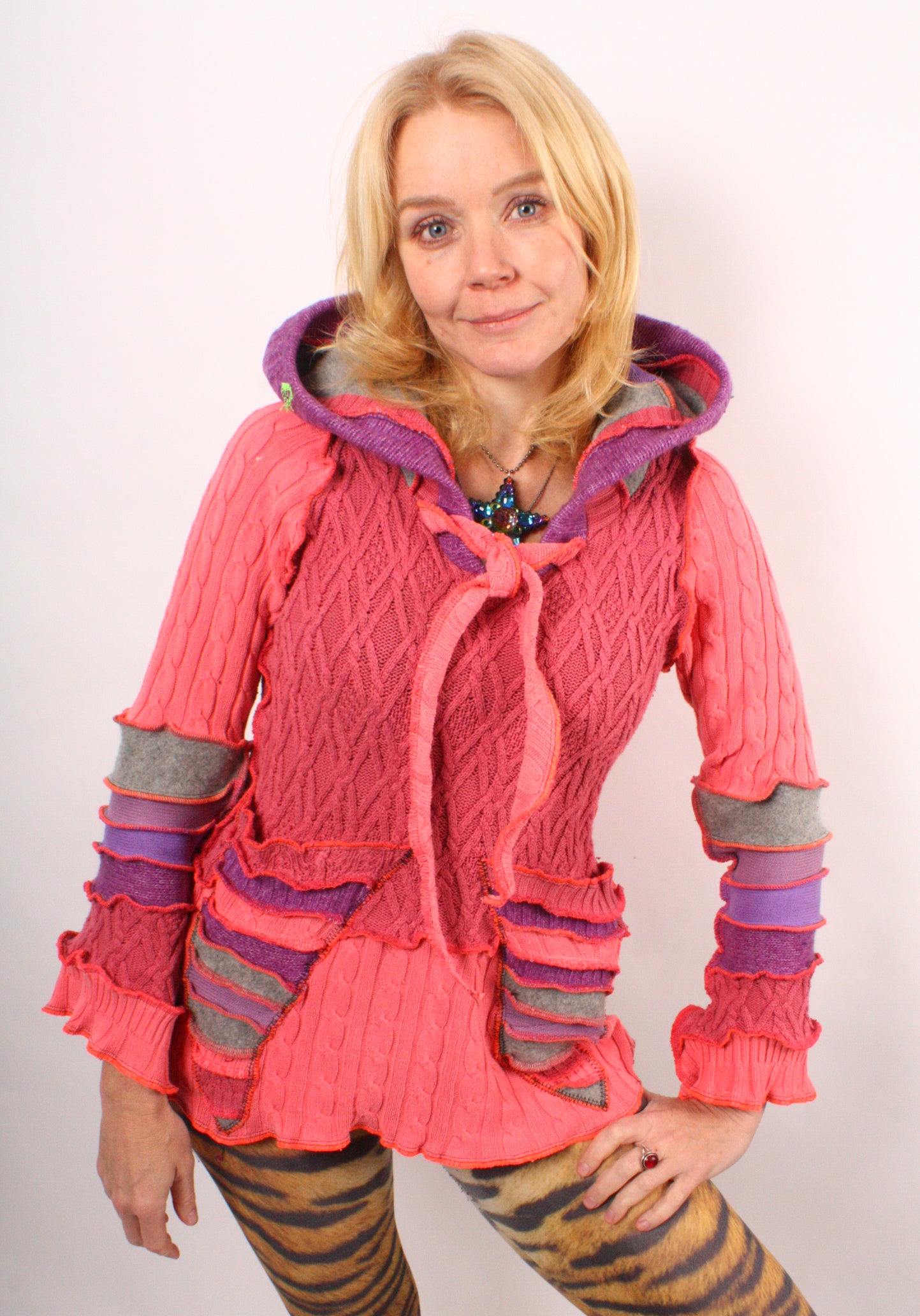 Each Katwise sweater is one-of-a-kind, sewn by me in my attic. They are perfectly imperfect, sometimes borderline wonky. They are all upcycled from sweaters I find in my vast thrift shopping expeditions. There is a huge variety in the texture and stretchiness of these knits, so no two are ever quite alike.