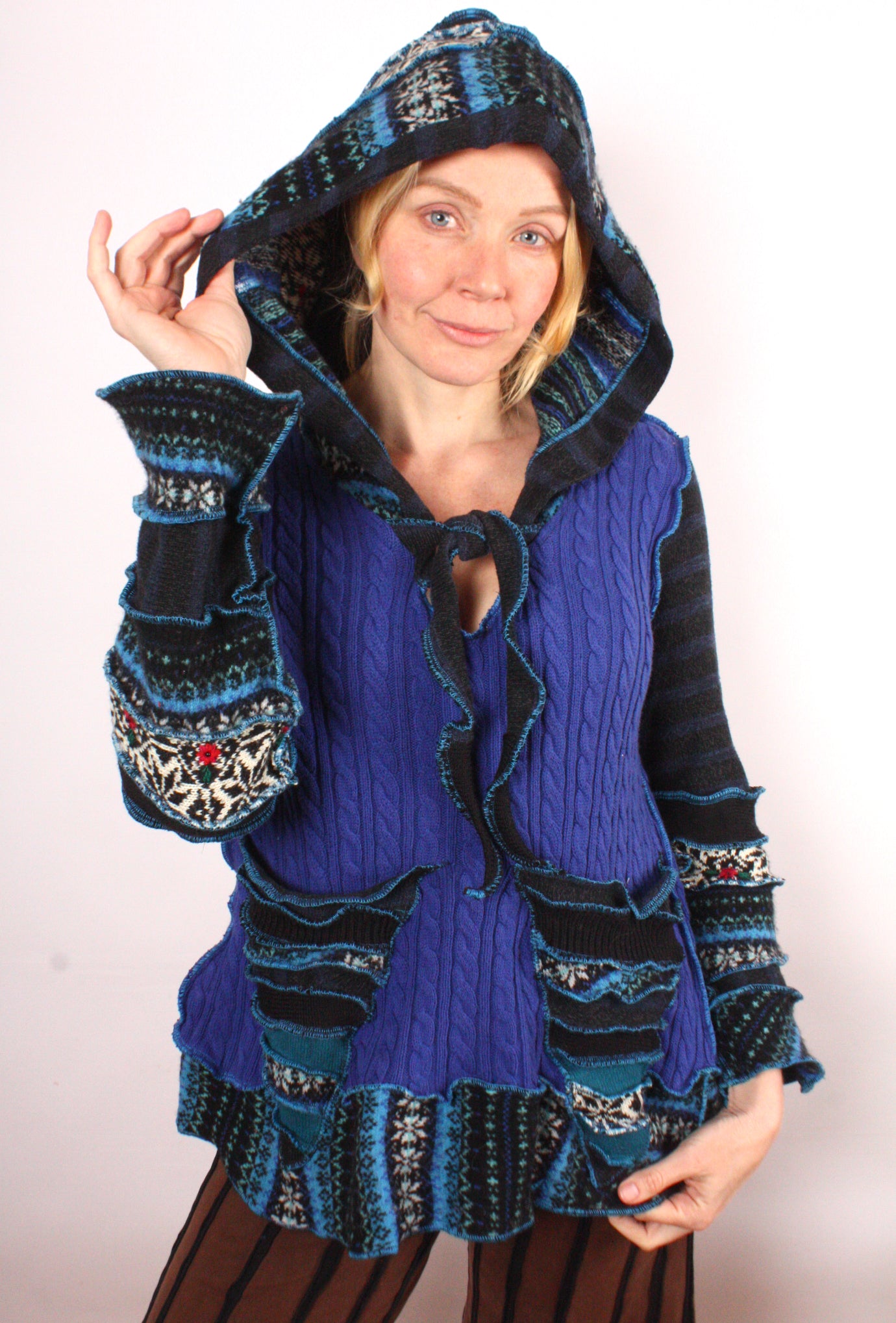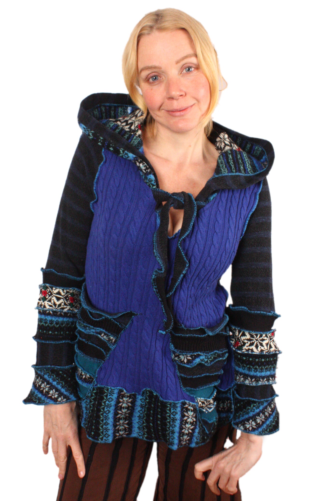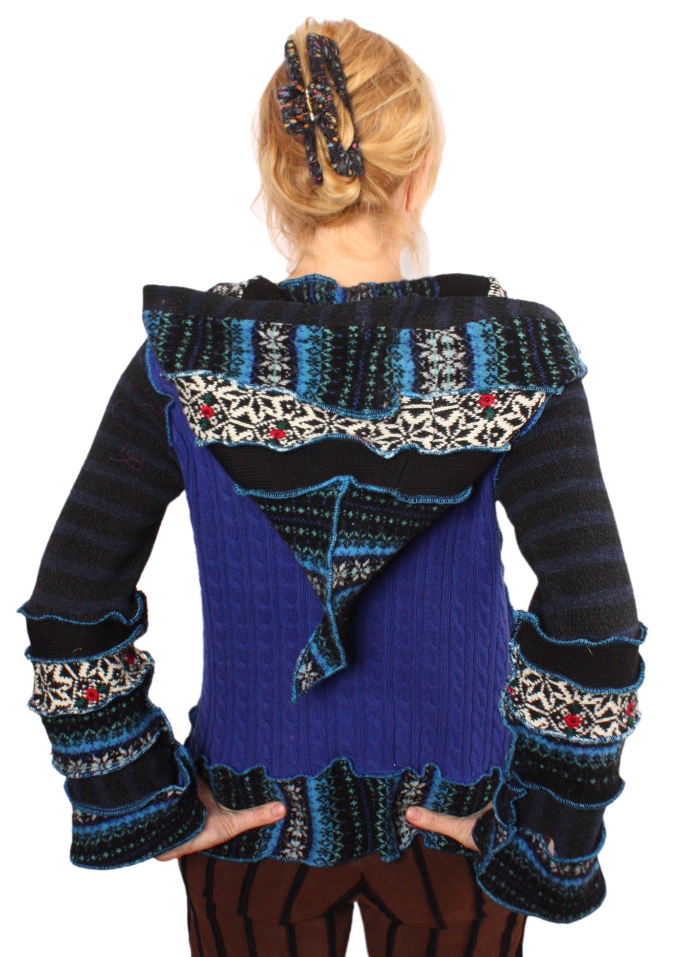 Each Katwise sweater is one-of-a-kind, sewn by me in my attic. They are perfectly imperfect, sometimes borderline wonky. They are all upcycled from sweaters I find in my vast thrift shopping expeditions. There is a huge variety in the texture and stretchiness of these knits, so no two are ever quite alike.