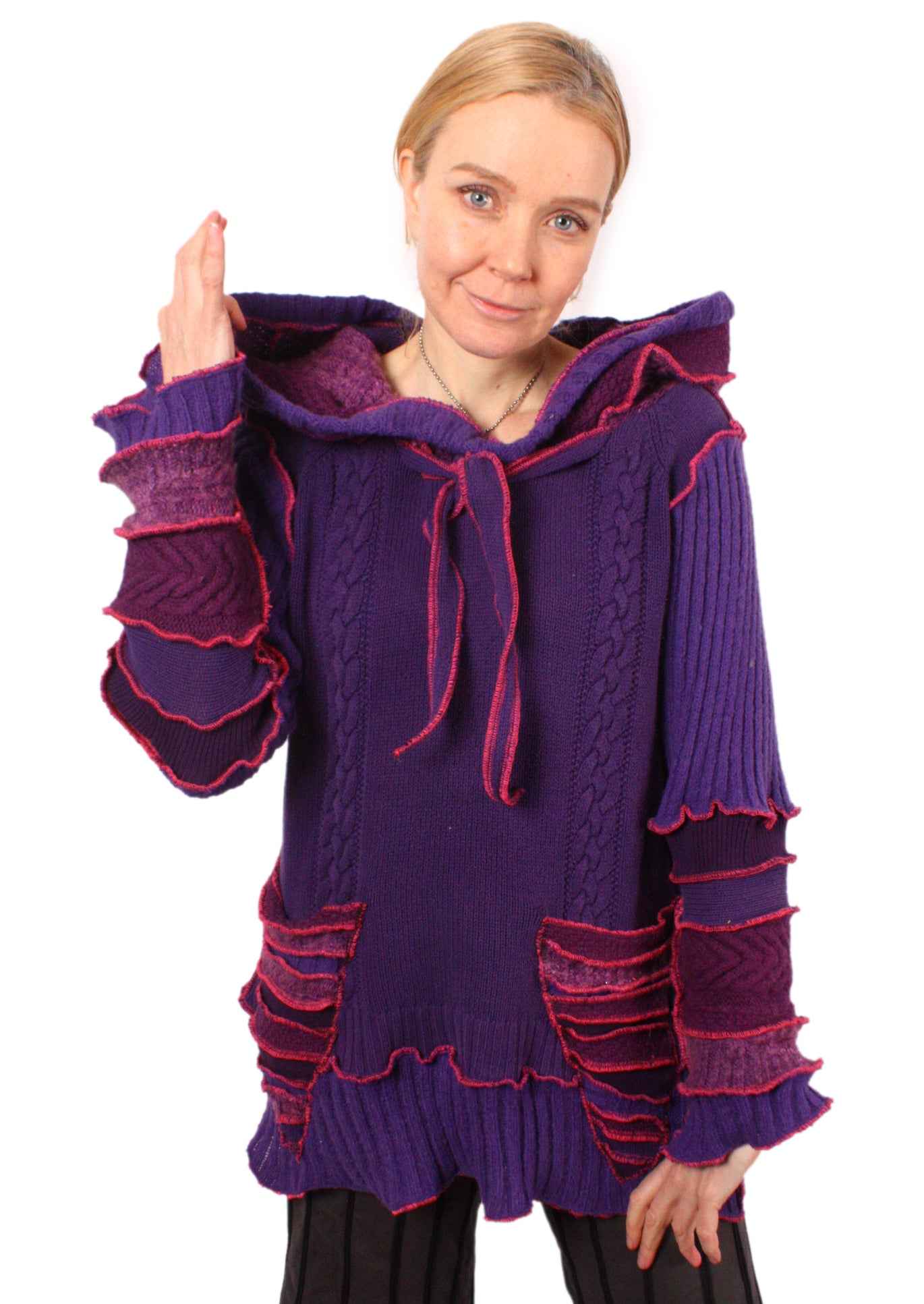 Oh Qué Será? is a plum perfect pullover of pleasing purple with electric pink seams. It's mostly cotton with a touch of wool.