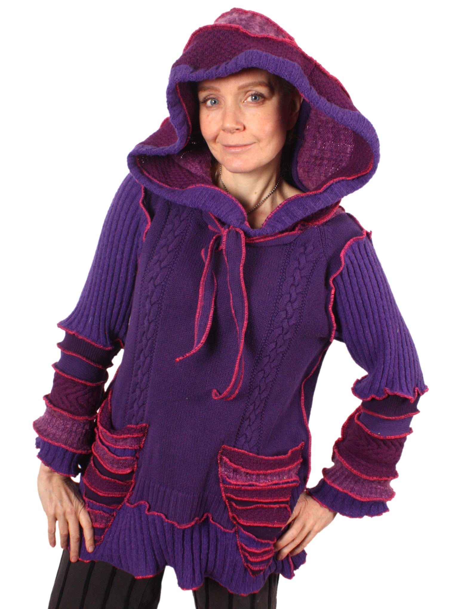 Each Katwise sweater is one-of-a-kind, sewn by me in my attic. They are perfectly imperfect, sometimes borderline wonky. They are all upcycled from sweaters I find in my vast thrift shopping expeditions. There is a huge variety in the texture and stretchiness of these knits, so no two are ever quite alike.