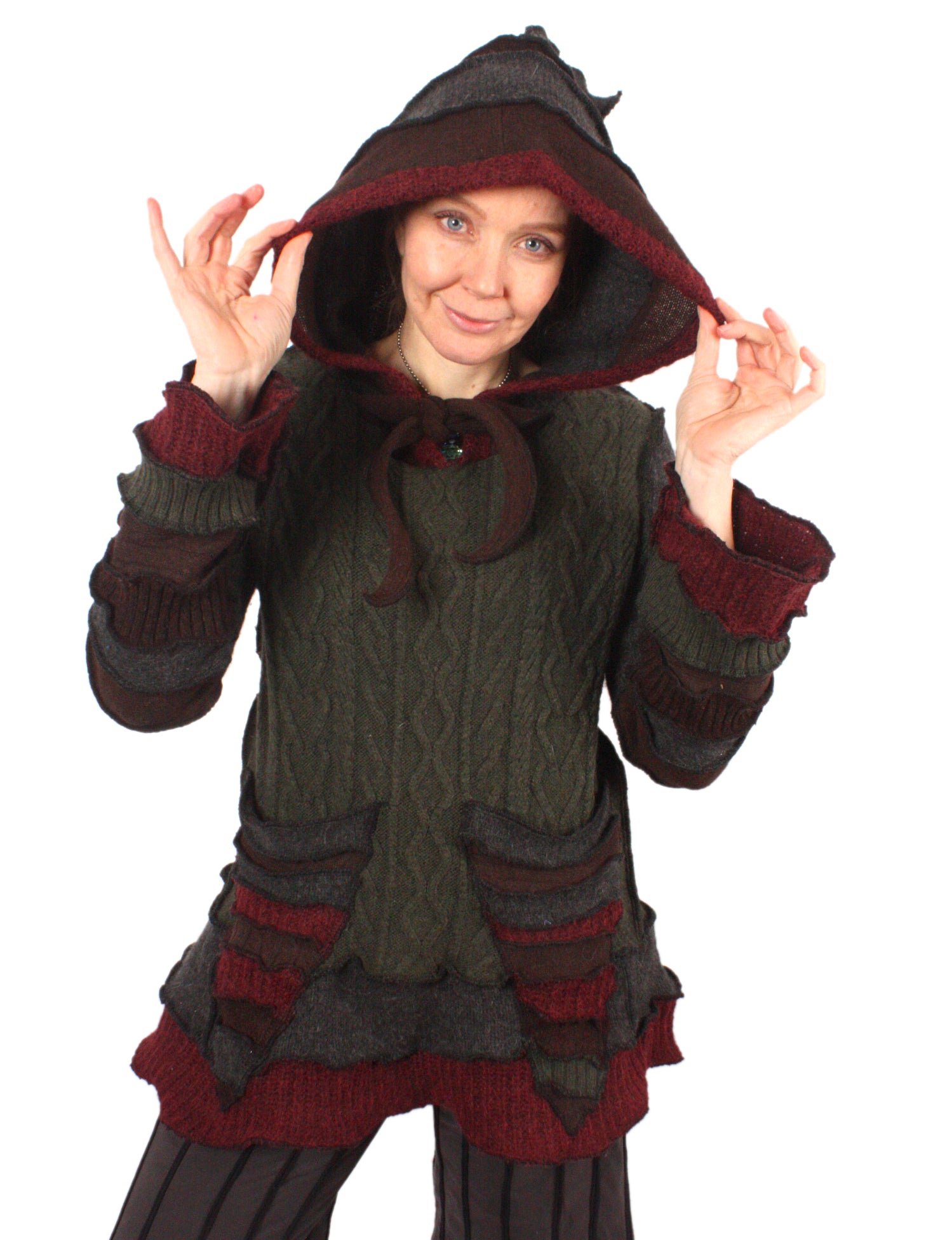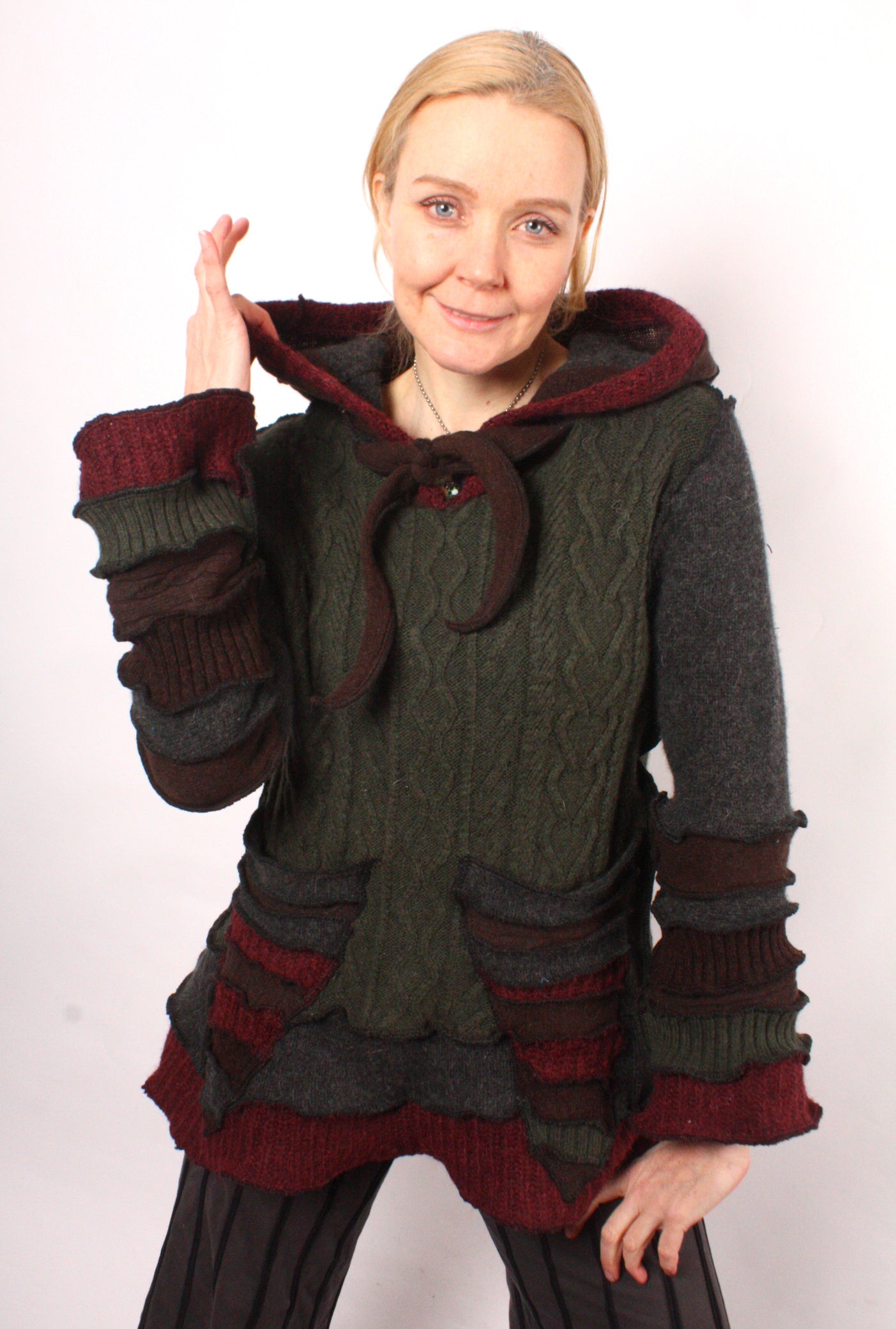 Each Katwise sweater is one-of-a-kind, sewn by me in my attic. They are perfectly imperfect, sometimes borderline wonky. They are all upcycled from sweaters I find in my vast thrift shopping expeditions. There is a huge variety in the texture and stretchiness of these knits, so no two are ever quite alike.