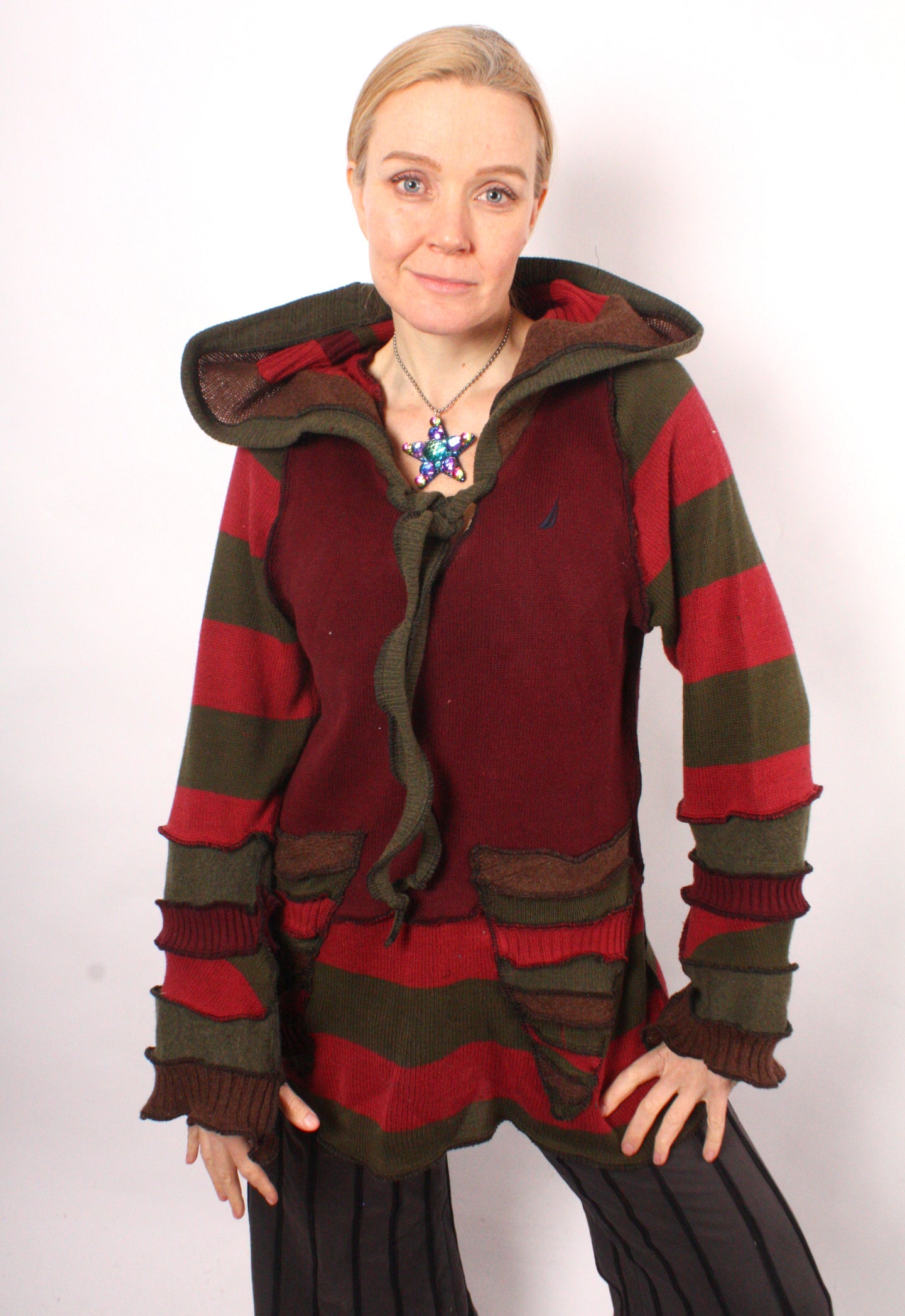 Each Katwise sweater is one-of-a-kind, sewn by me in my attic. They are perfectly imperfect, sometimes borderline wonky. They are all upcycled from sweaters I find in my vast thrift shopping expeditions. There is a huge variety in the texture and stretchiness of these knits, so no two are ever quite alike.