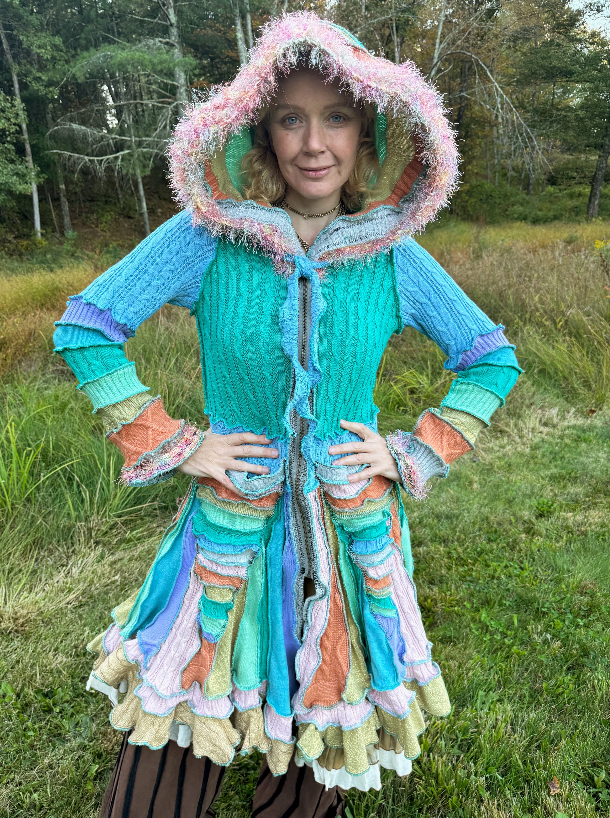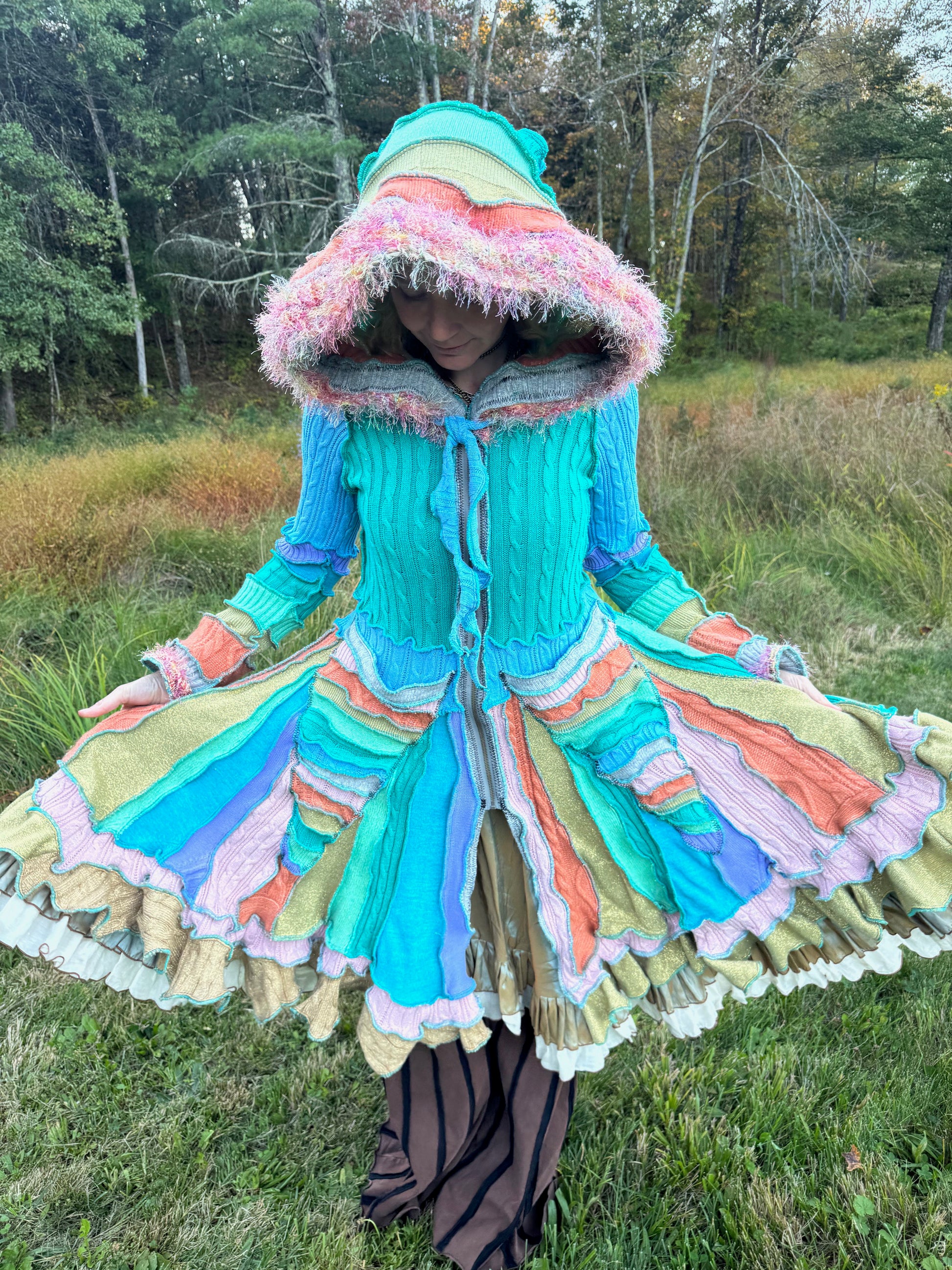 Terpsichore is a joyful pale rainbow coat made from mostly cotton. It's got fun Fraggle fringe and a zipper front.