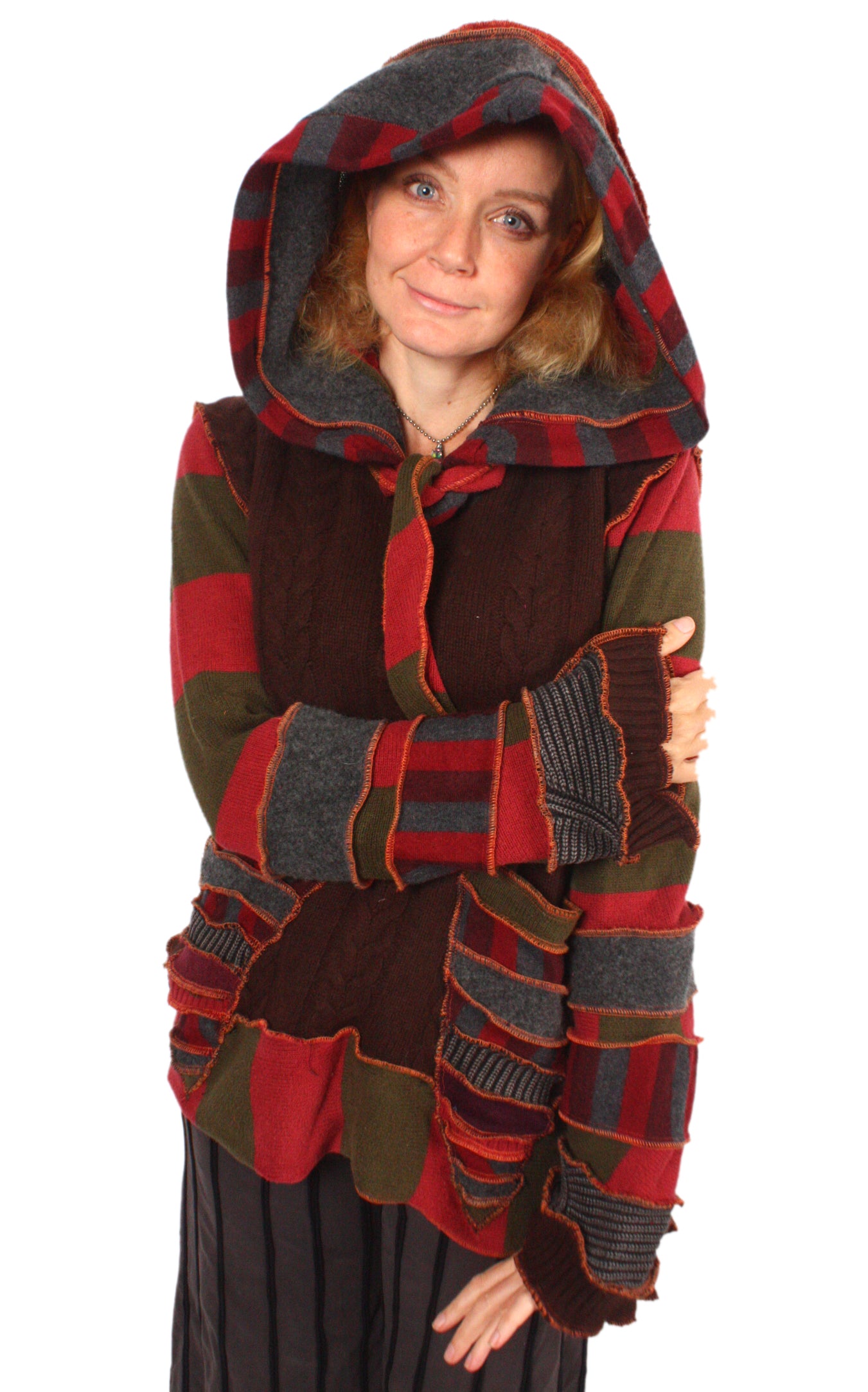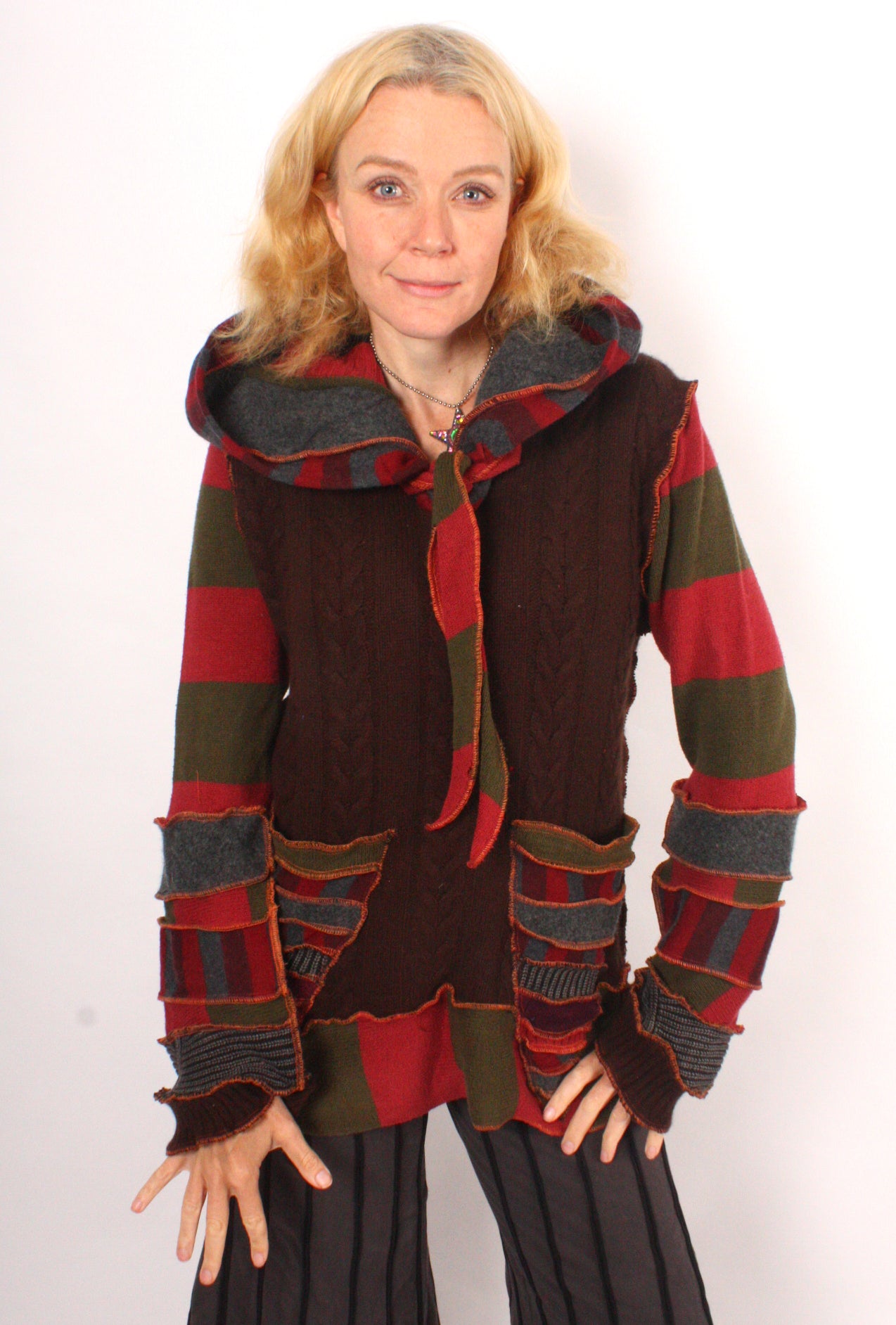 Each Katwise sweater is one-of-a-kind, sewn by me in my attic. They are perfectly imperfect, sometimes borderline wonky. They are all upcycled from sweaters I find in my vast thrift shopping expeditions. There is a huge variety in the texture and stretchiness of these knits, so no two are ever quite alike.