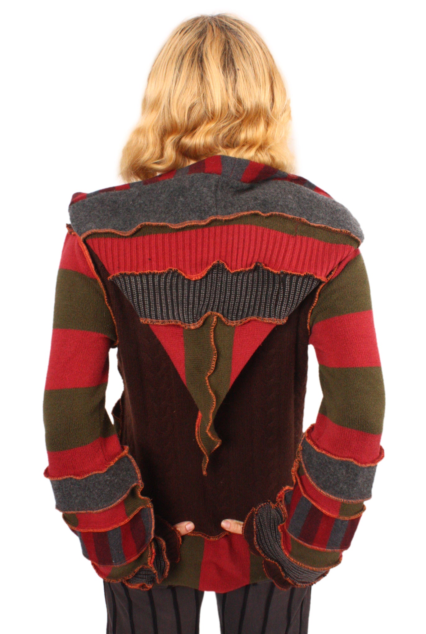 Weird Beard is a soft cashmere pullover with red and olive cotton stripes and rusty orange seams.