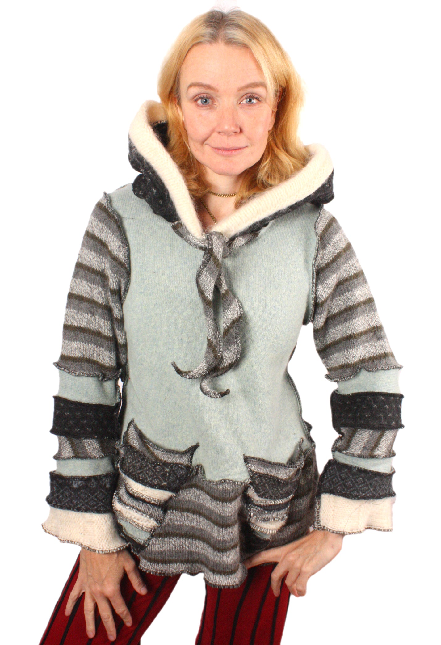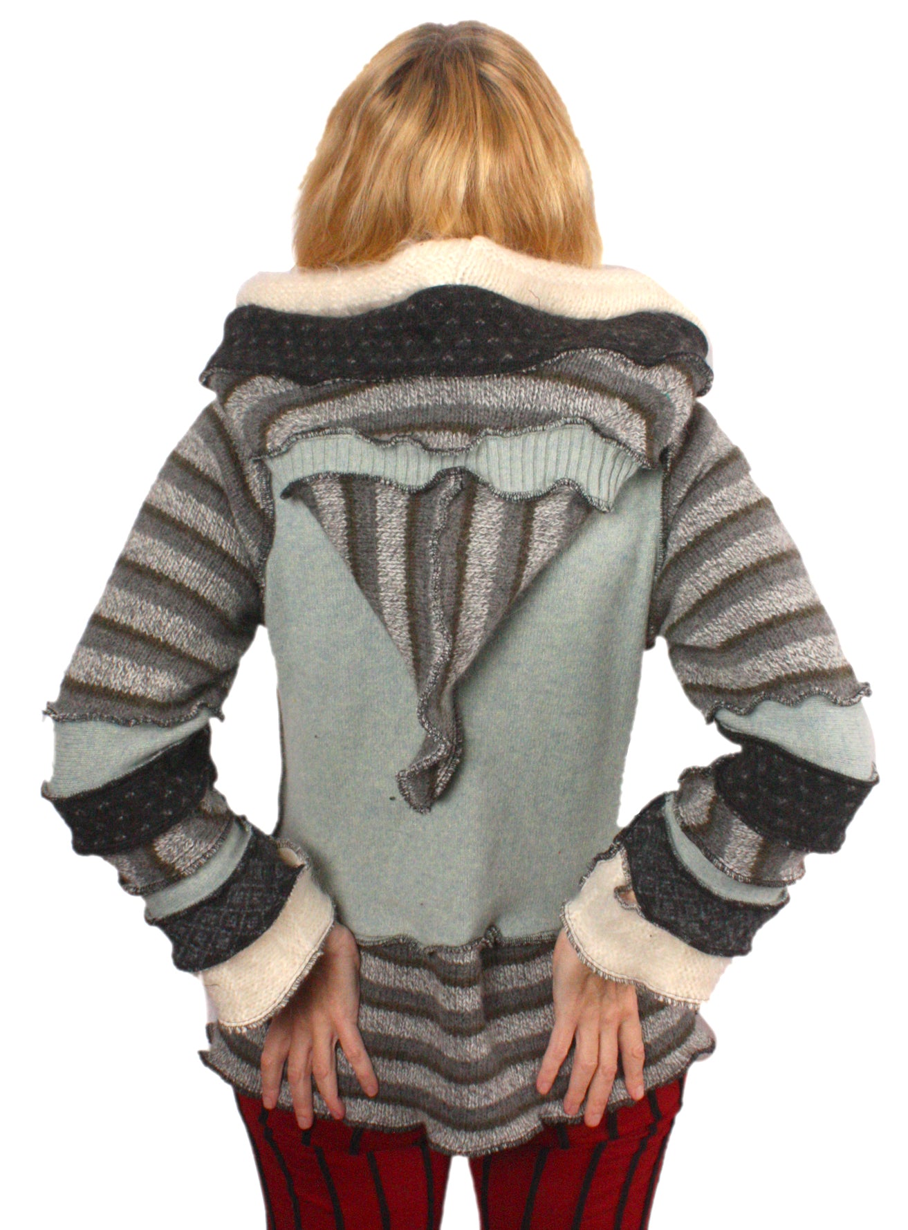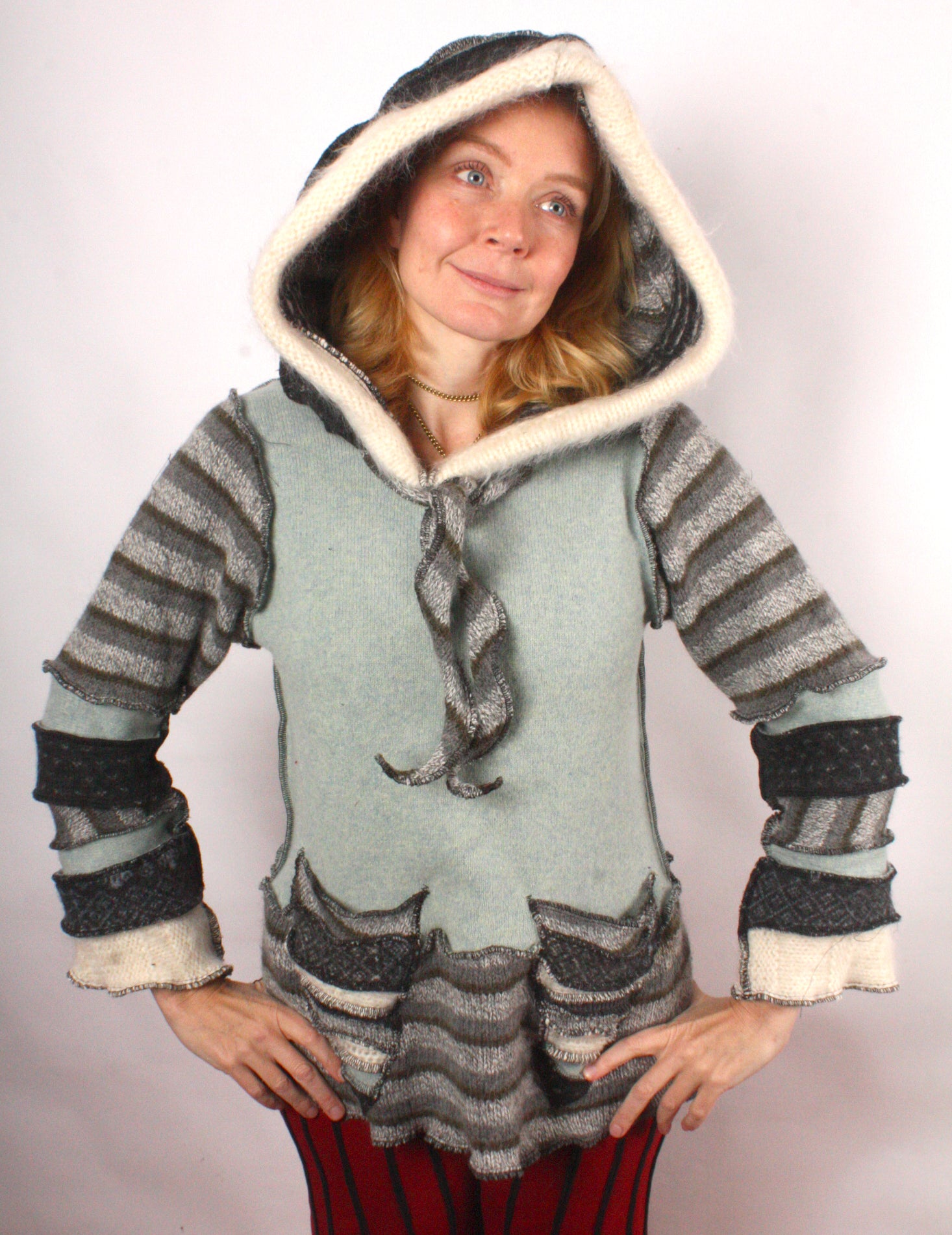 Each Katwise sweater is one-of-a-kind, sewn by me in my attic. They are perfectly imperfect, sometimes borderline wonky. They are all upcycled from sweaters I find in my vast thrift shopping expeditions. There is a huge variety in the texture and stretchiness of these knits, so no two are ever quite alike.