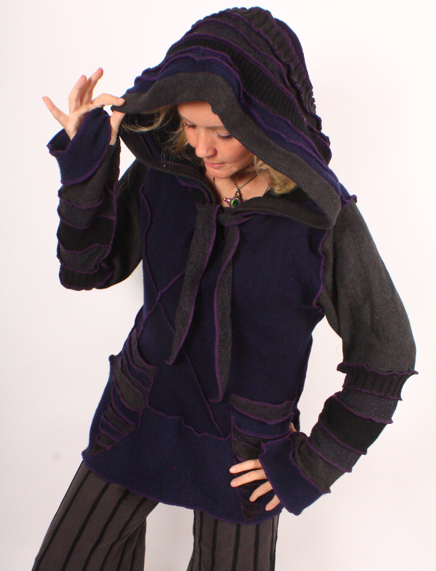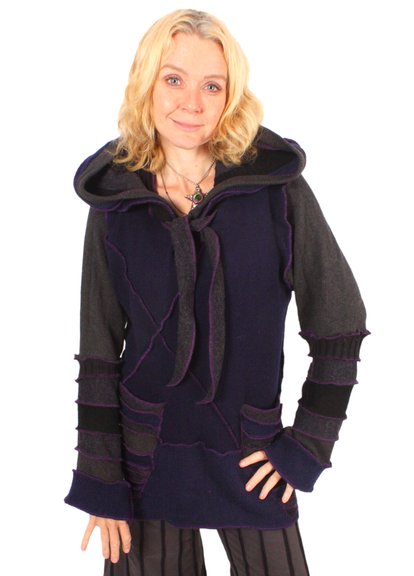 Wild Horse Jack is a midnight-blue and grey tunic made of lambswool with a touch of cotton and purple seams.