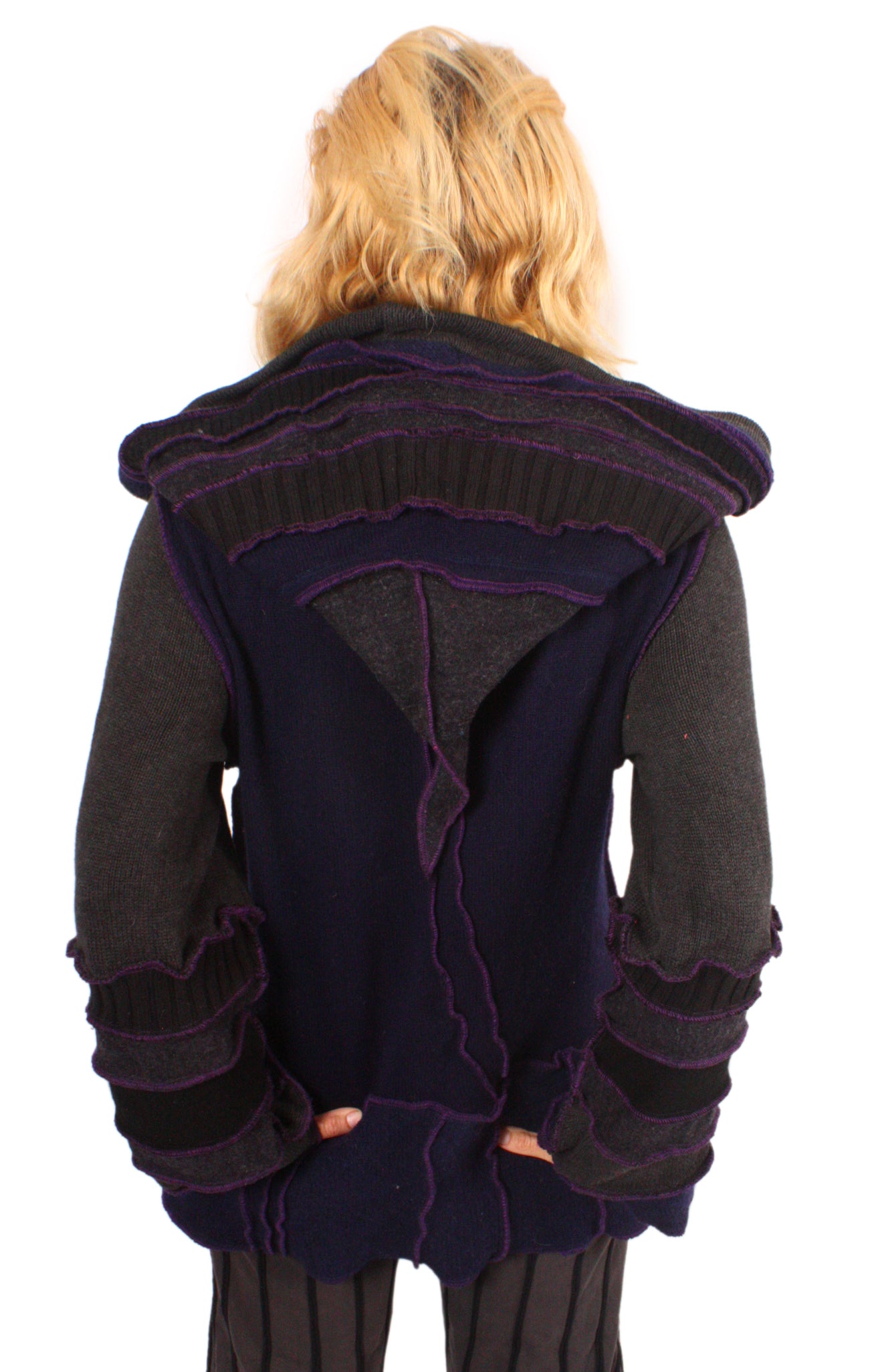 Each Katwise sweater is one-of-a-kind, sewn by me in my attic. They are perfectly imperfect, sometimes borderline wonky. They are all upcycled from sweaters I find in my vast thrift shopping expeditions. There is a huge variety in the texture and stretchiness of these knits, so no two are ever quite alike.
