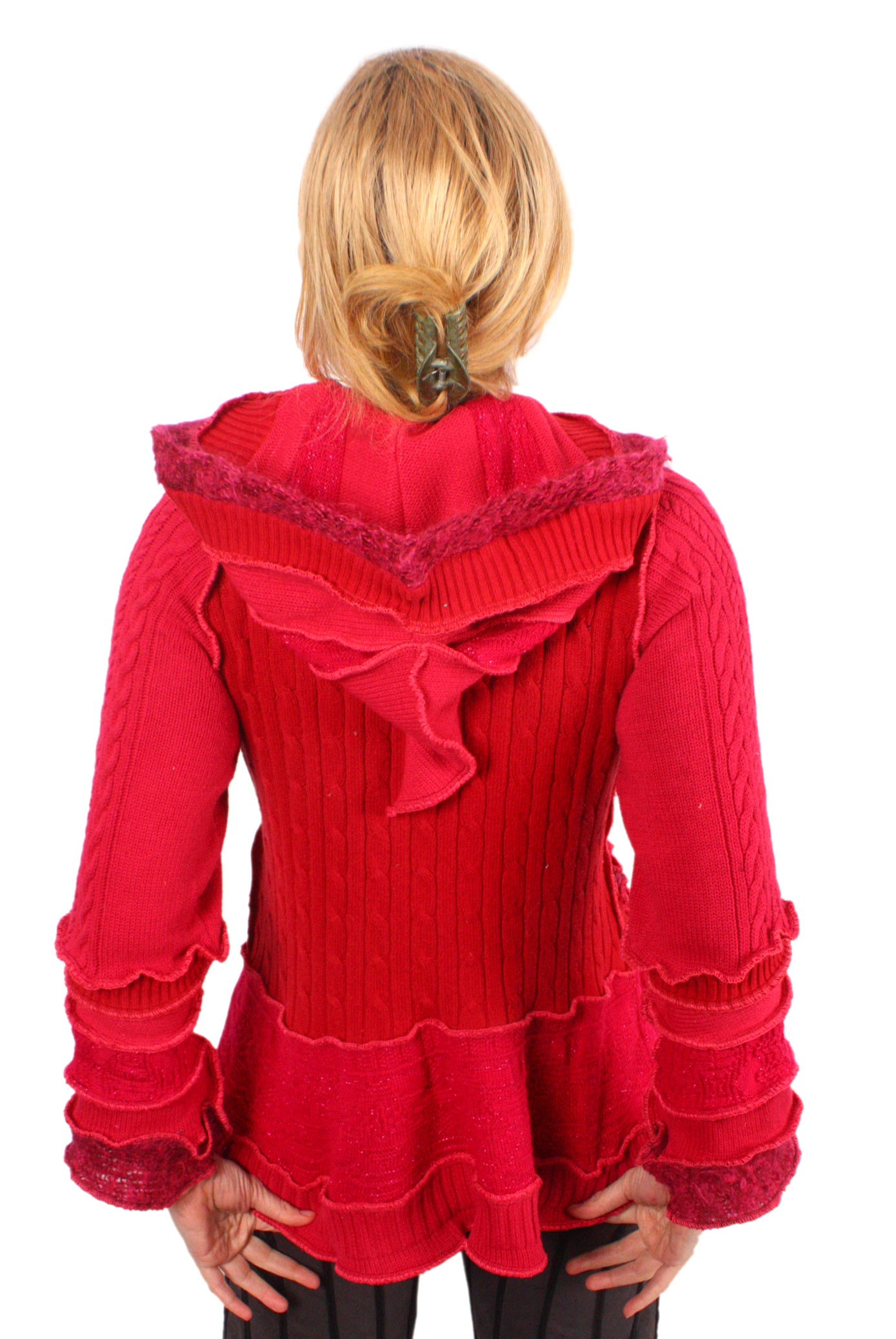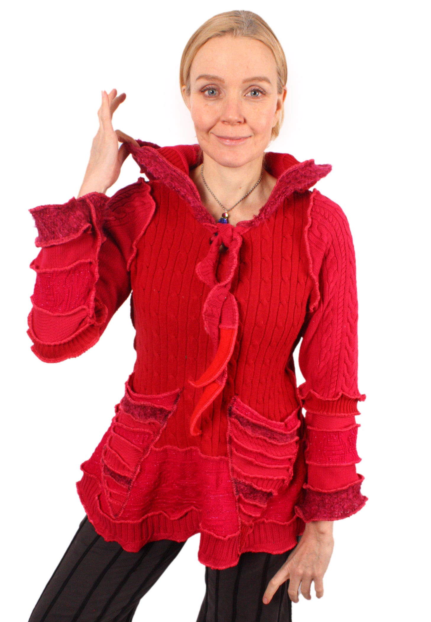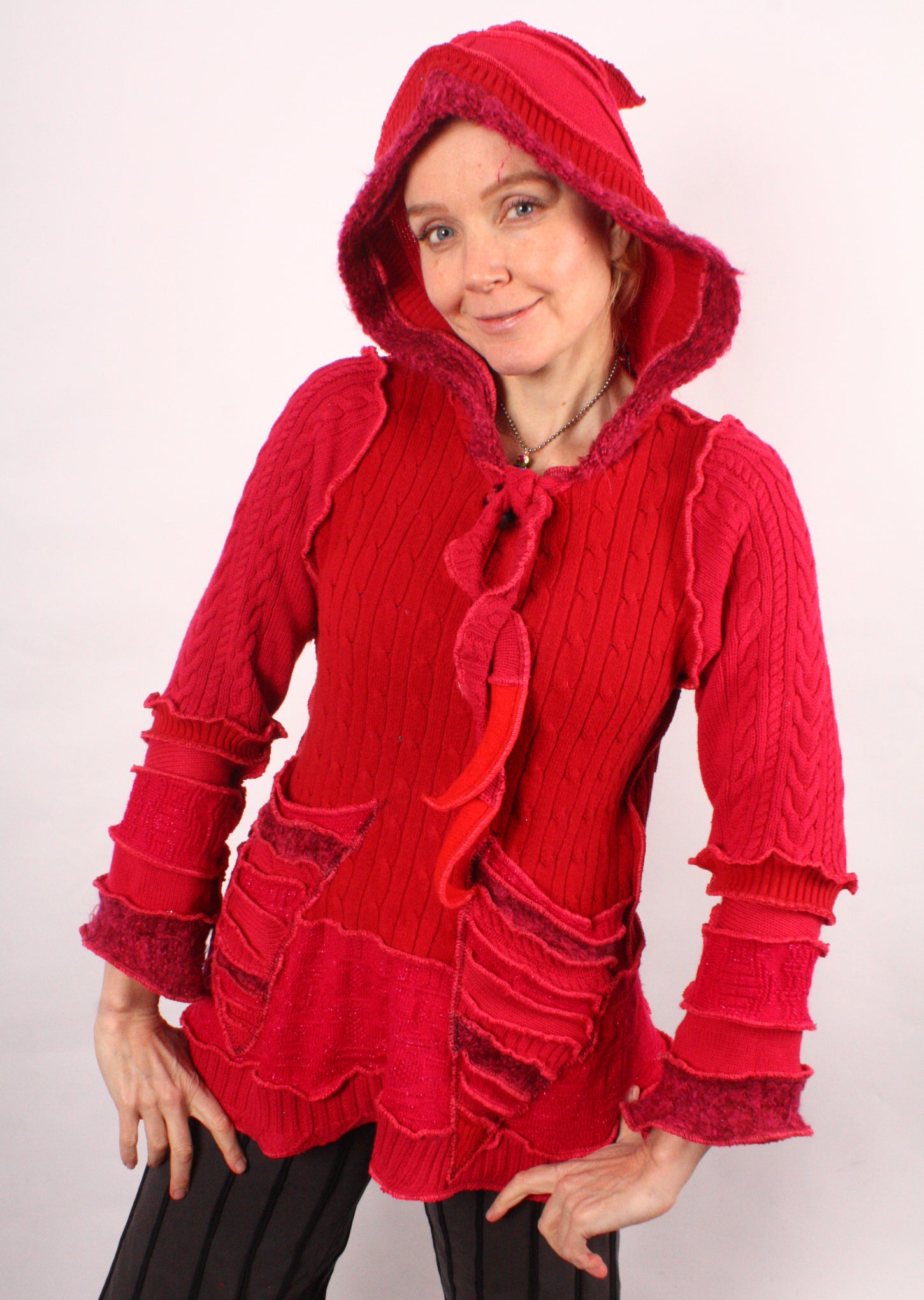 Each Katwise sweater is one-of-a-kind, sewn by me in my attic. They are perfectly imperfect, sometimes borderline wonky. They are all upcycled from sweaters I find in my vast thrift shopping expeditions. There is a huge variety in the texture and stretchiness of these knits, so no two are ever quite alike.