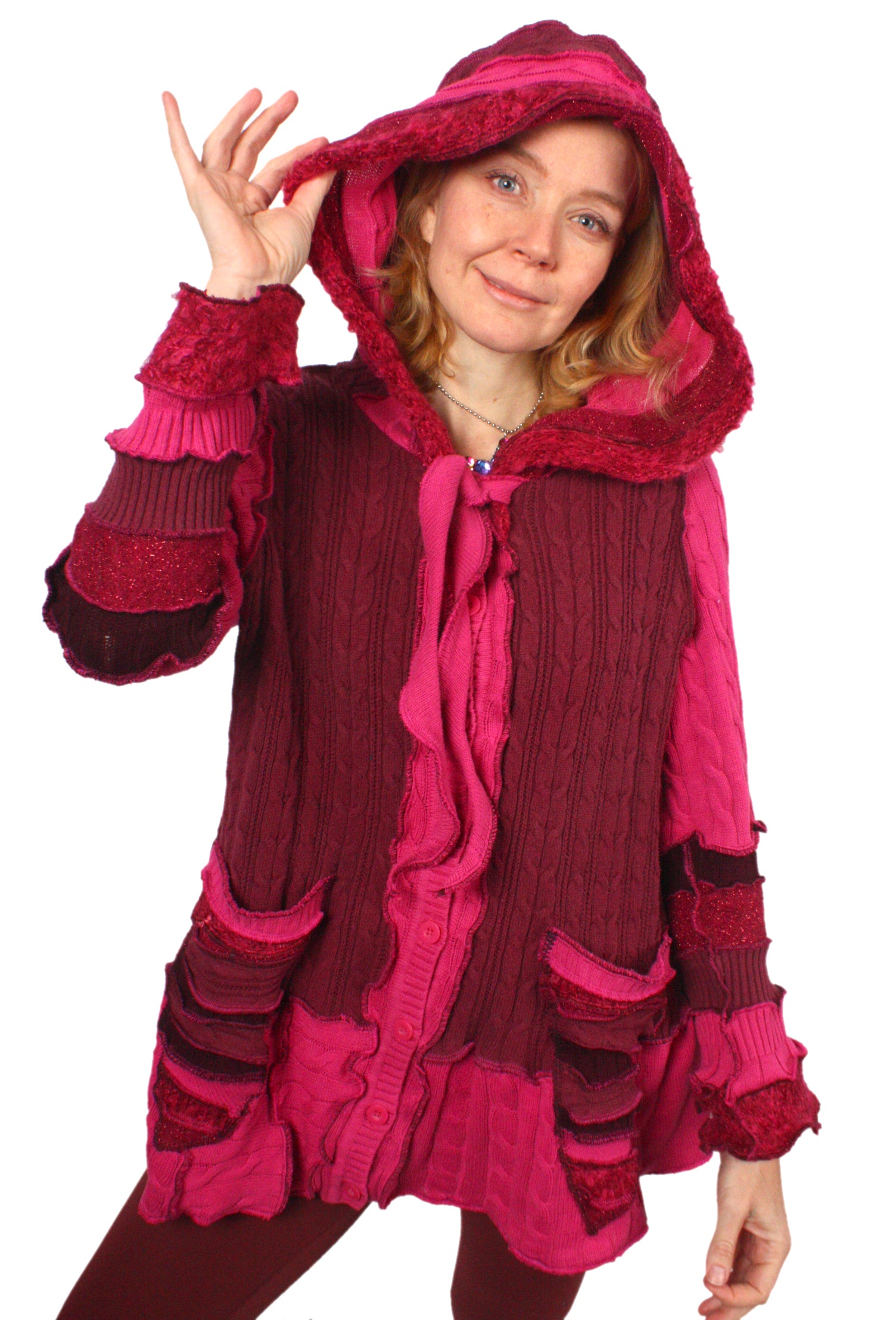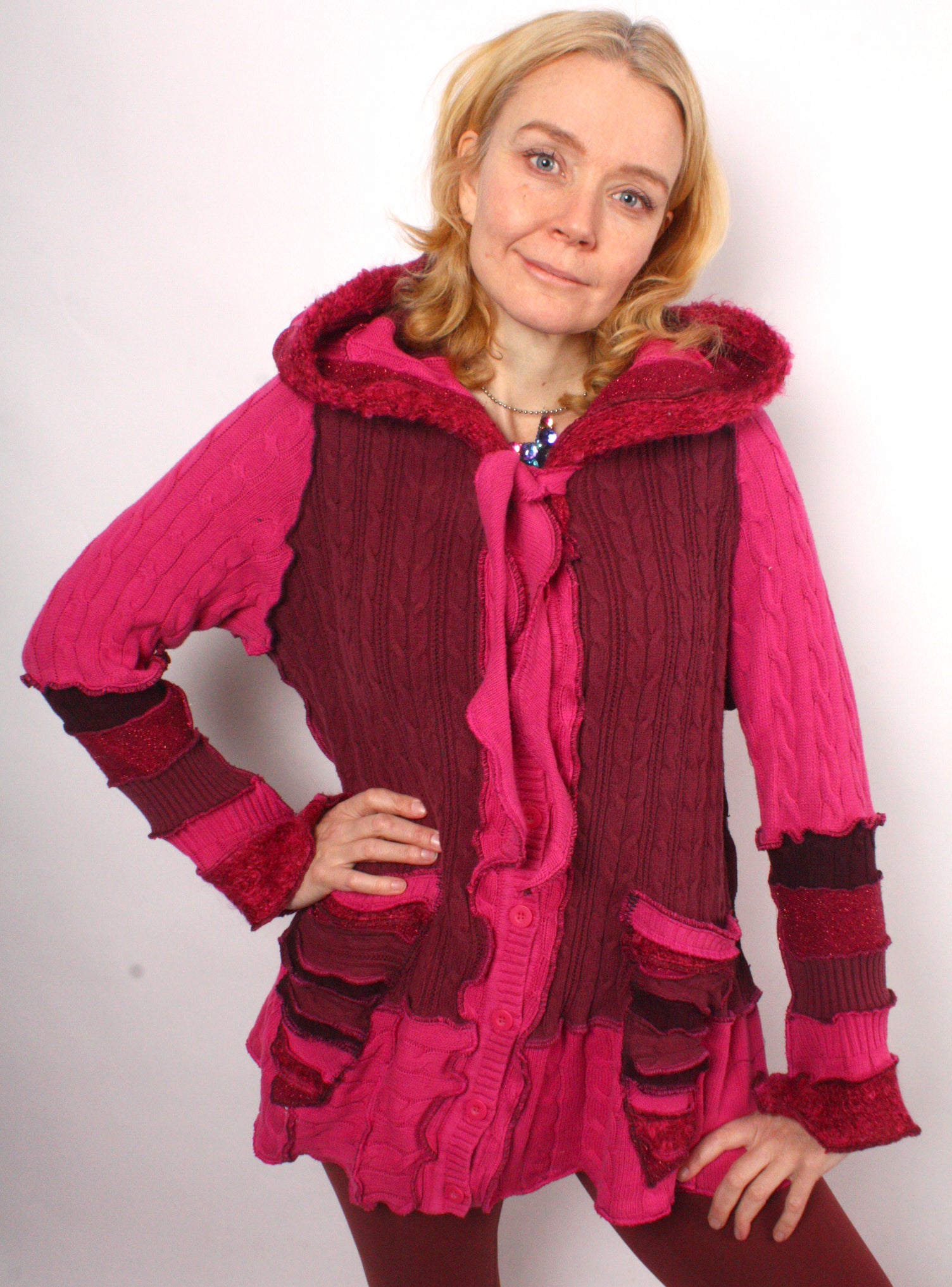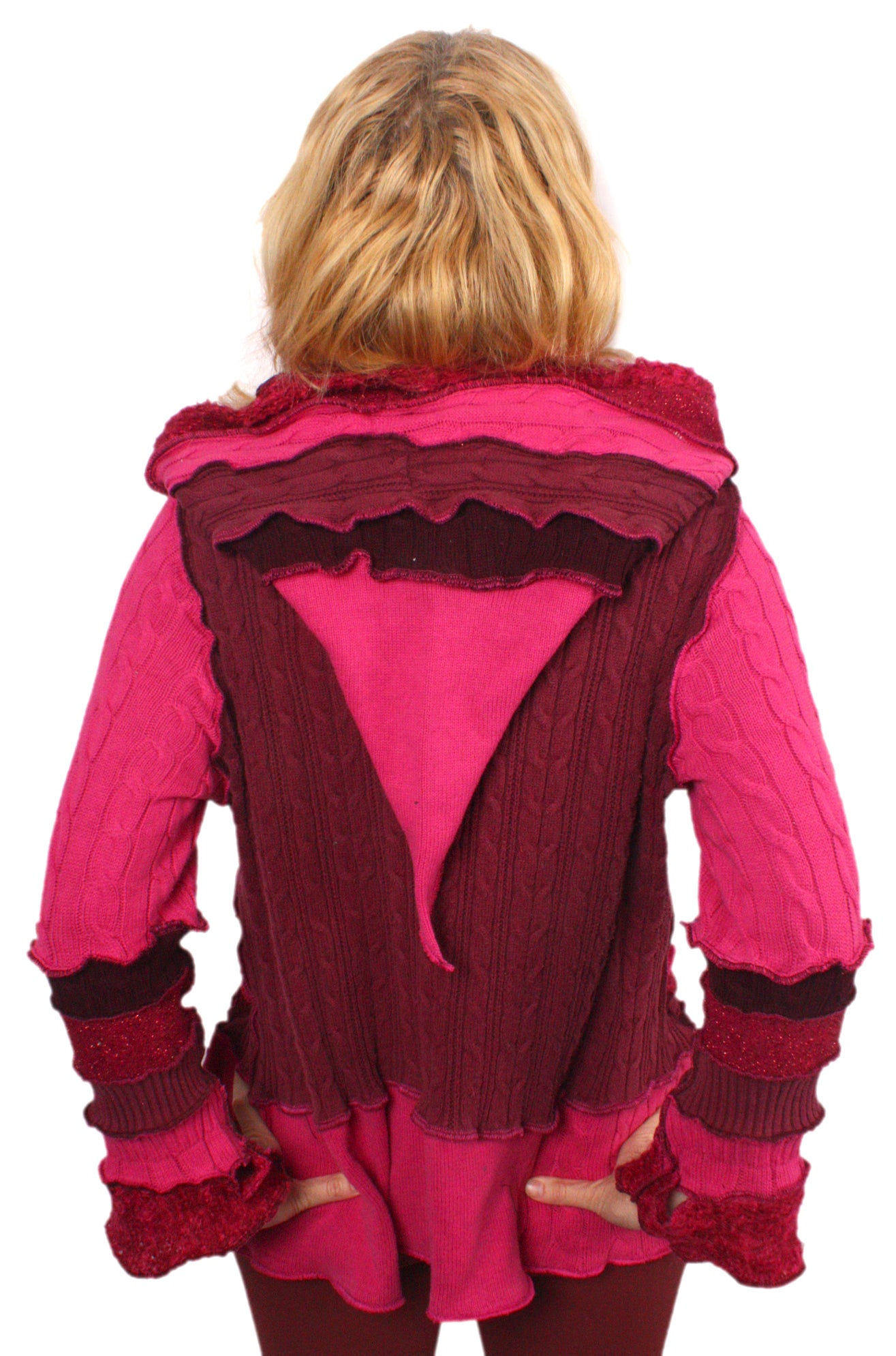 Each Katwise sweater is one-of-a-kind, sewn by me in my attic. They are perfectly imperfect, sometimes borderline wonky. They are all upcycled from sweaters I find in my vast thrift shopping expeditions. There is a huge variety in the texture and stretchiness of these knits, so no two are ever quite alike.