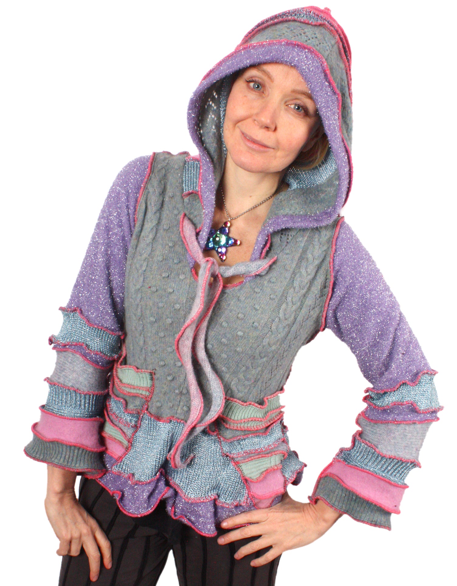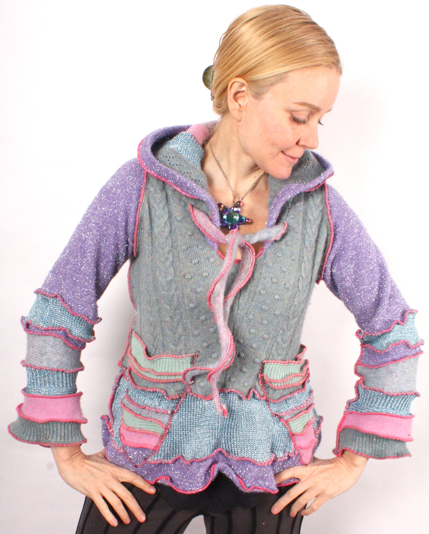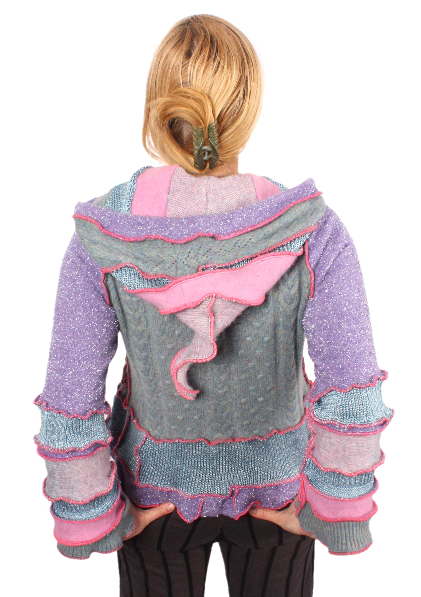 Each Katwise sweater is one-of-a-kind, sewn by me in my attic. They are perfectly imperfect, sometimes borderline wonky. They are all upcycled from sweaters I find in my vast thrift shopping expeditions. There is a huge variety in the texture and stretchiness of these knits, so no two are ever quite alike.