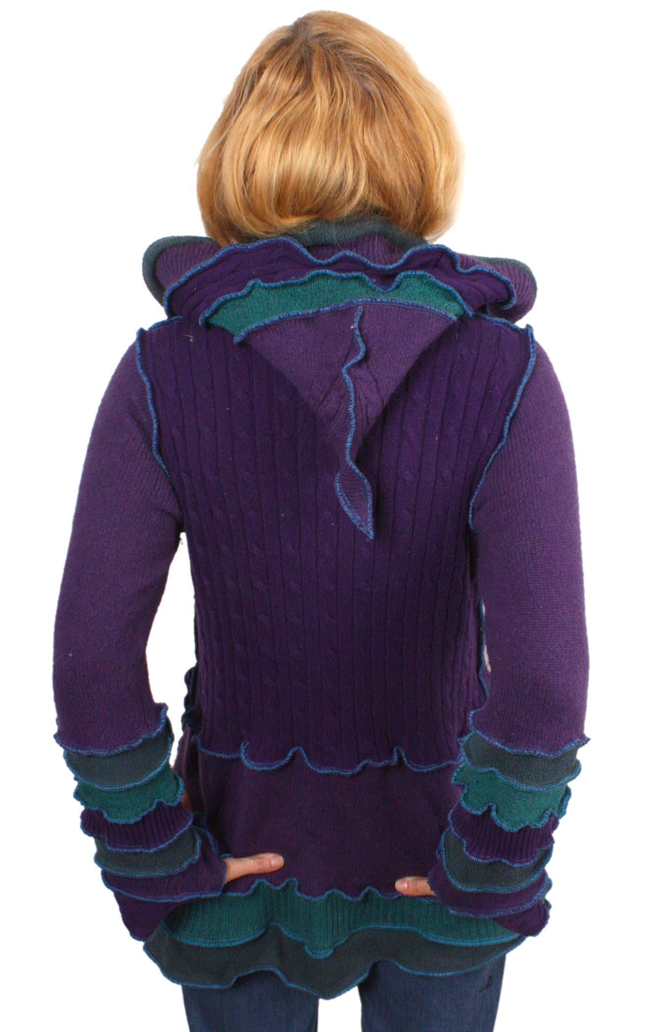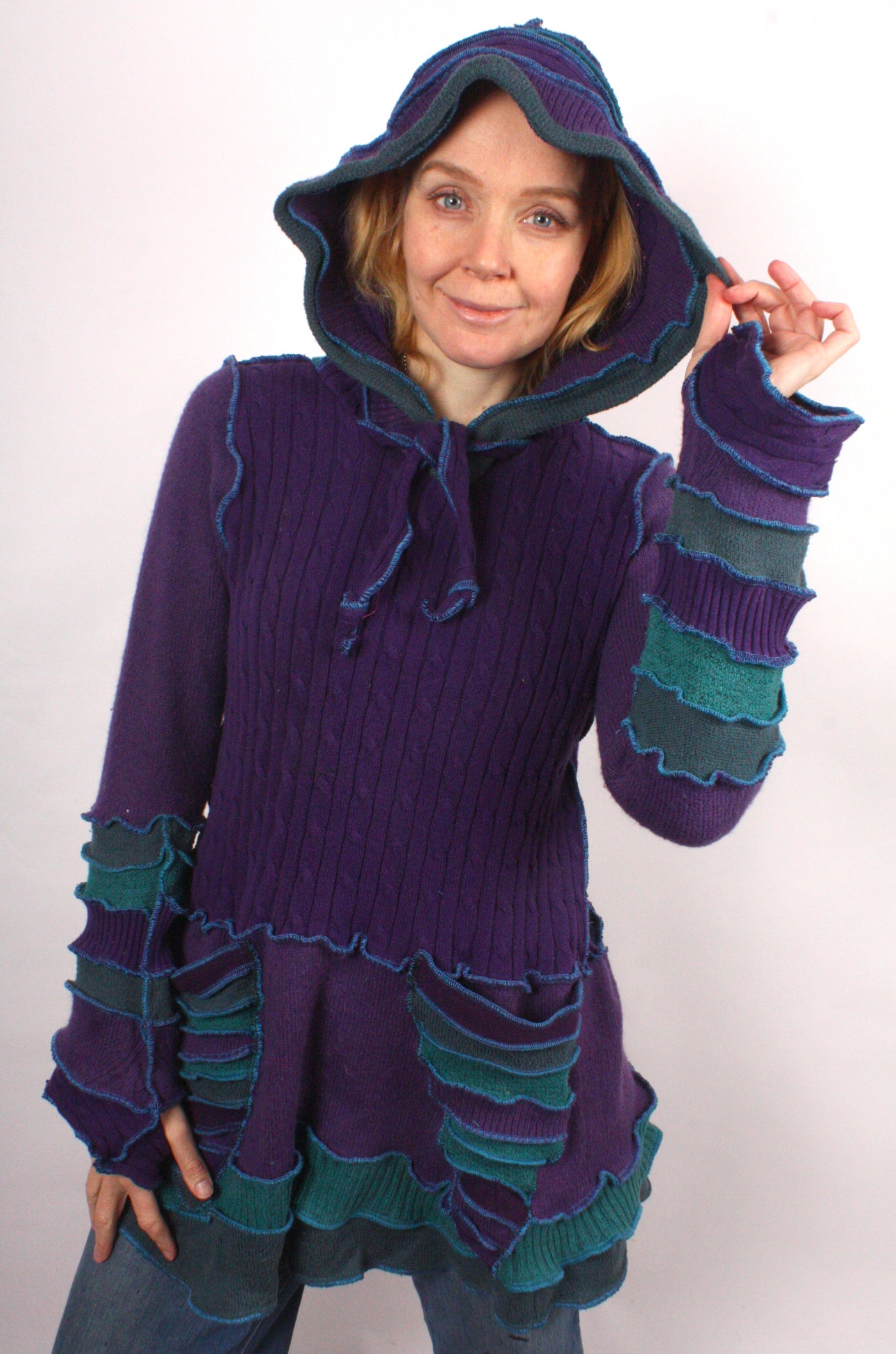 Each Katwise sweater is one-of-a-kind, sewn by me in my attic. They are perfectly imperfect, sometimes borderline wonky. They are all upcycled from sweaters I find in my vast thrift shopping expeditions. There is a huge variety in the texture and stretchiness of these knits, so no two are ever quite alike.