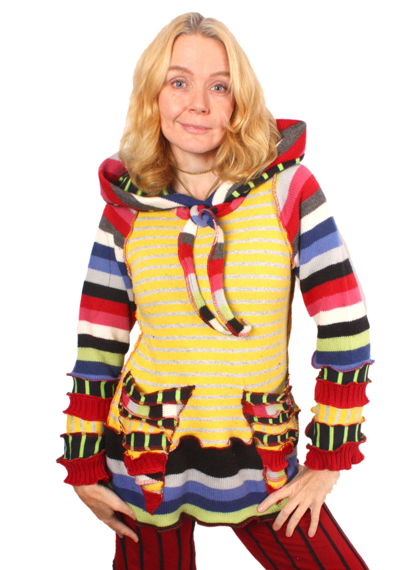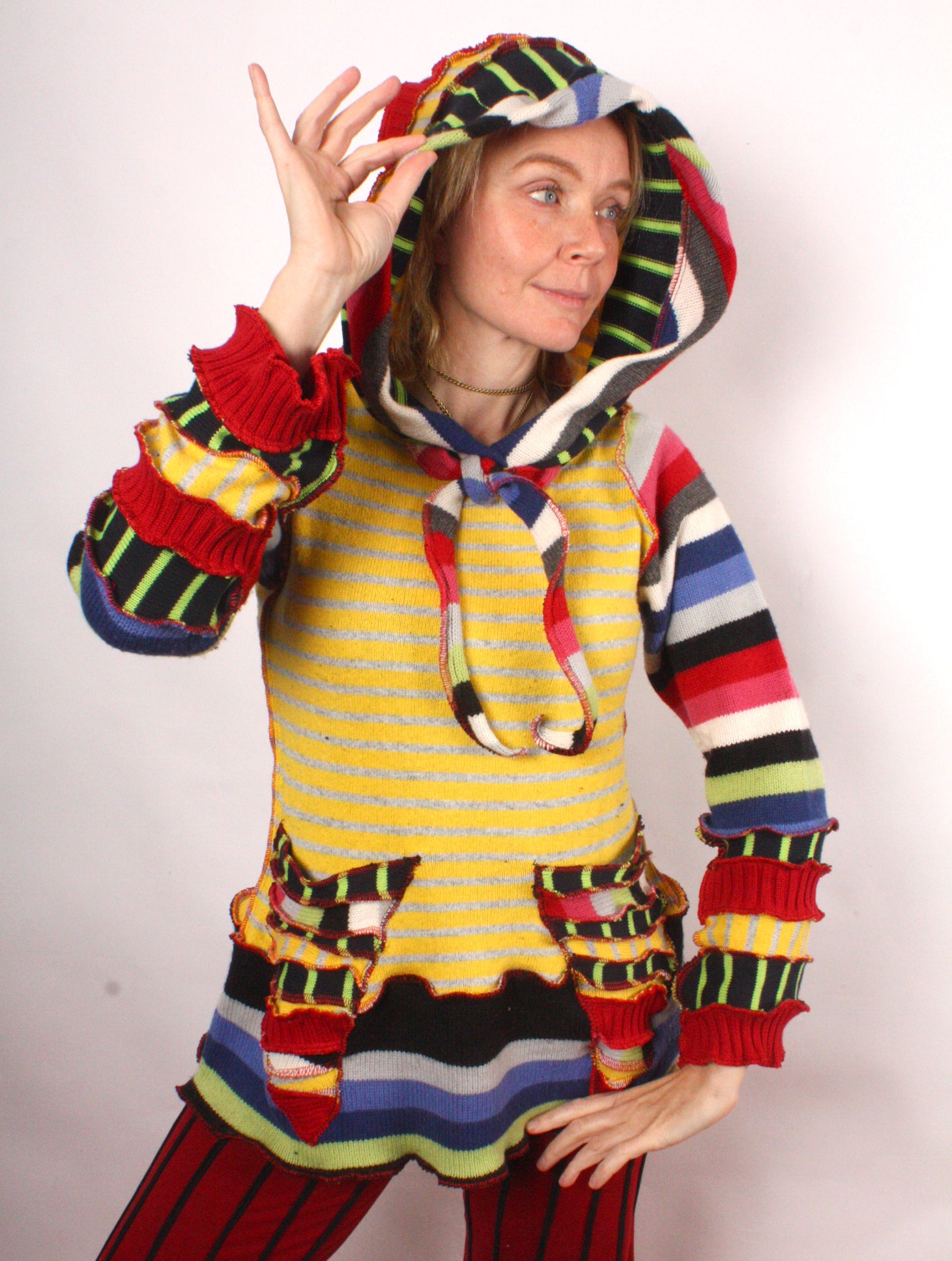 Each Katwise sweater is one-of-a-kind, sewn by me in my attic. They are perfectly imperfect, sometimes borderline wonky. They are all upcycled from sweaters I find in my vast thrift shopping expeditions. There is a huge variety in the texture and stretchiness of these knits, so no two are ever quite alike.