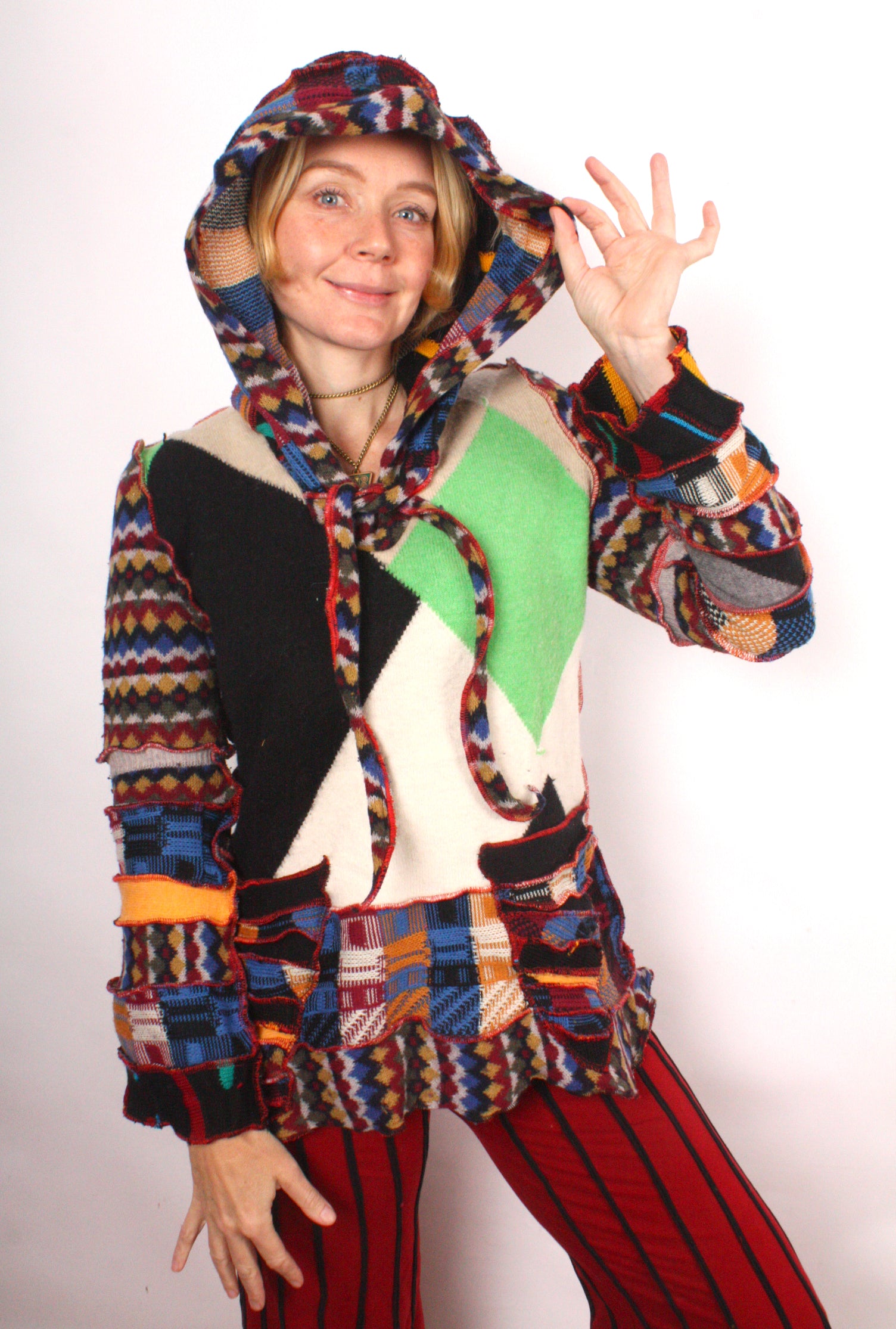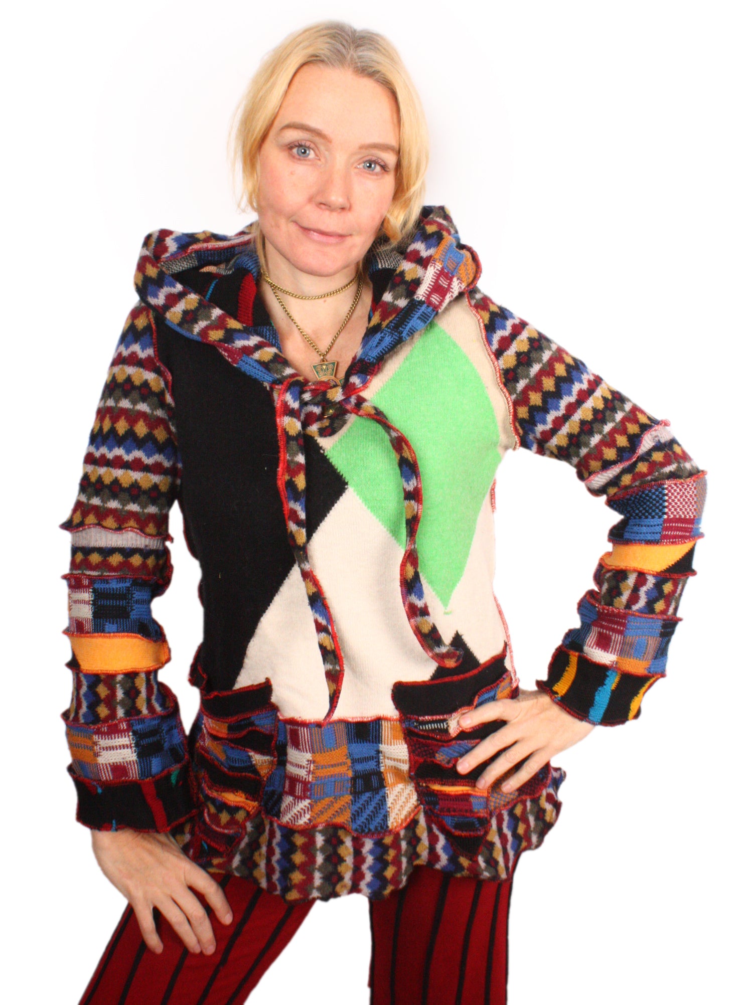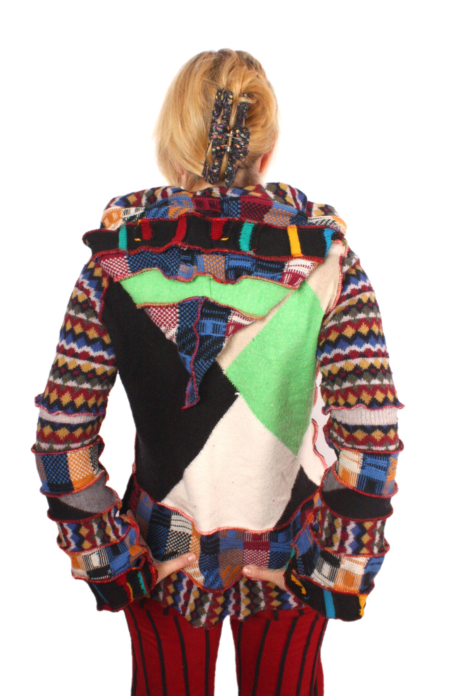 Each Katwise sweater is one-of-a-kind, sewn by me in my attic. They are perfectly imperfect, sometimes borderline wonky. They are all upcycled from sweaters I find in my vast thrift shopping expeditions. There is a huge variety in the texture and stretchiness of these knits, so no two are ever quite alike.