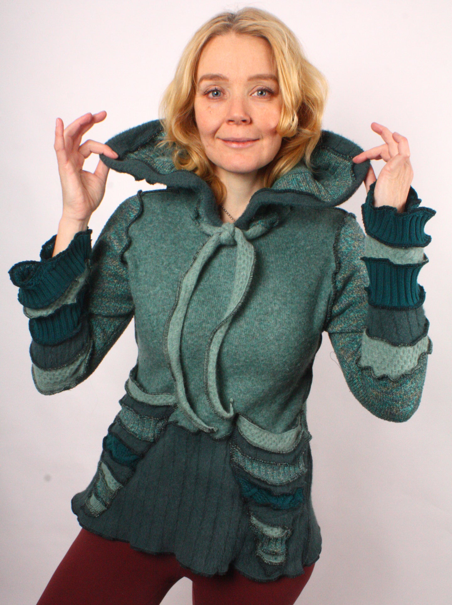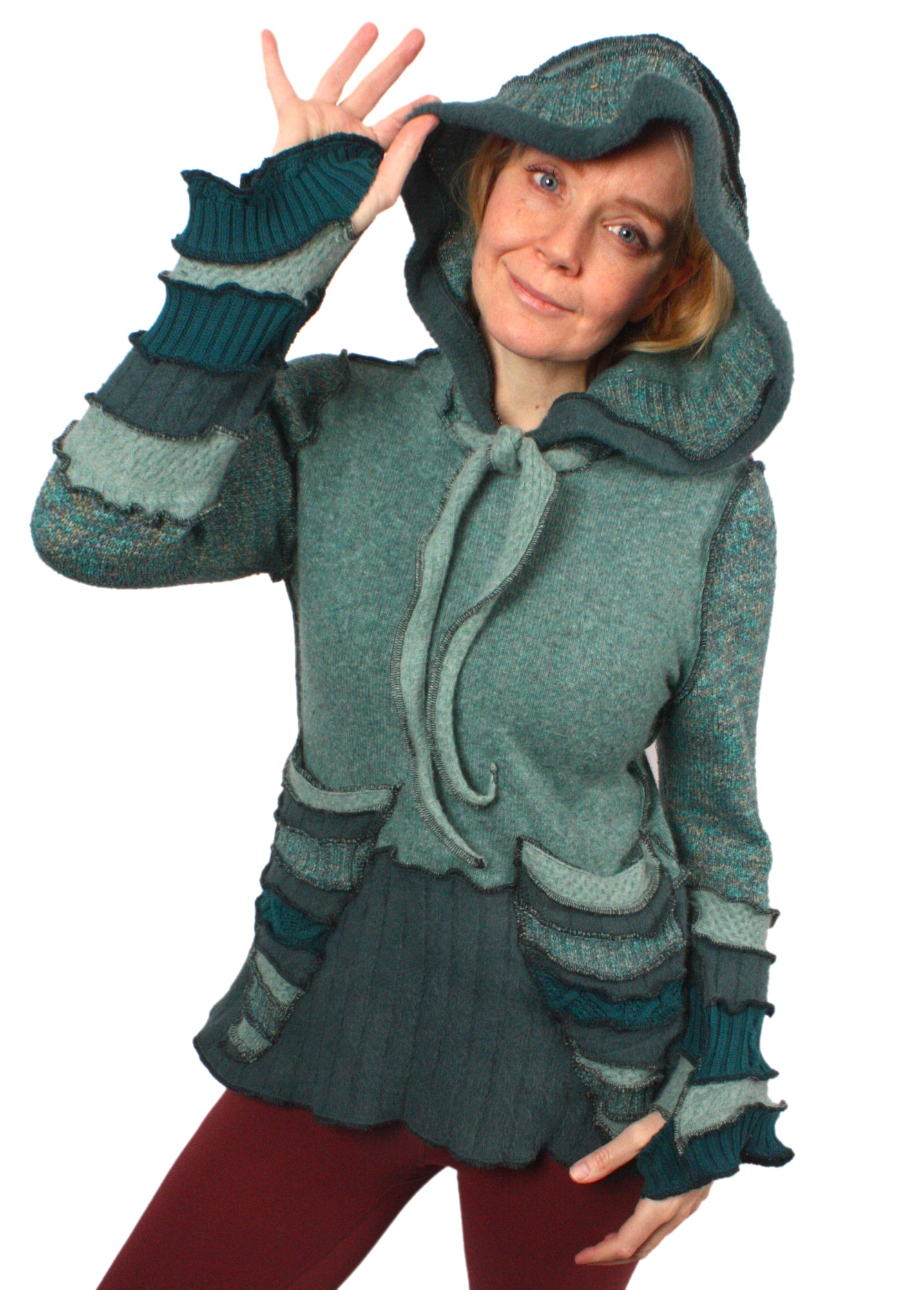 Each Katwise sweater is one-of-a-kind, sewn by me in my attic. They are perfectly imperfect, sometimes borderline wonky. They are all upcycled from sweaters I find in my vast thrift shopping expeditions. There is a huge variety in the texture and stretchiness of these knits, so no two are ever quite alike.