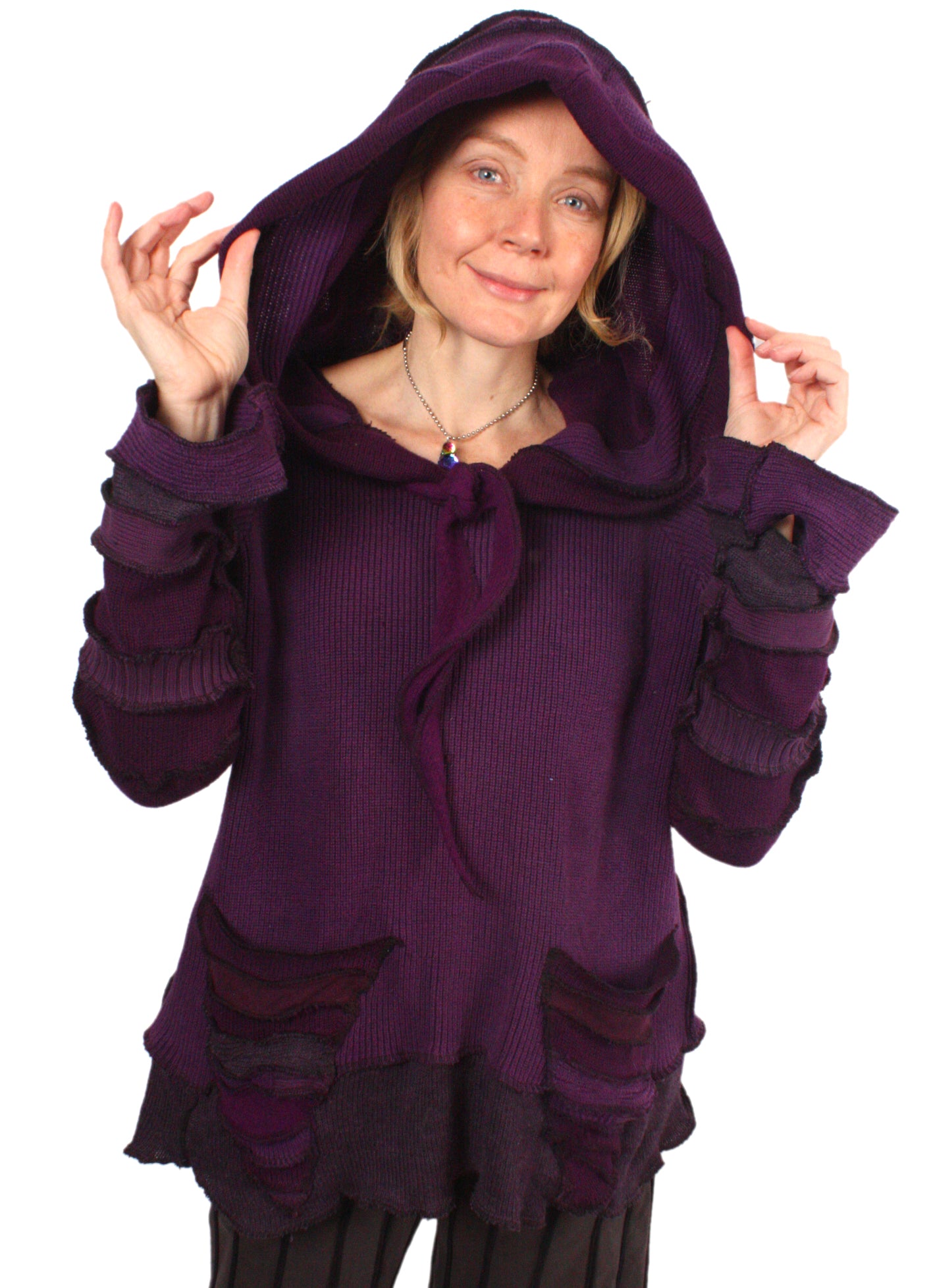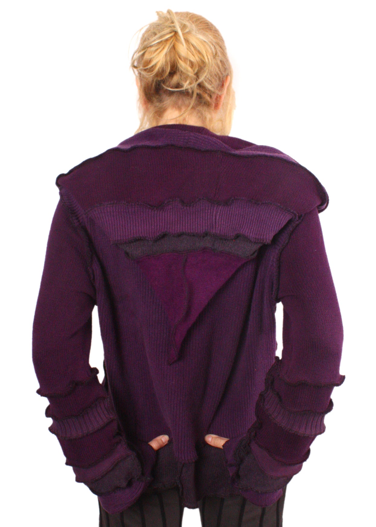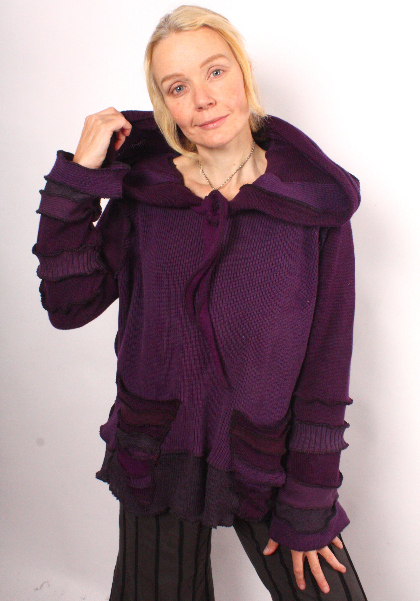 Mountain Holly is a proud purple pullover with graphic black seams. It's almost all cotton with just a touch of lambswool.