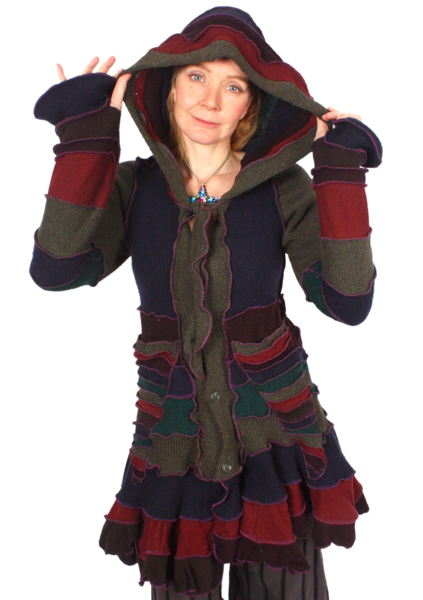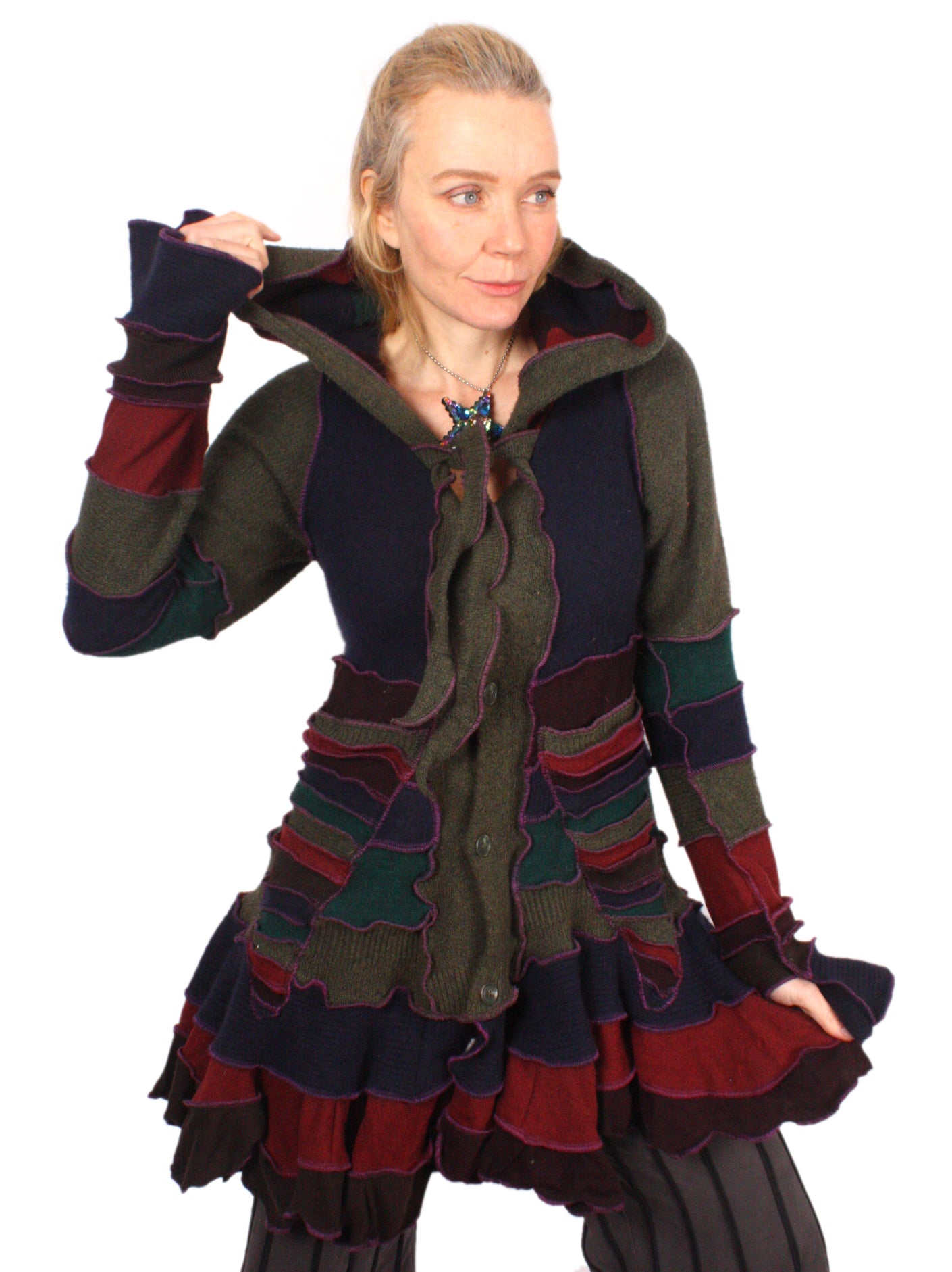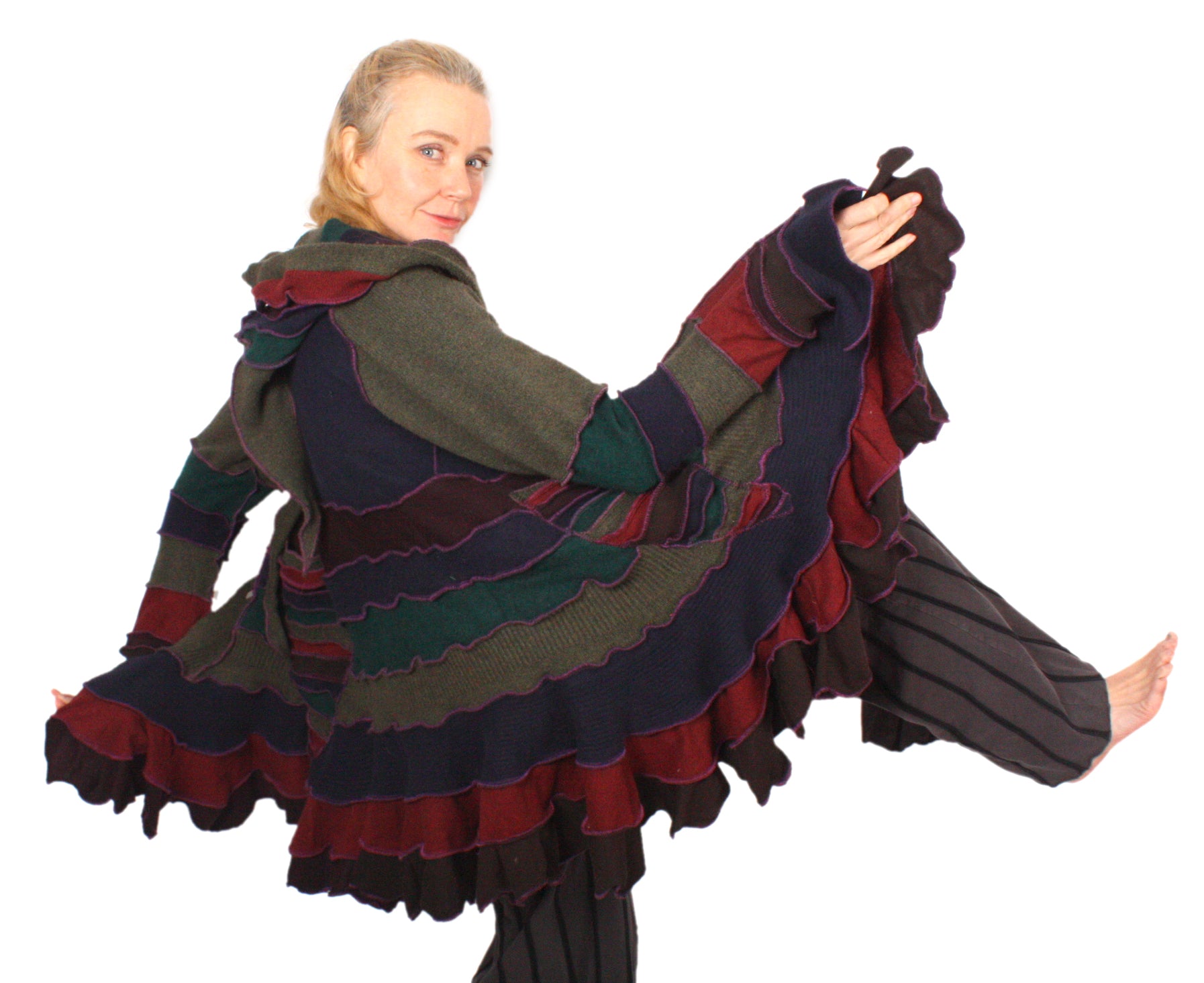 Flouncy Coats are fun and twirly with lots of bouncy ruffles. I use lots of lightweight soft stretchy knits that make these very comfy and easy to wear, while still being extravagantly cheerful.