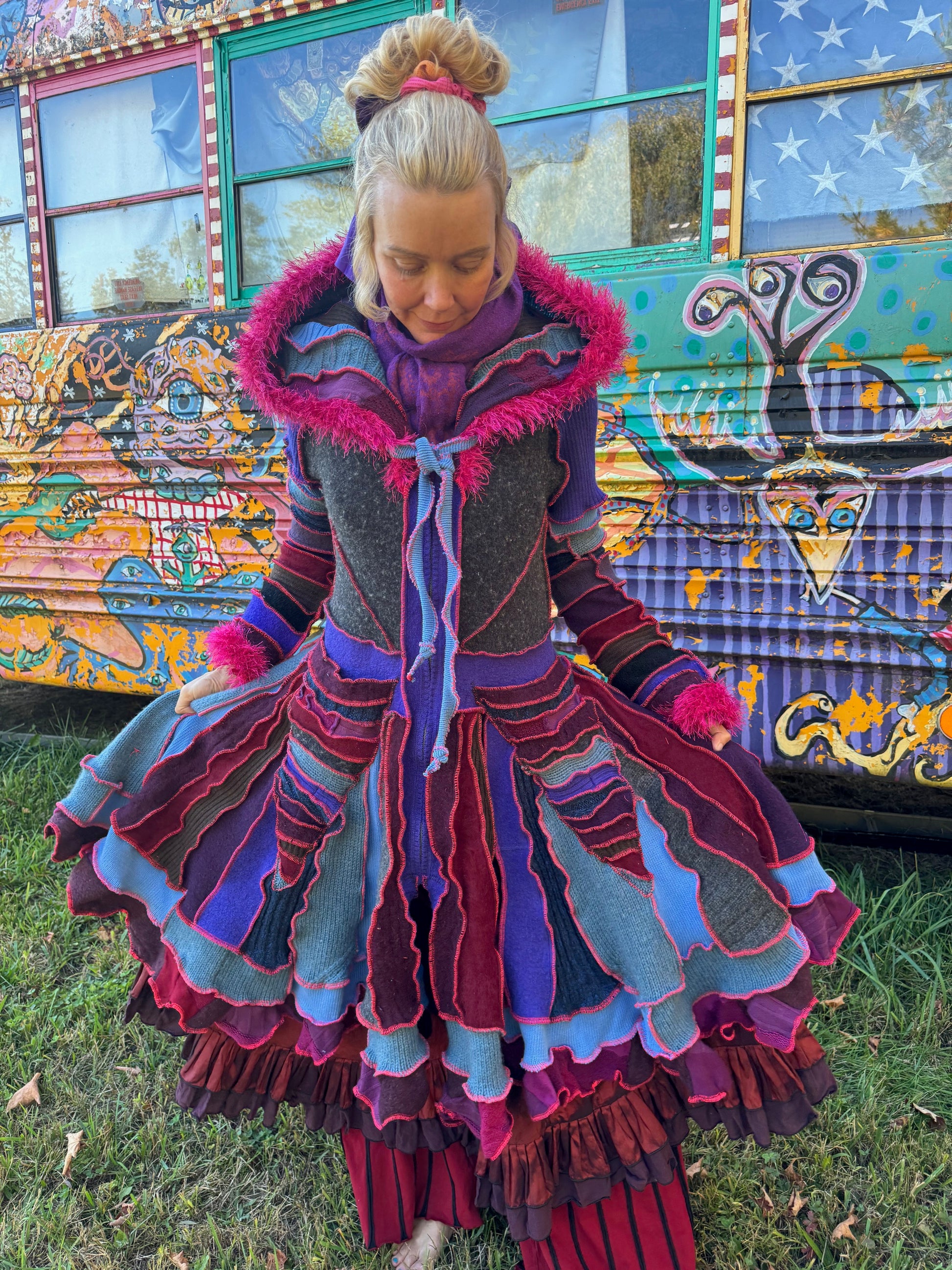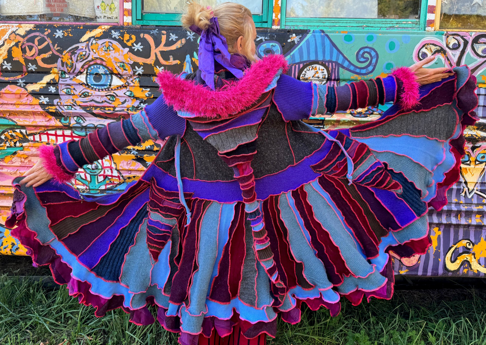 Each Katwise sweater is one-of-a-kind, sewn by me in my attic. They are perfectly imperfect, sometimes borderline wonky. They are all upcycled from sweaters I find in my vast thrift shopping expeditions. There is a huge variety in the texture and stretchiness of these knits, so no two are ever quite alike.
