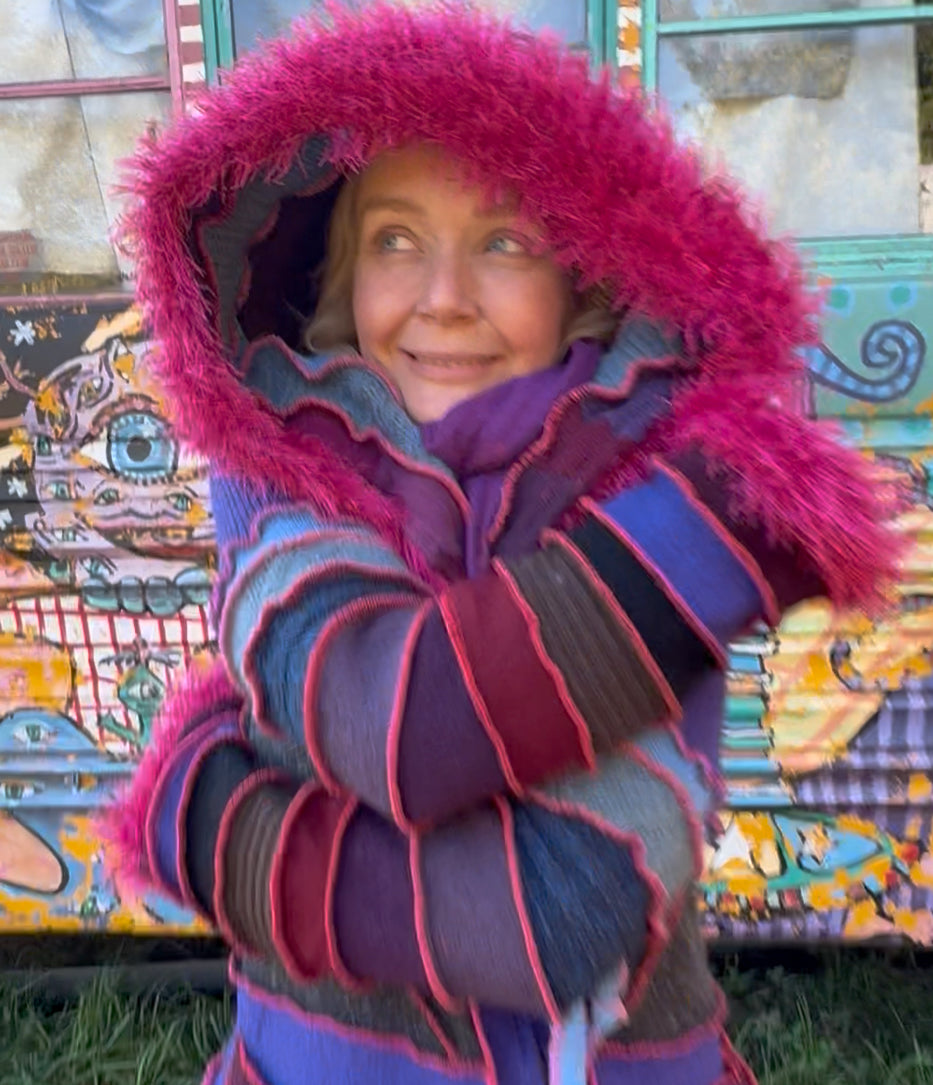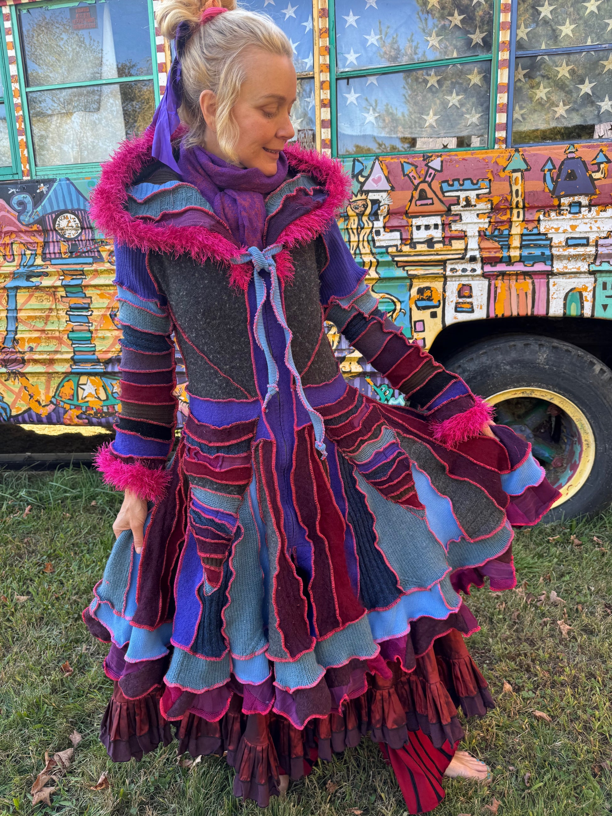 Thalia is a spiral of gorgeous gentleness, on a a sky of blue, electrified with neon pink seams and vibrant fuchsia. It's full of laughter and Fraggle fringe and has a zipper front.