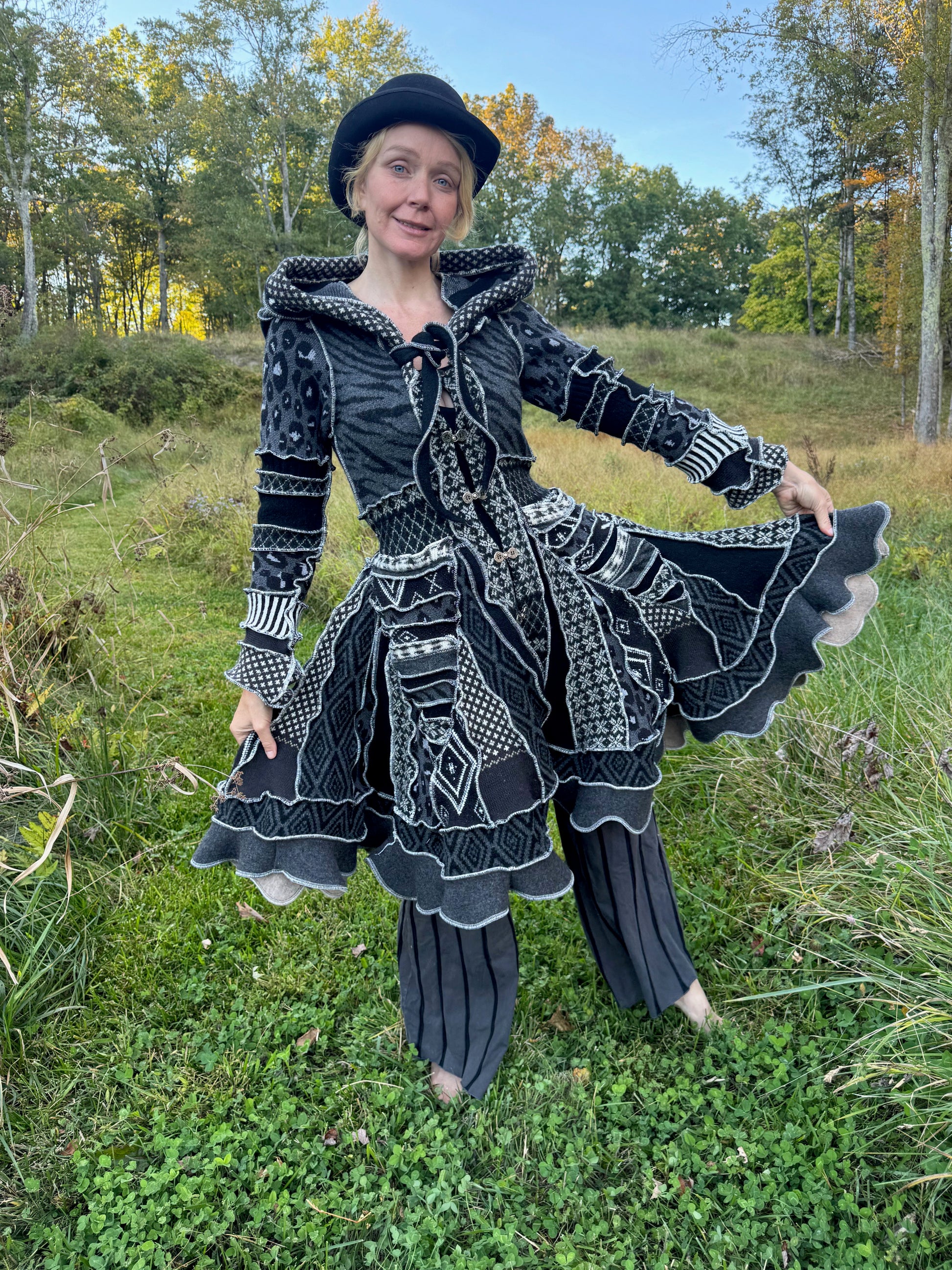 Each Katwise sweater is one-of-a-kind, sewn by me in my attic. They are perfectly imperfect, sometimes borderline wonky. They are all upcycled from sweaters I find in my vast thrift shopping expeditions. There is a huge variety in the texture and stretchiness of these knits, so no two are ever quite alike.