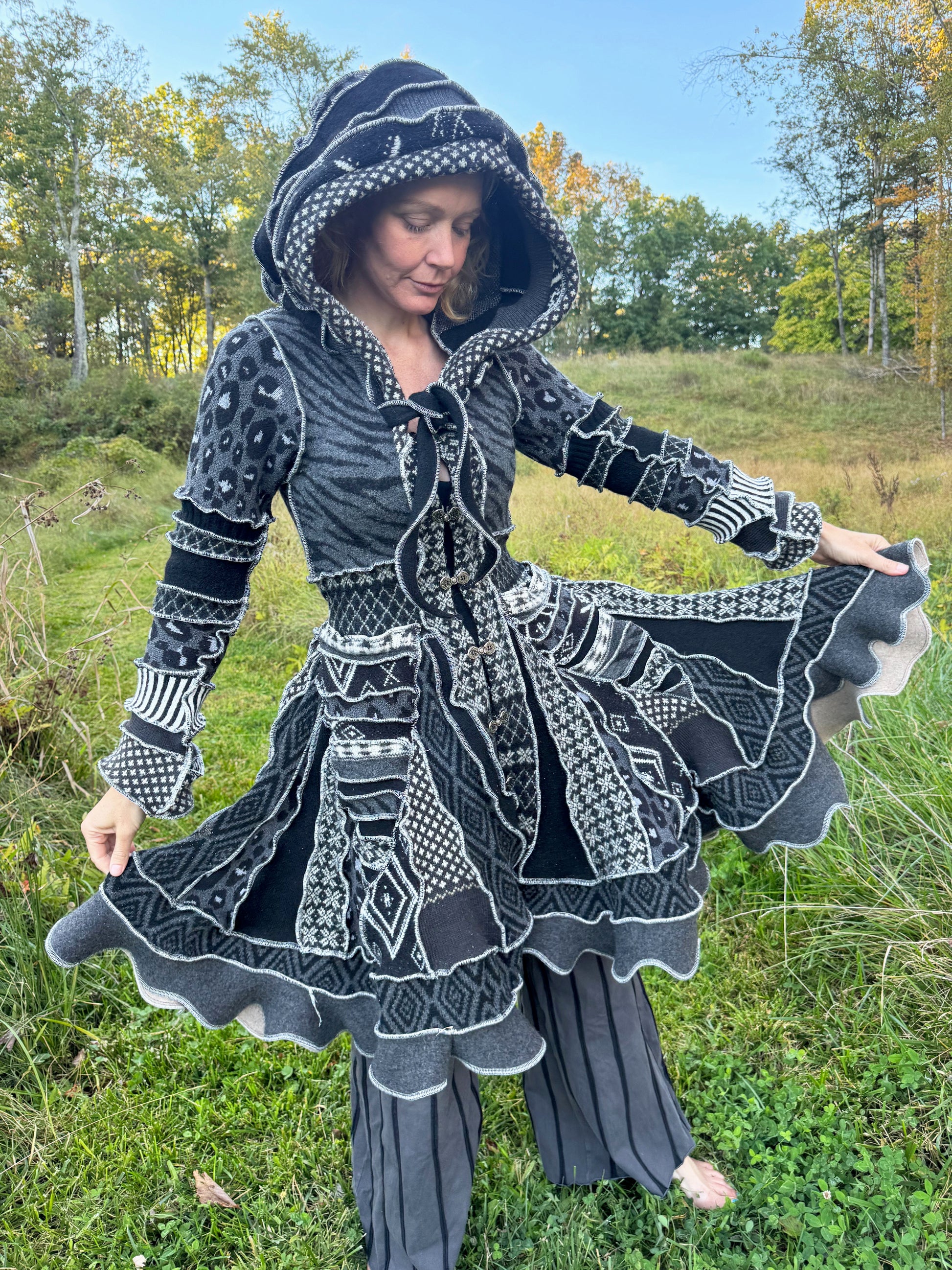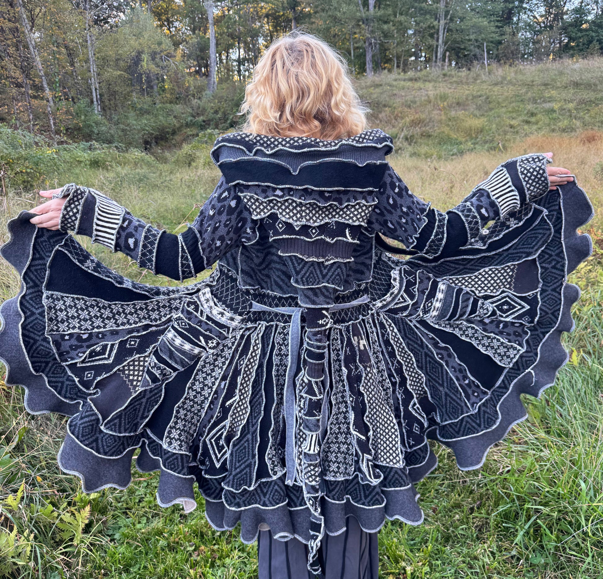 Urania is a captivating constellation of patterns, a swirling galaxy of gorgeousness. It's 100% wool with metallic clasps and is extra sturdy and warm.