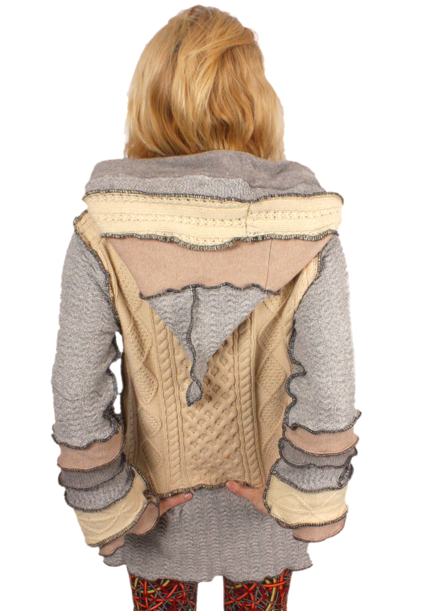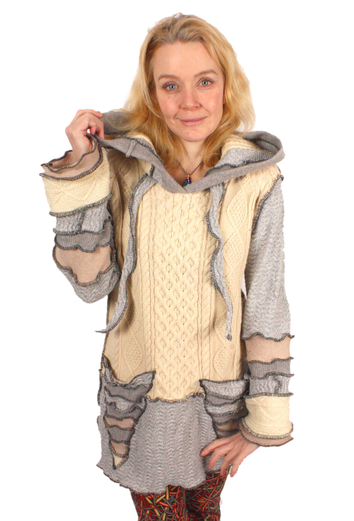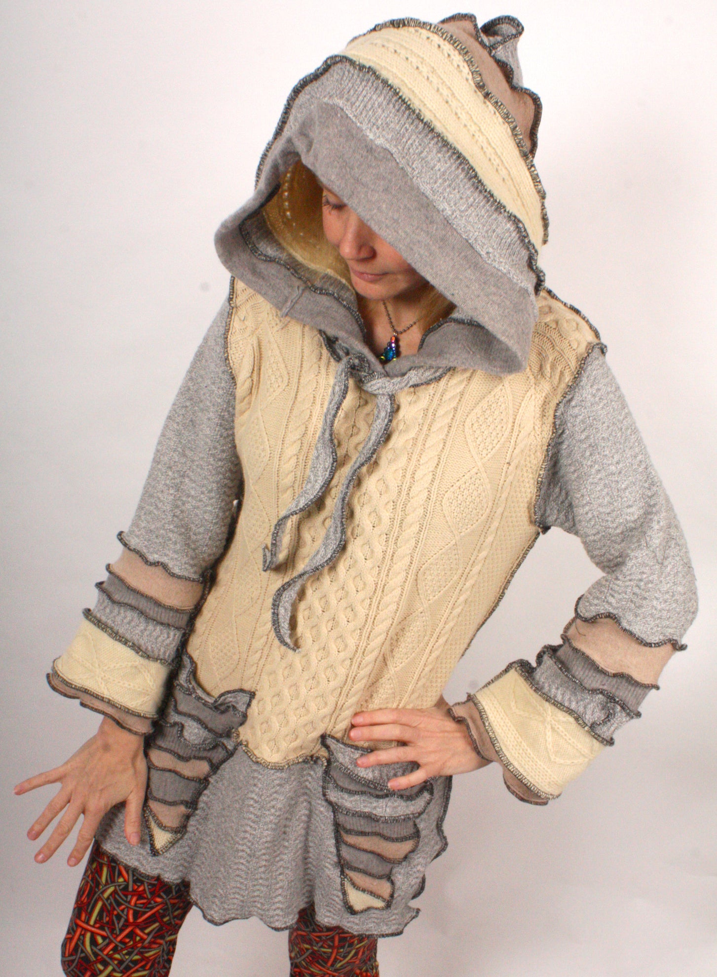 Each Katwise sweater is one-of-a-kind, sewn by me in my attic. They are perfectly imperfect, sometimes borderline wonky. They are all upcycled from sweaters I find in my vast thrift shopping expeditions. There is a huge variety in the texture and stretchiness of these knits, so no two are ever quite alike.