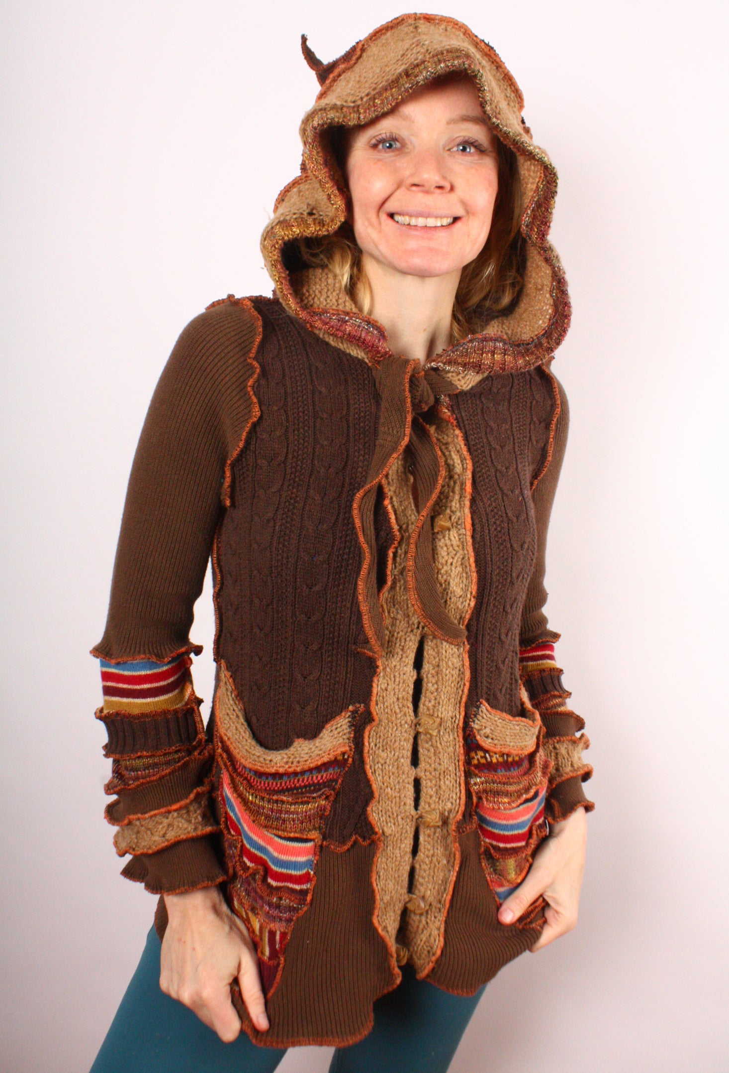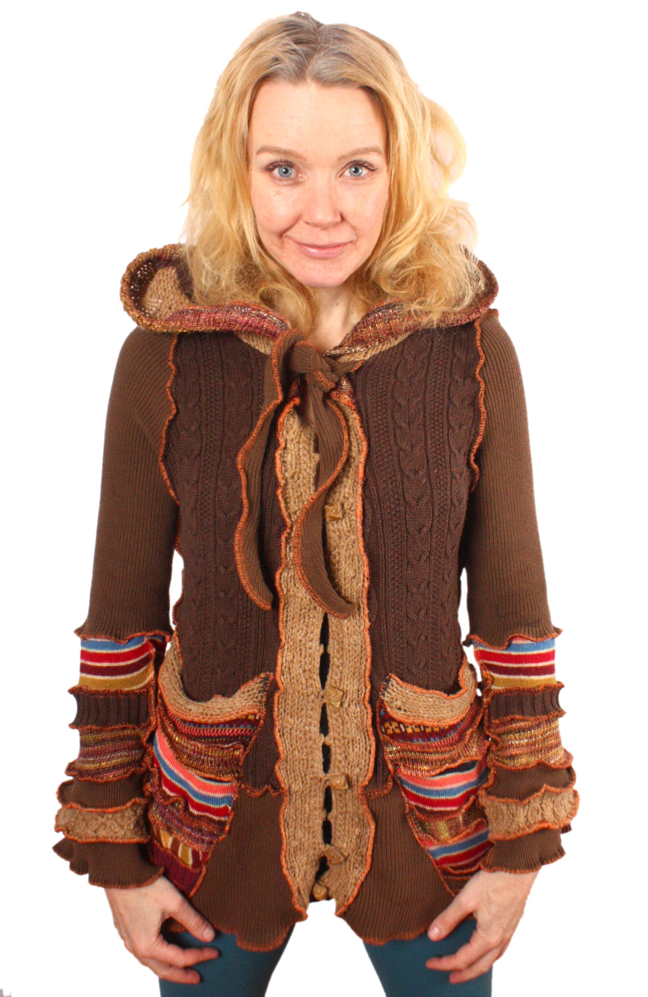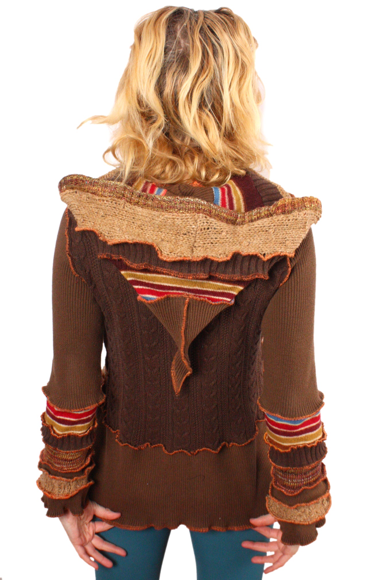 A Damn Fine Cup of Coffee is a bouquet of browns and rainbow speckled stripes with cool wooden button closures. It's mostly cotton with a touch of chunky hand-knit wool.
