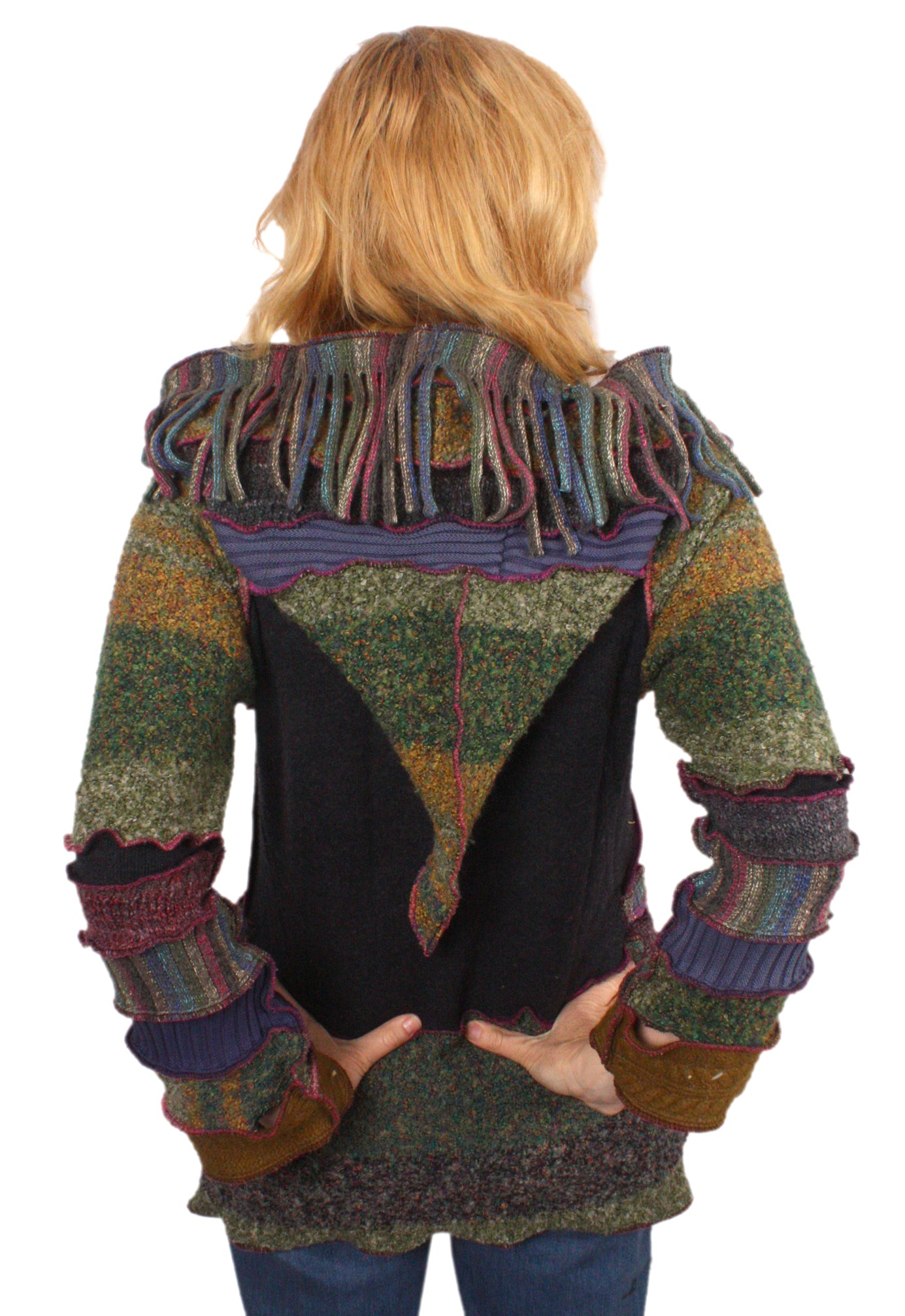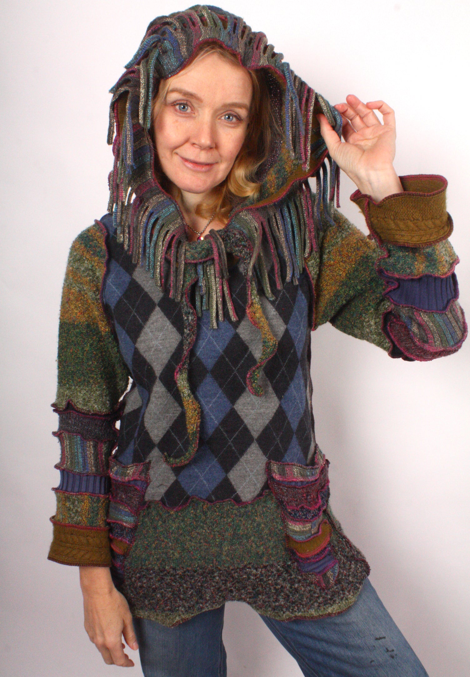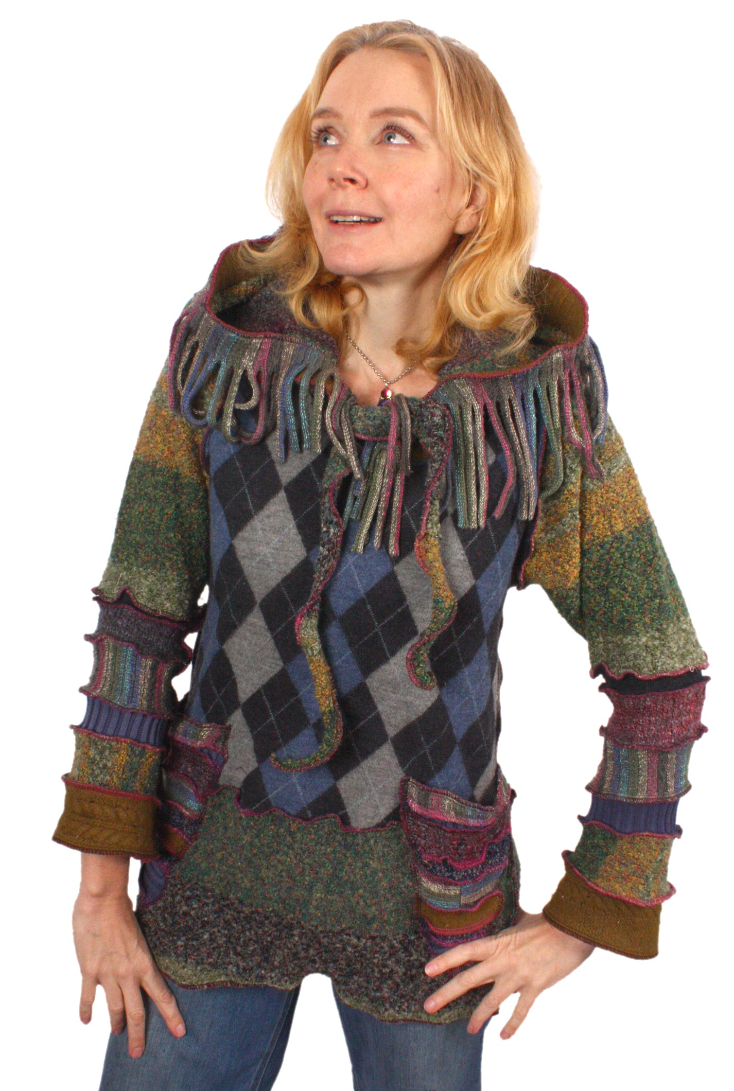 Inconceivable! is a pandemonium of patterns and texture with an argyle bodice and an opalescent fringe hood. Real swamp monster fashionista vibes on this one!