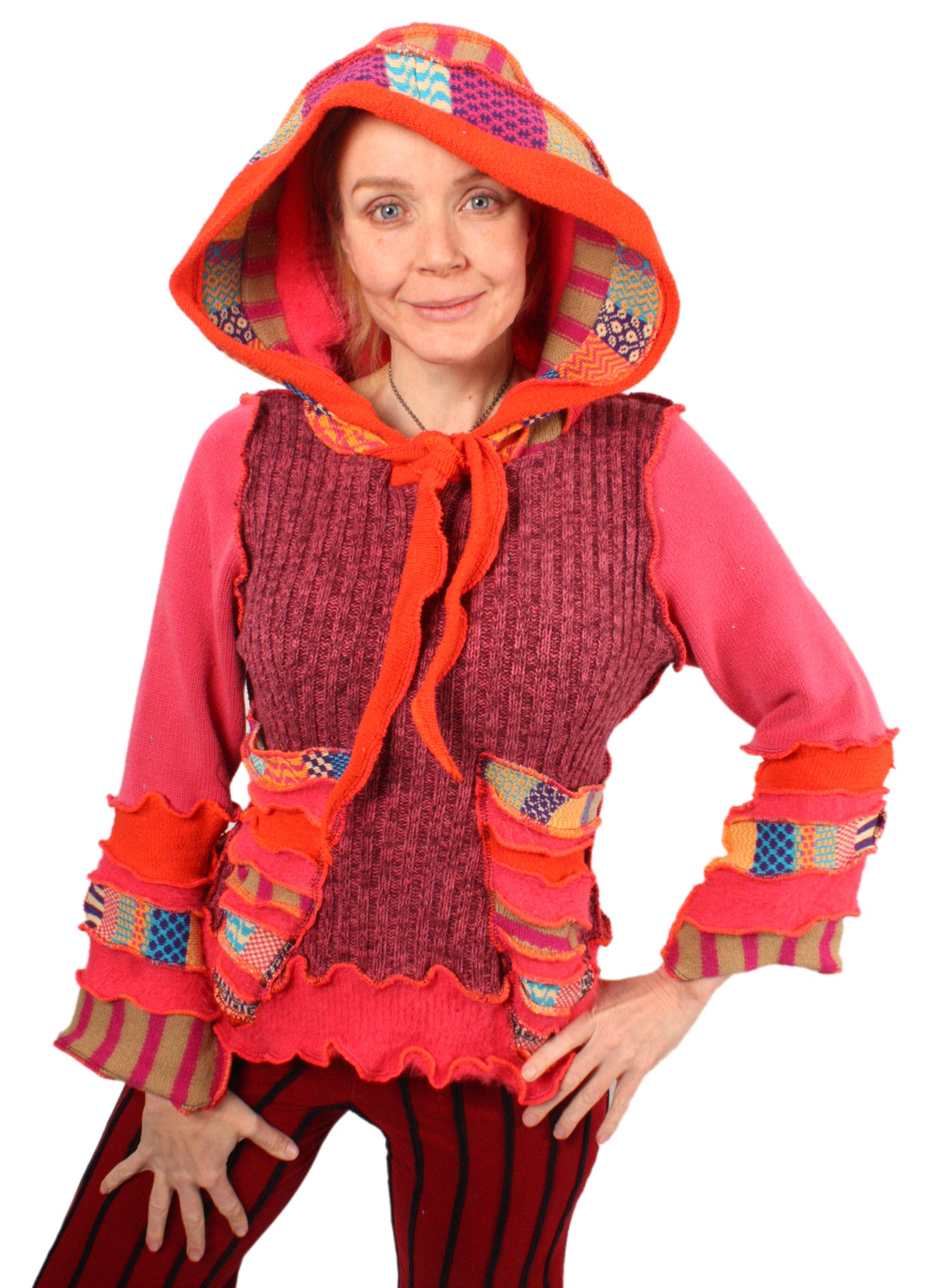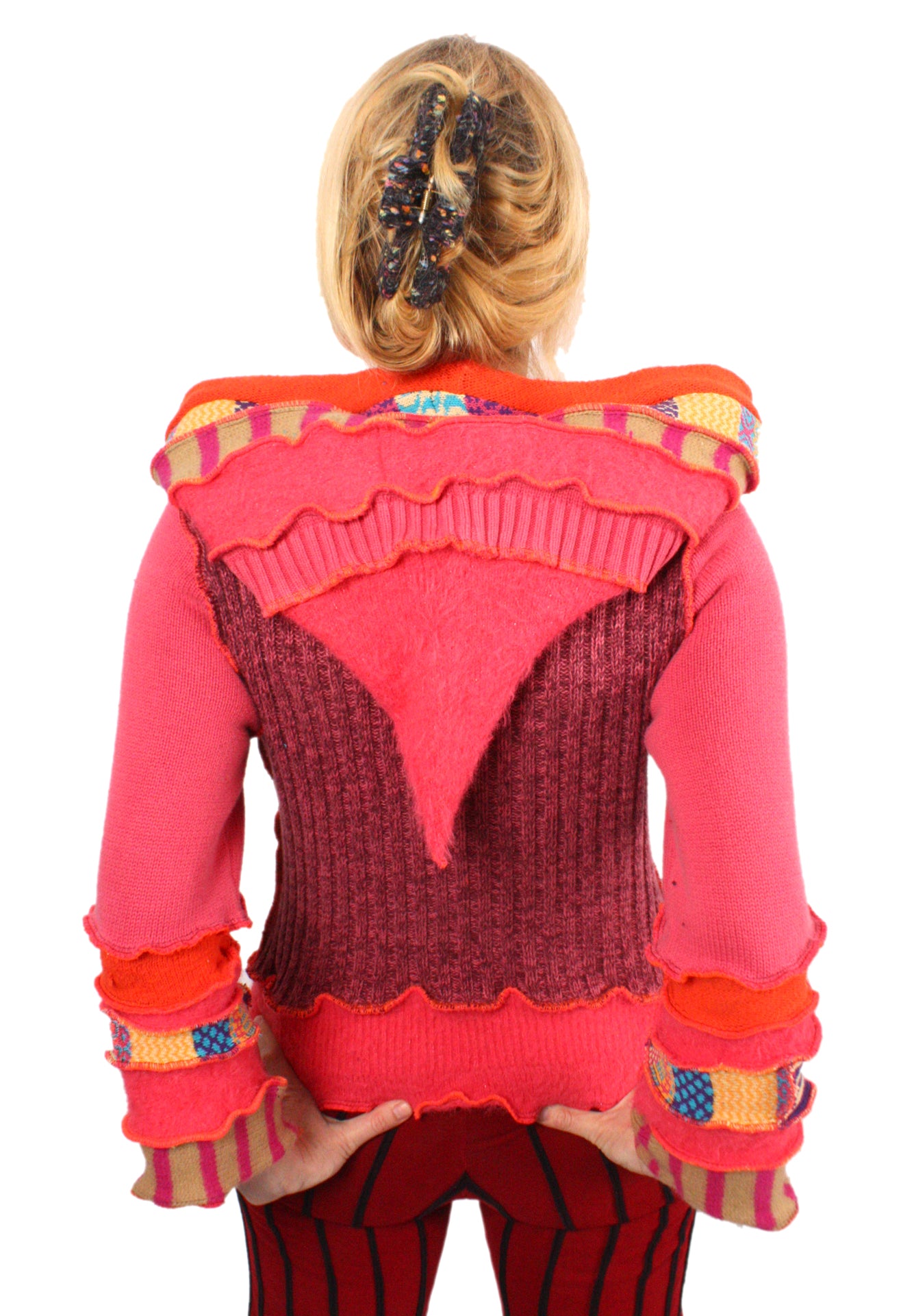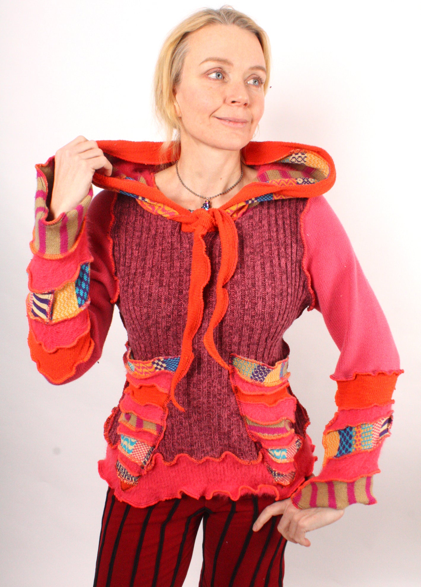 Each Katwise sweater is one-of-a-kind, sewn by me in my attic. They are perfectly imperfect, sometimes borderline wonky. They are all upcycled from sweaters I find in my vast thrift shopping expeditions. There is a huge variety in the texture and stretchiness of these knits, so no two are ever quite alike.