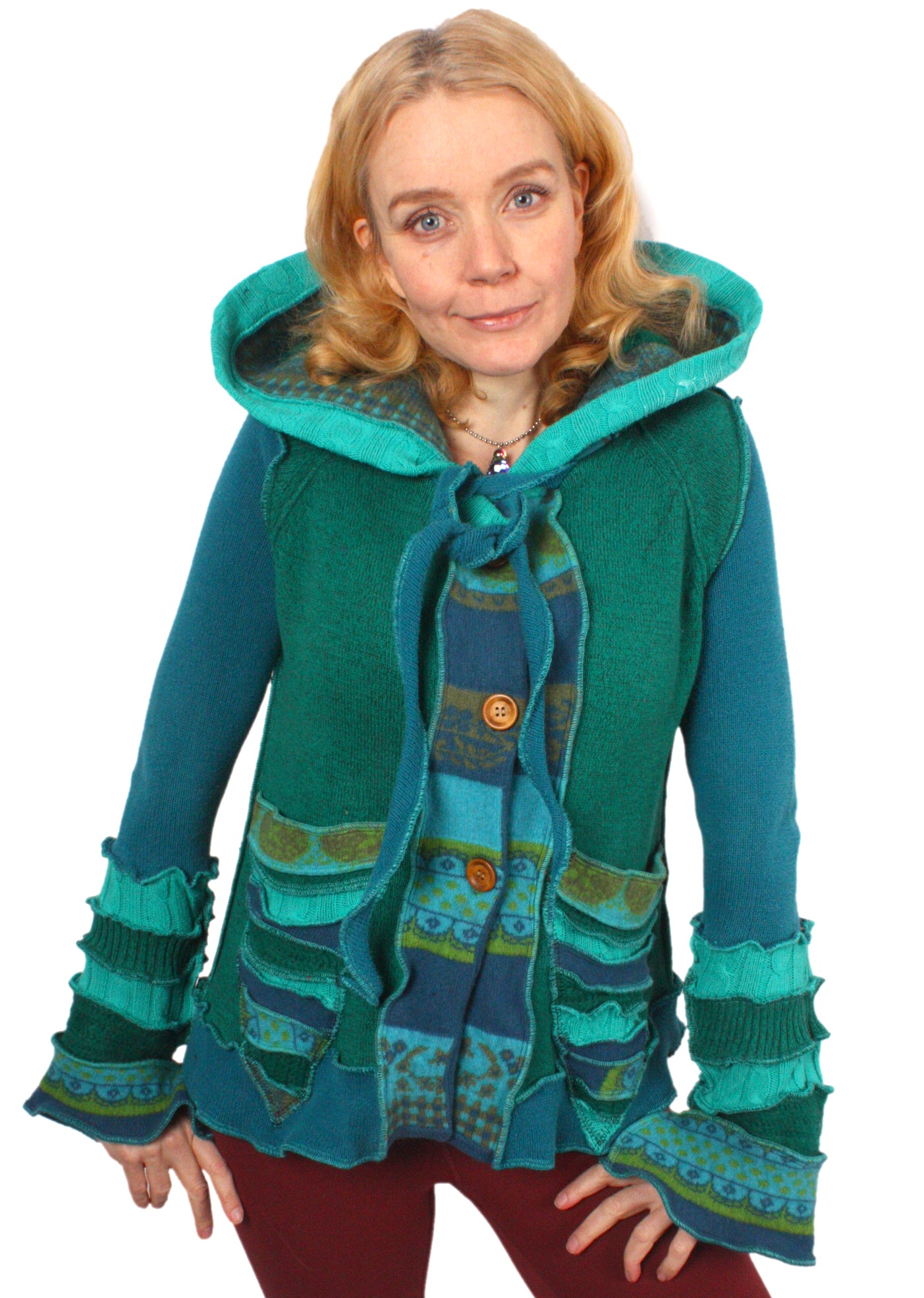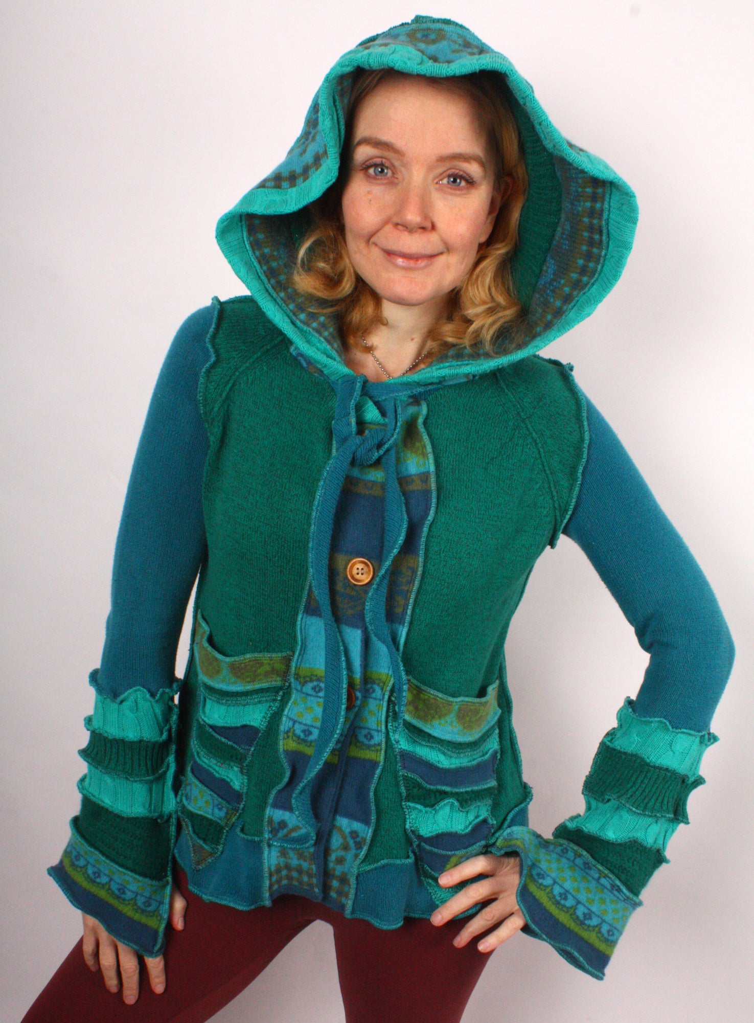 Likely Stories is a jubilant emerald cardigan with blue-green pattern accents and a wooden button front. It's mostly cotton with a touch of wool.