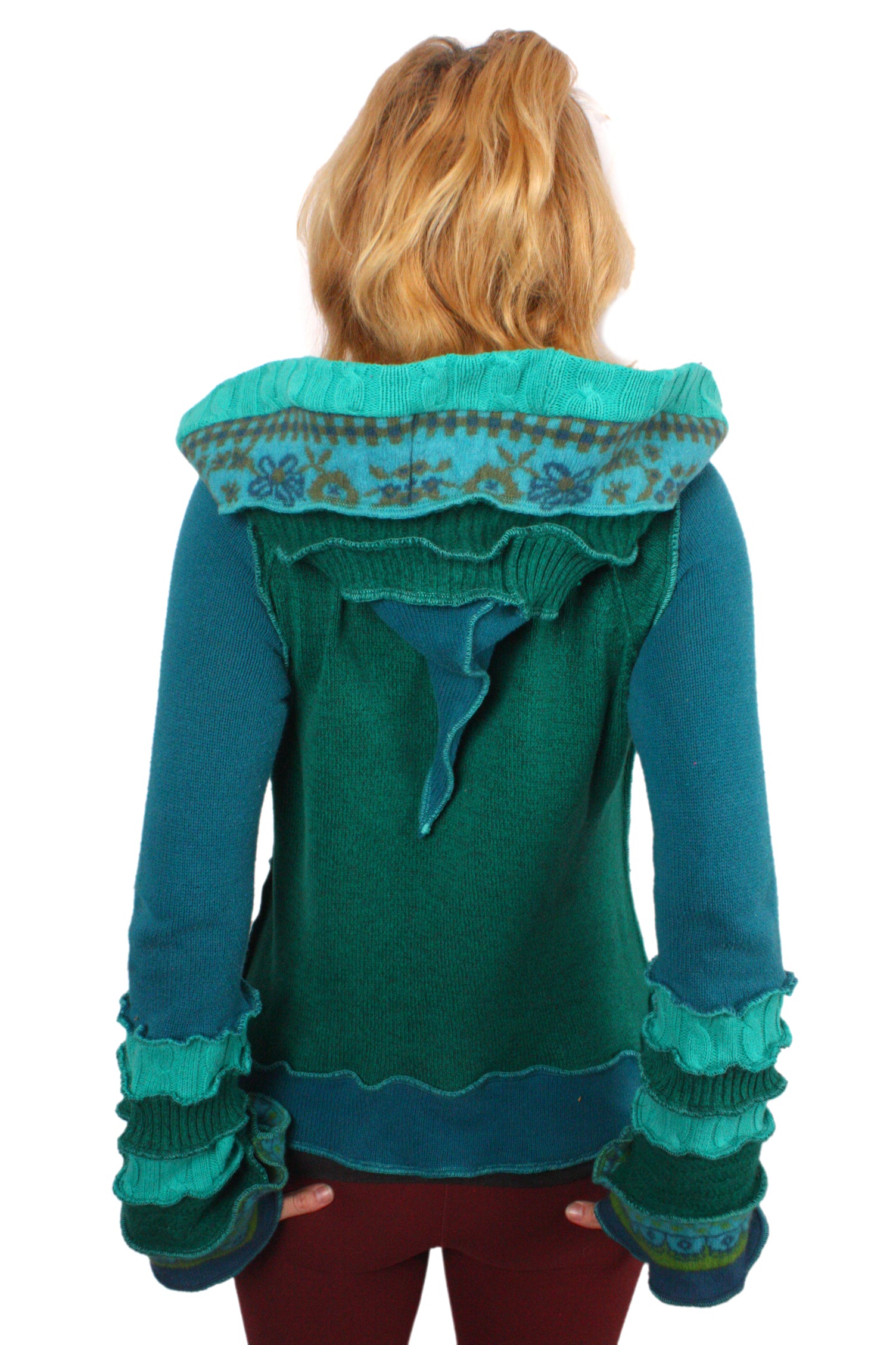 Each Katwise sweater is one-of-a-kind, sewn by me in my attic. They are perfectly imperfect, sometimes borderline wonky. They are all upcycled from sweaters I find in my vast thrift shopping expeditions. There is a huge variety in the texture and stretchiness of these knits, so no two are ever quite alike.