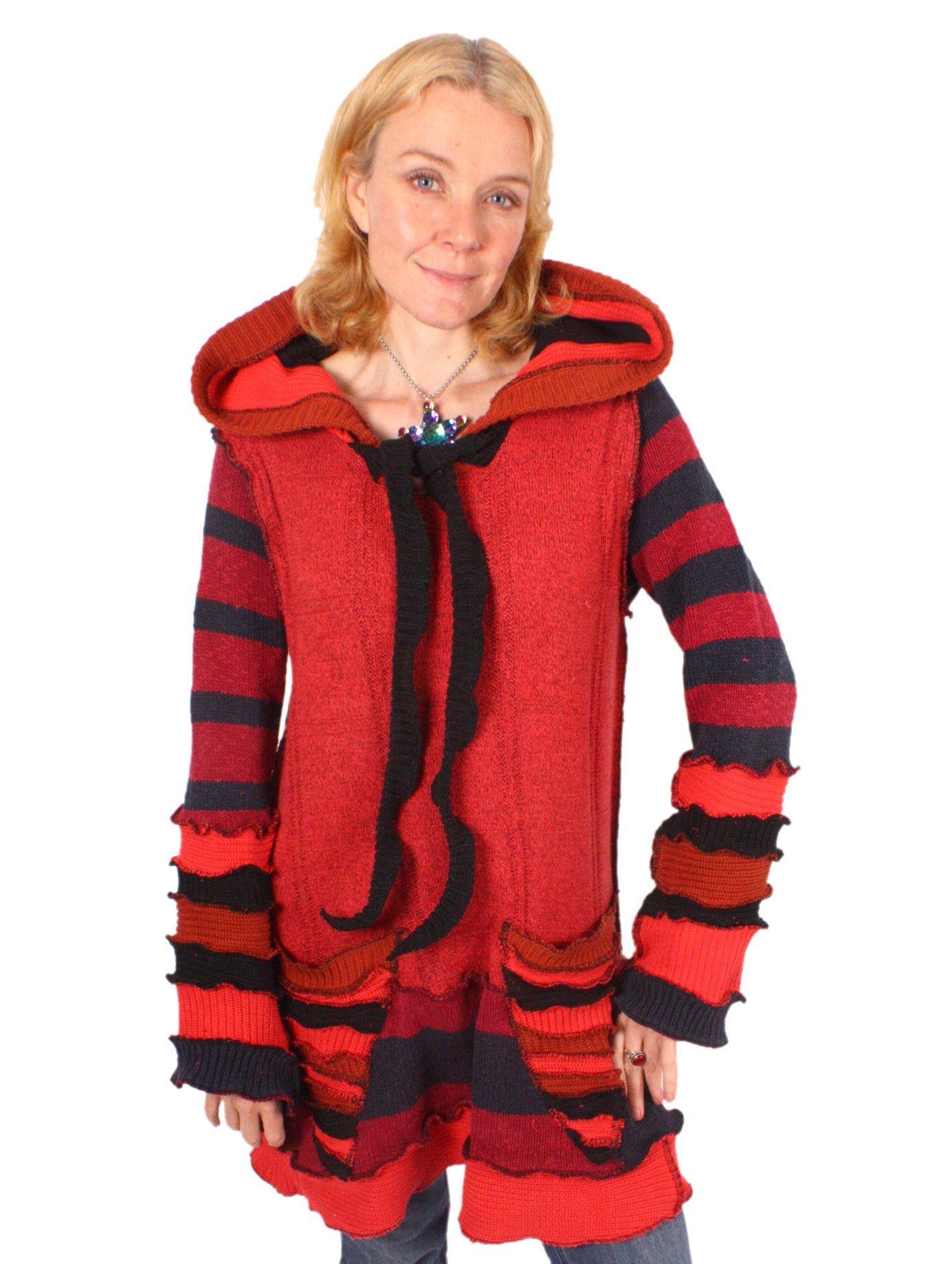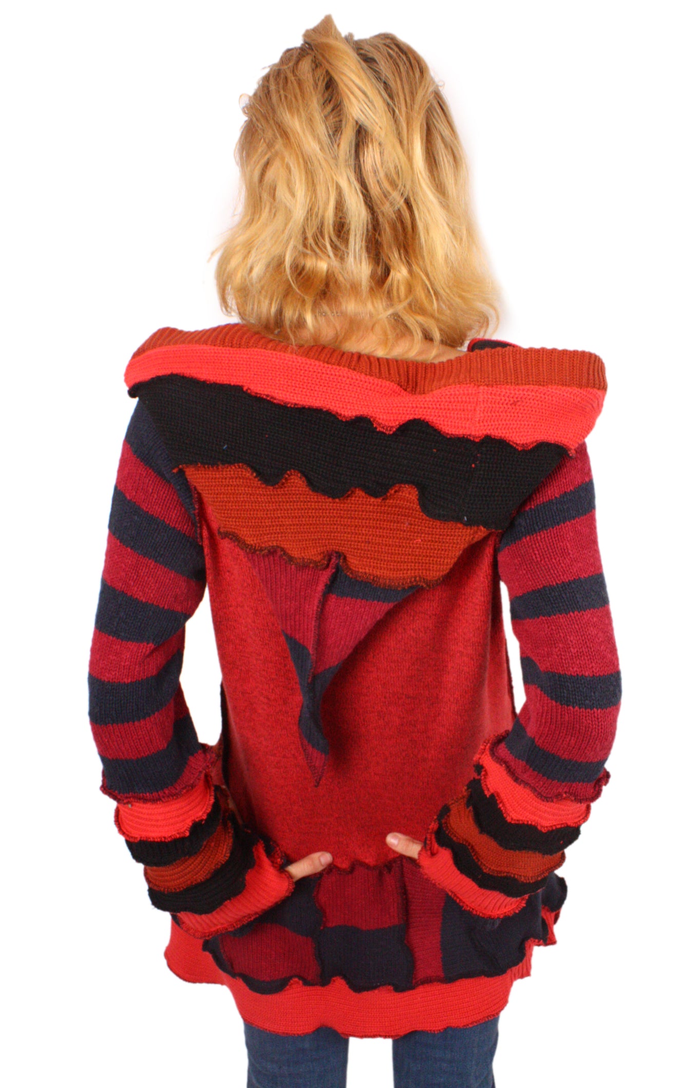 Each Katwise sweater is one-of-a-kind, sewn by me in my attic. They are perfectly imperfect, sometimes borderline wonky. They are all upcycled from sweaters I find in my vast thrift shopping expeditions. There is a huge variety in the texture and stretchiness of these knits, so no two are ever quite alike.