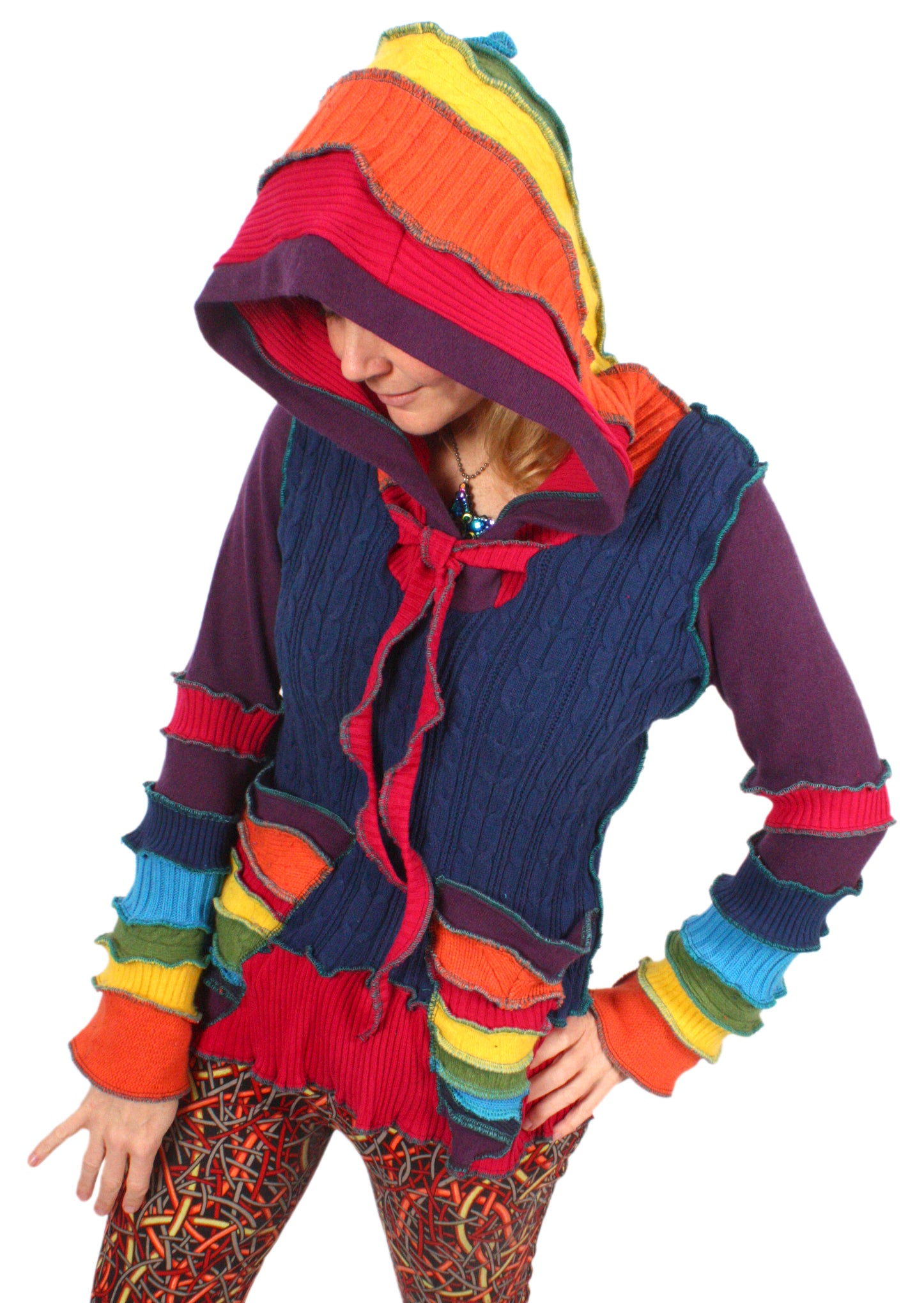 Crazy Clown Time is a super vibrant rainbow hoodie of cotton and wool with teal seams. It's kind of light and stretchy