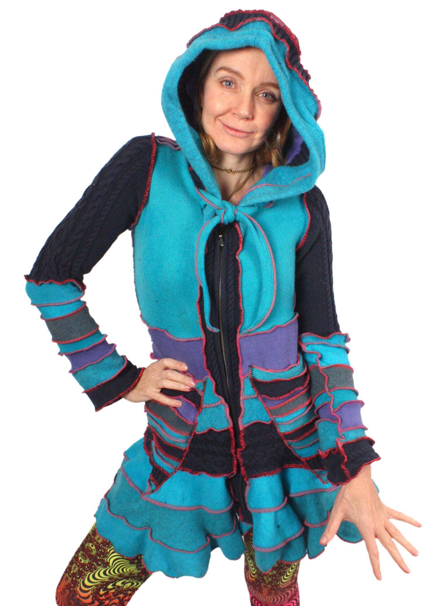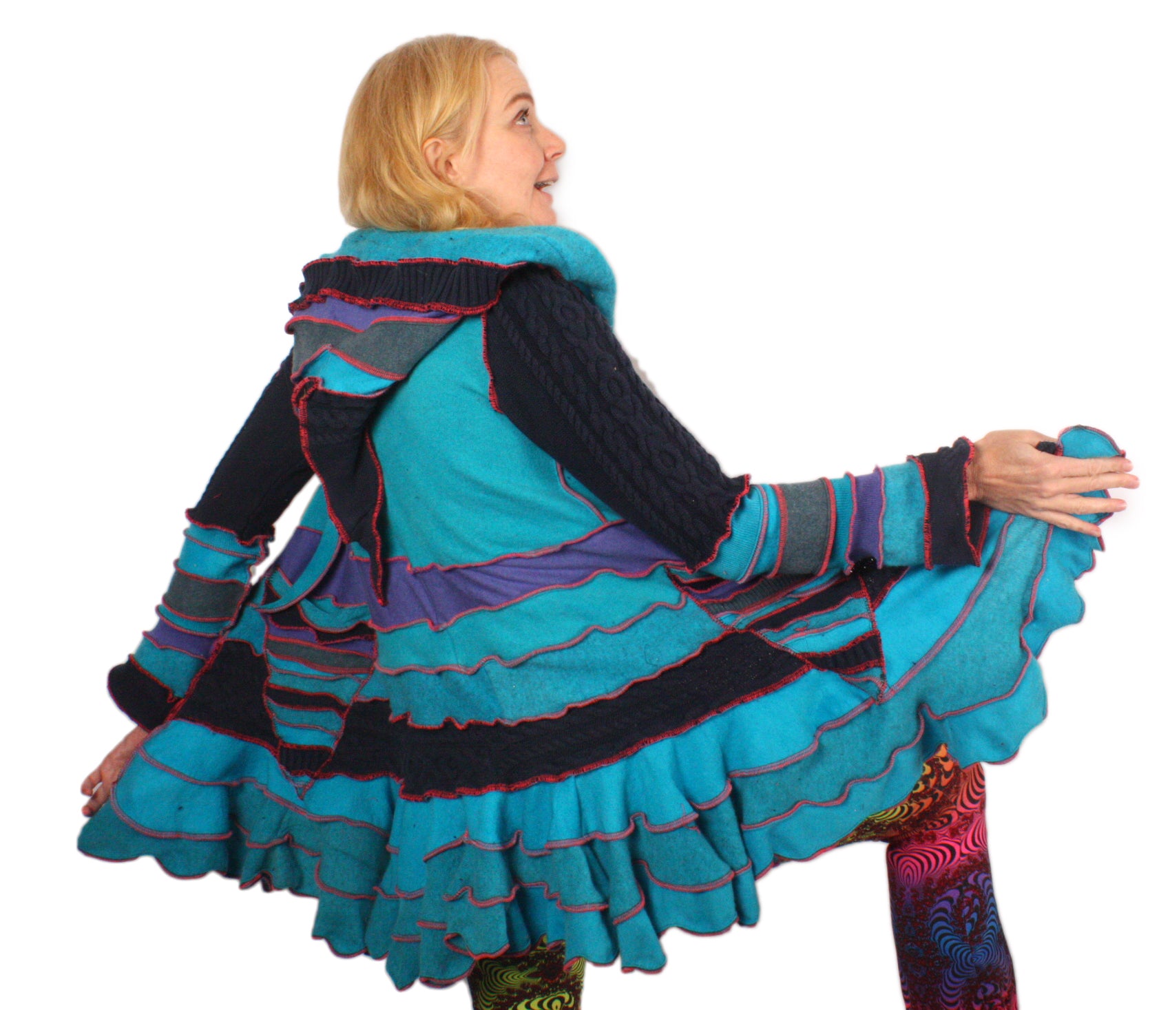 Flouncy Coats are fun and twirly with lots of bouncy ruffles. I use lots of lightweight soft stretchy knits that make these very comfy and easy to wear, while still being extravagantly cheerful.