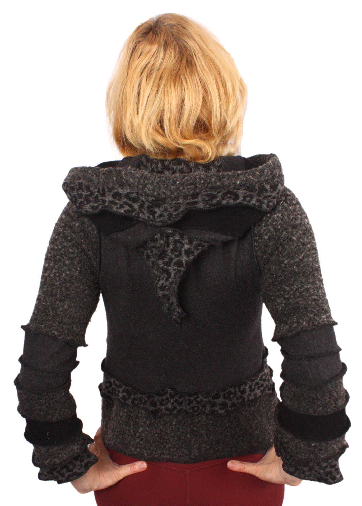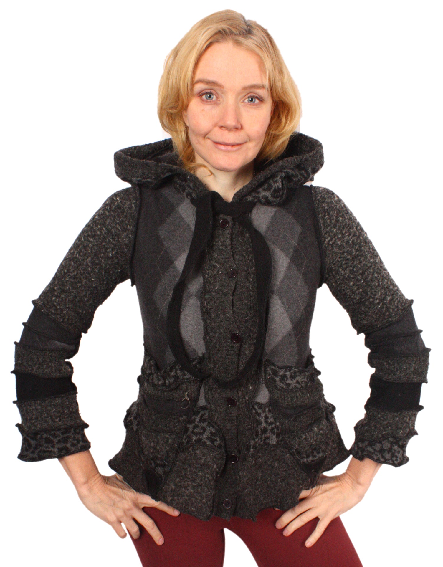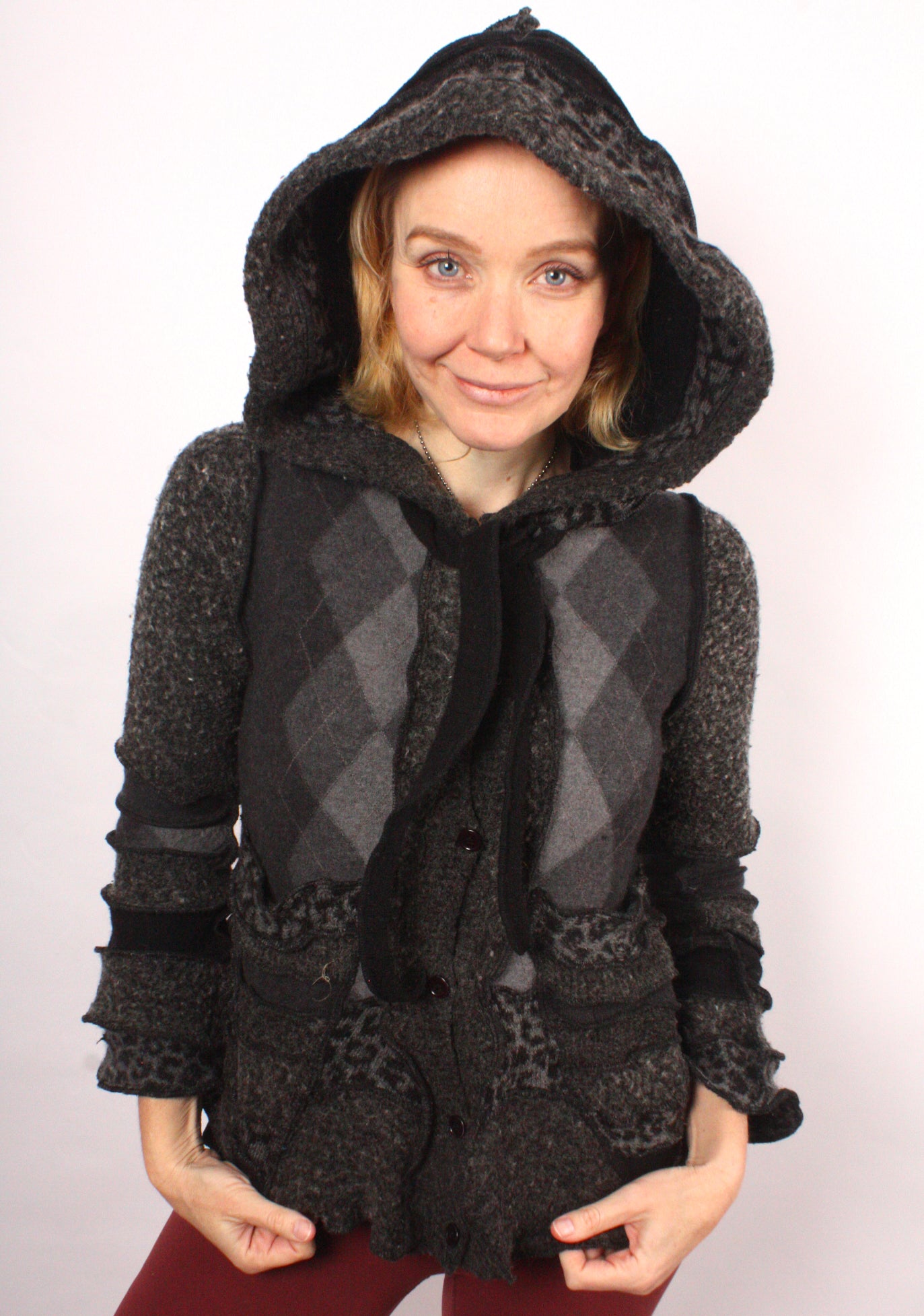 The Story Of Us is a cuddly cardigan of charcoal argyle and dark leopard-print. It's mostly wool with a touch of nylon and a nice bell shape.