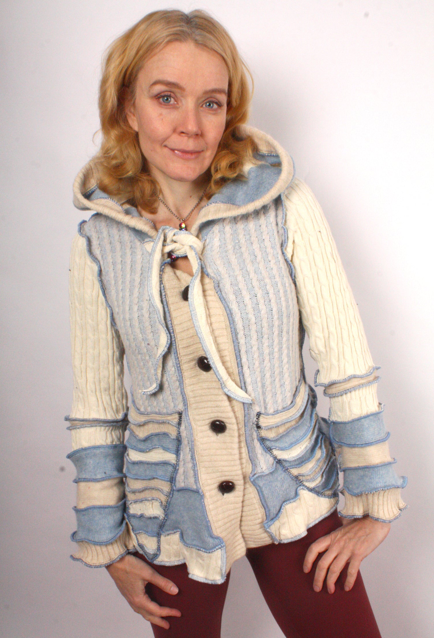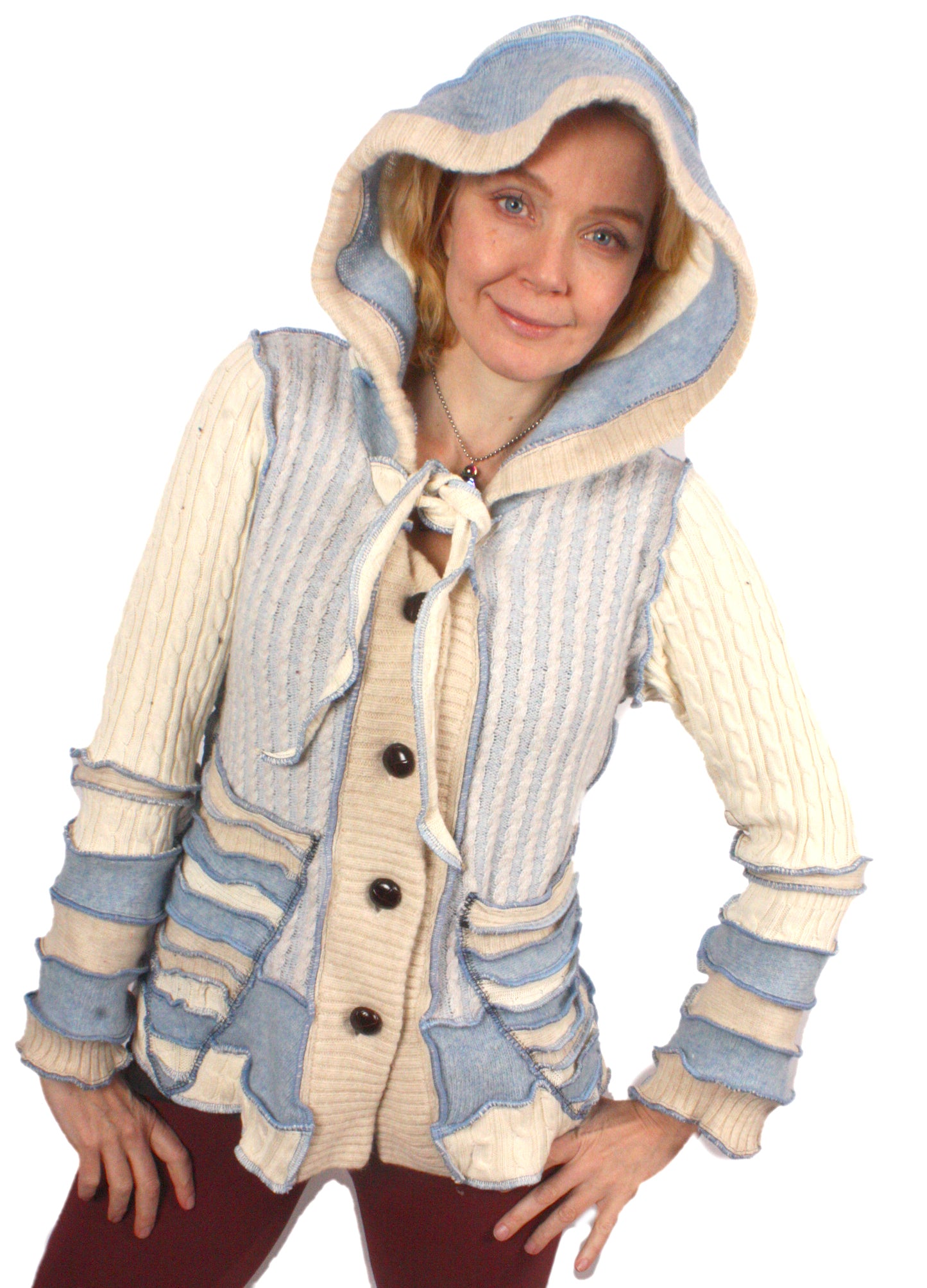 Each Katwise sweater is one-of-a-kind, sewn by me in my attic. They are perfectly imperfect, sometimes borderline wonky. They are all upcycled from sweaters I find in my vast thrift shopping expeditions. There is a huge variety in the texture and stretchiness of these knits, so no two are ever quite alike.