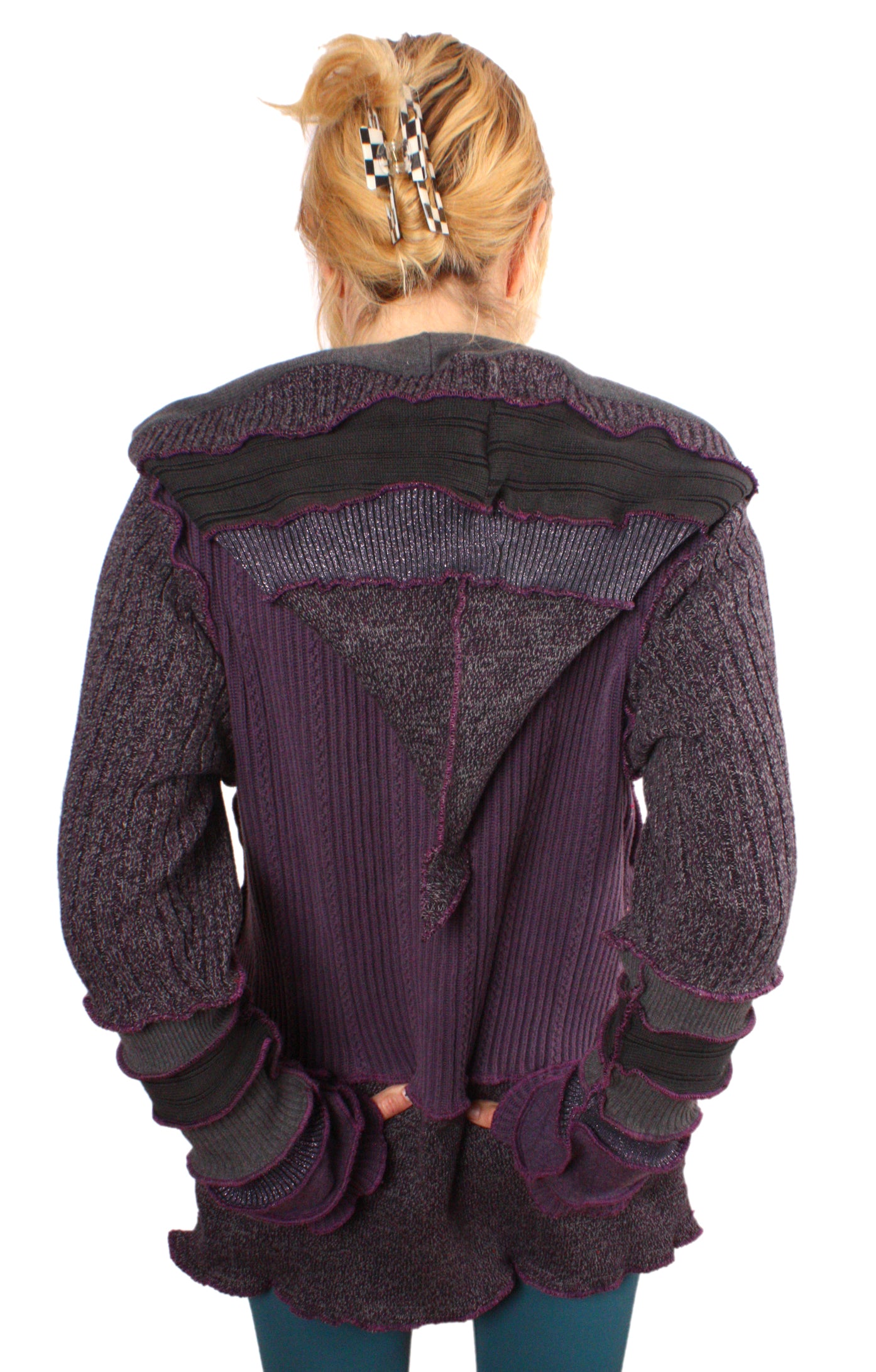 Each Katwise sweater is one-of-a-kind, sewn by me in my attic. They are perfectly imperfect, sometimes borderline wonky. They are all upcycled from sweaters I find in my vast thrift shopping expeditions. There is a huge variety in the texture and stretchiness of these knits, so no two are ever quite alike.