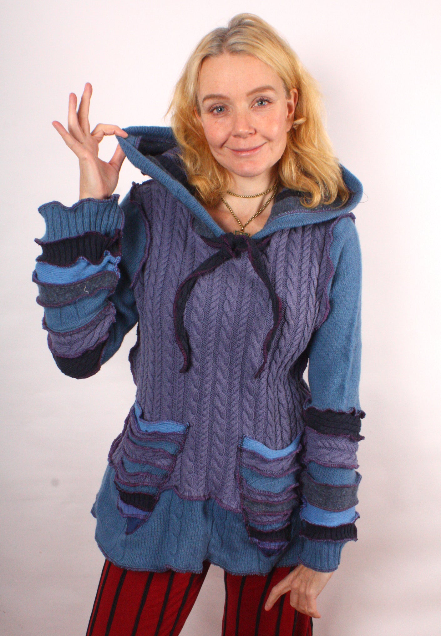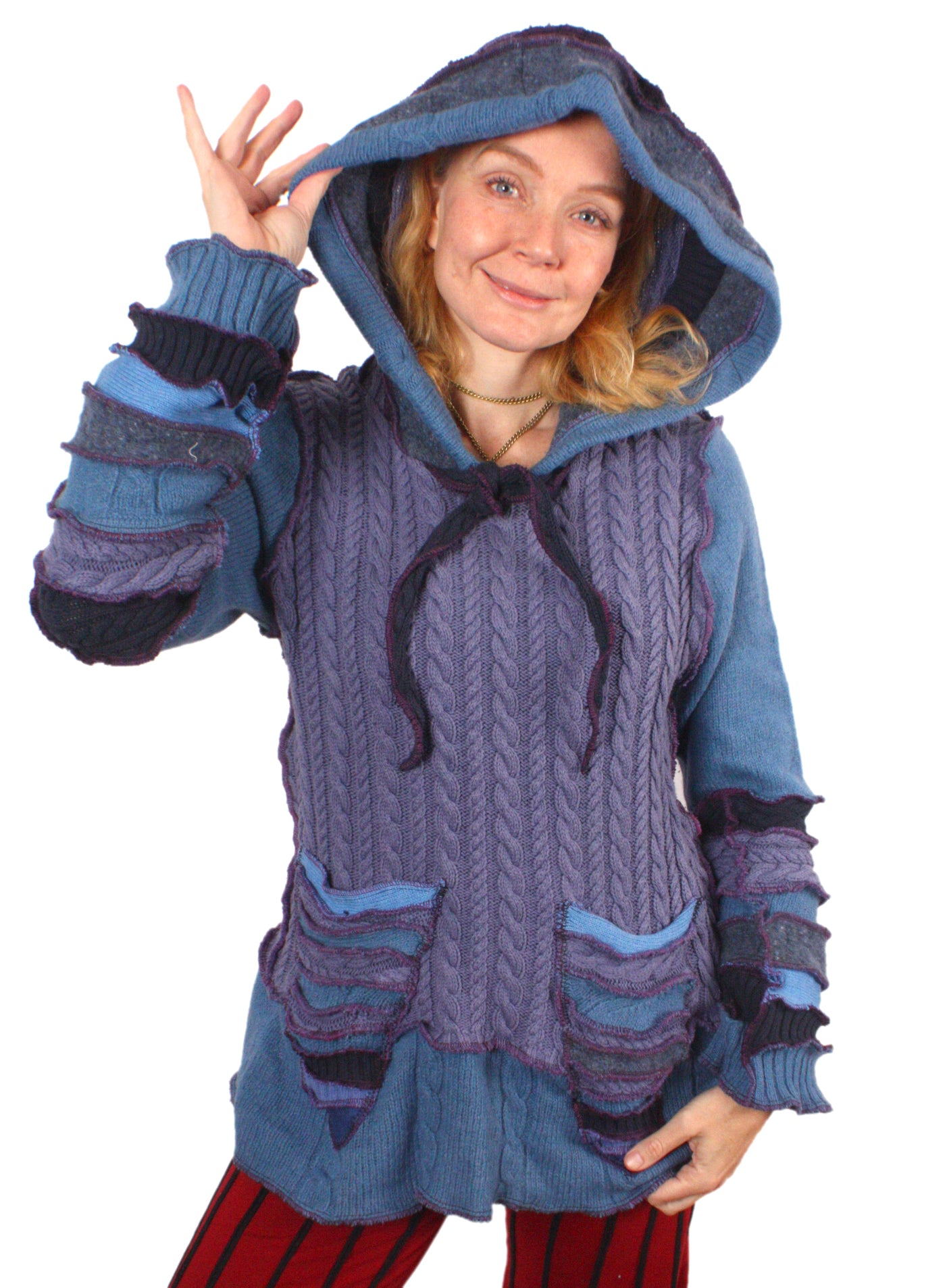 Each Katwise sweater is one-of-a-kind, sewn by me in my attic. They are perfectly imperfect, sometimes borderline wonky. They are all upcycled from sweaters I find in my vast thrift shopping expeditions. There is a huge variety in the texture and stretchiness of these knits, so no two are ever quite alike.