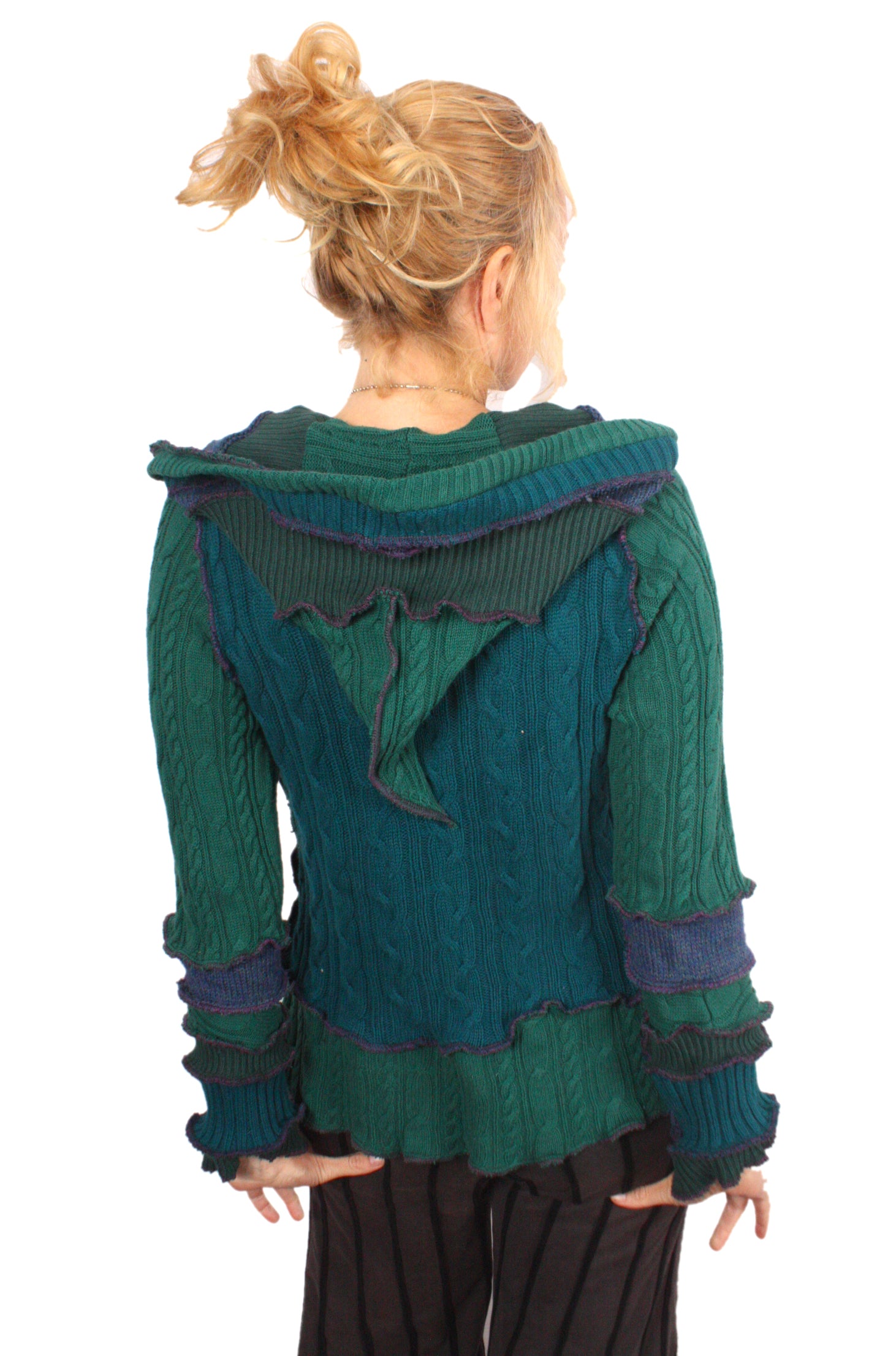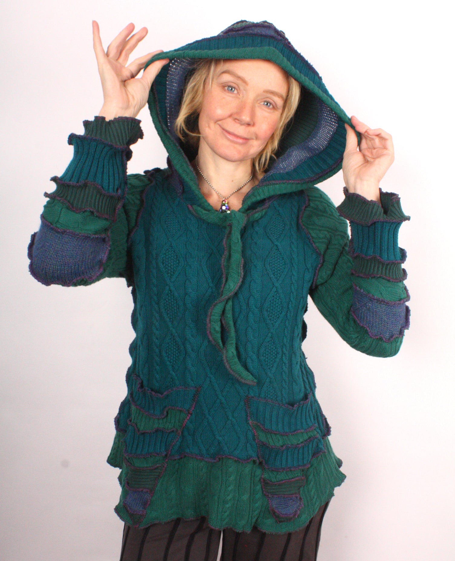 Each Katwise sweater is one-of-a-kind, sewn by me in my attic. They are perfectly imperfect, sometimes borderline wonky. They are all upcycled from sweaters I find in my vast thrift shopping expeditions. There is a huge variety in the texture and stretchiness of these knits, so no two are ever quite alike.