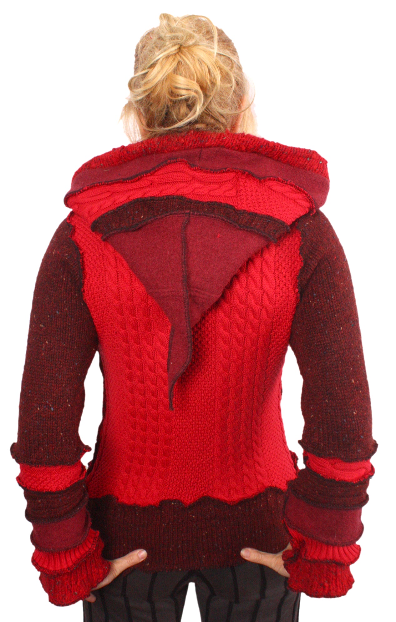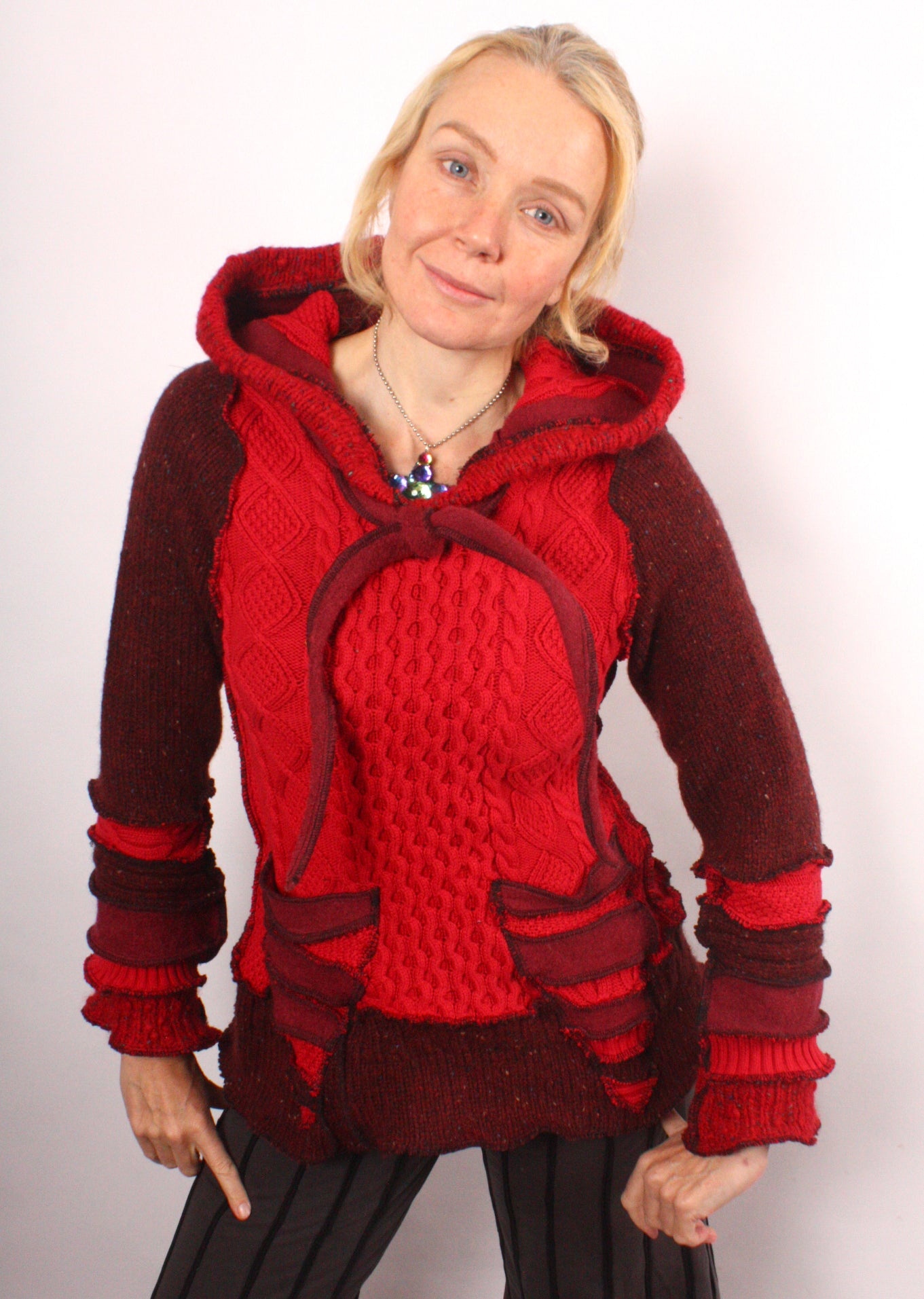 Each Katwise sweater is one-of-a-kind, sewn by me in my attic. They are perfectly imperfect, sometimes borderline wonky. They are all upcycled from sweaters I find in my vast thrift shopping expeditions. There is a huge variety in the texture and stretchiness of these knits, so no two are ever quite alike.