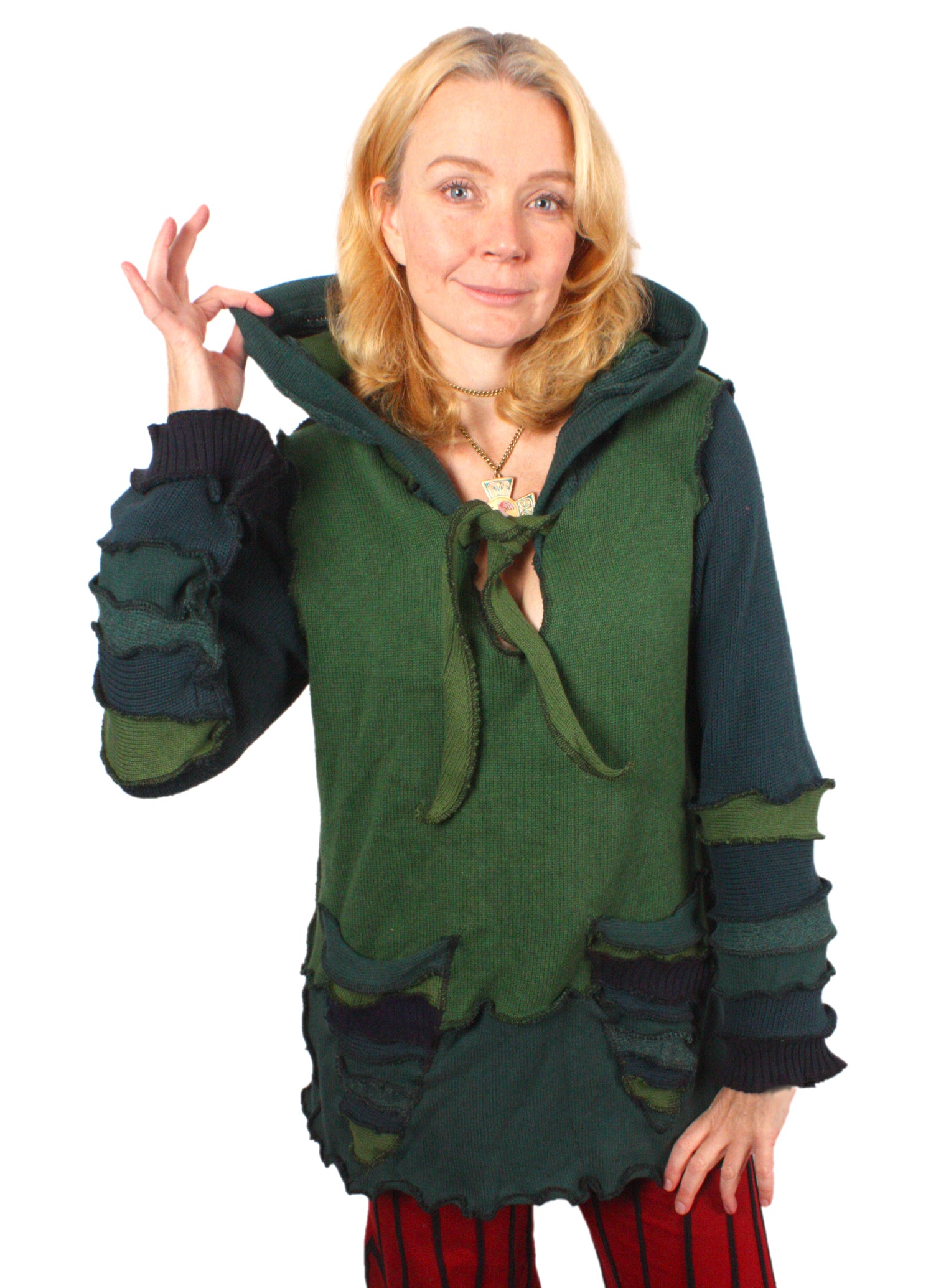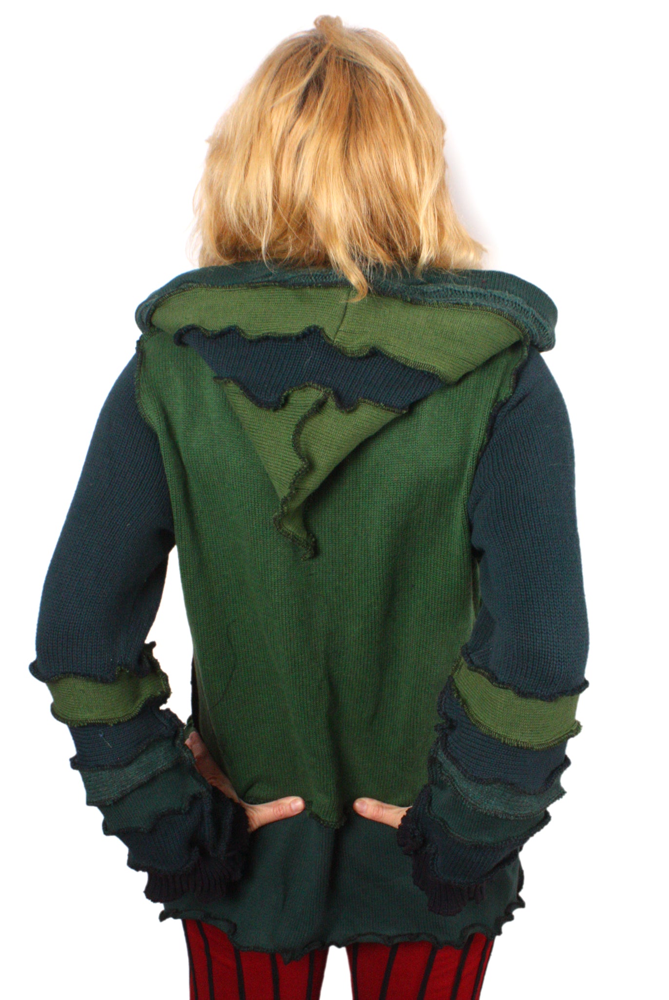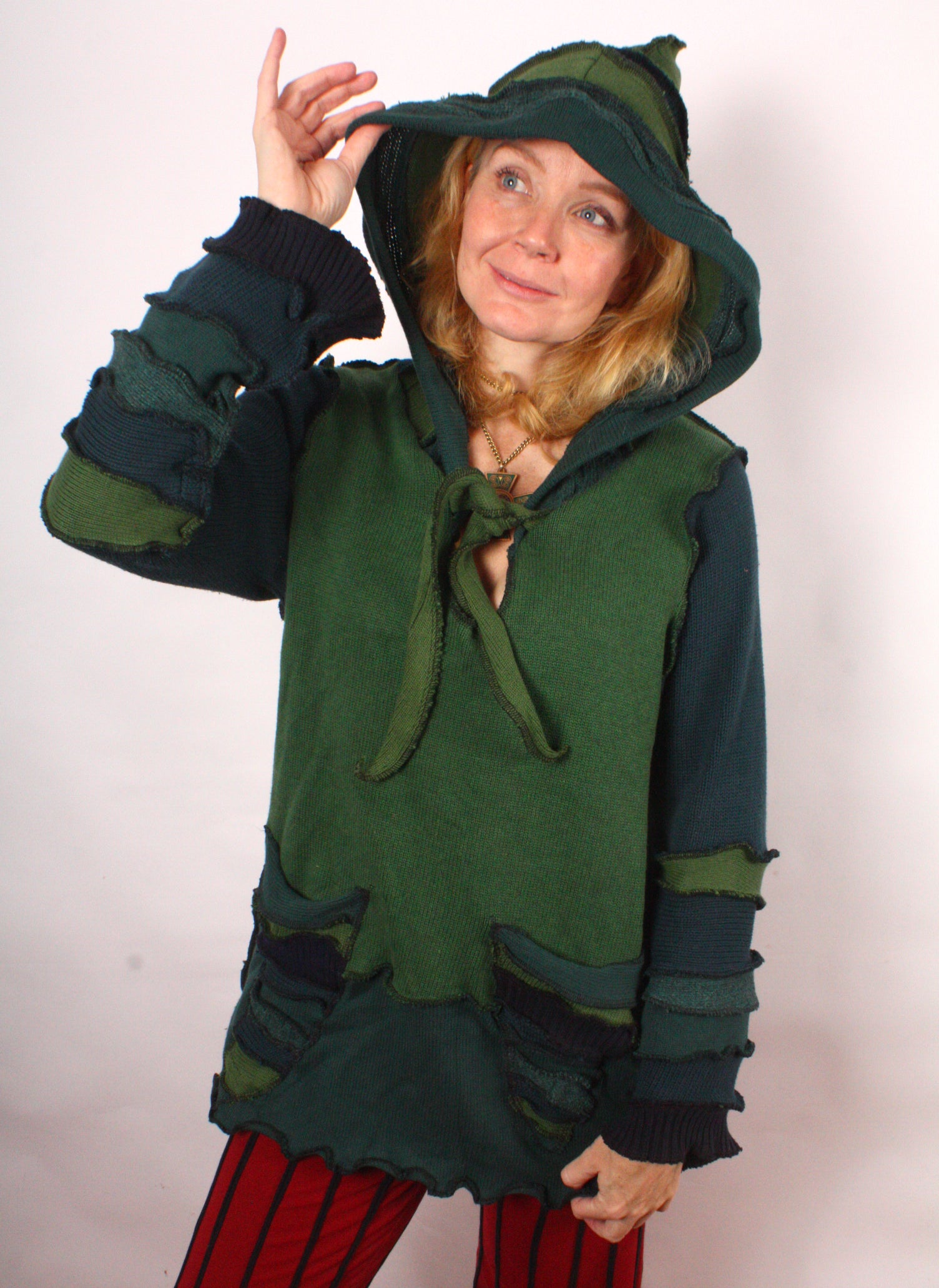 Each Katwise sweater is one-of-a-kind, sewn by me in my attic. They are perfectly imperfect, sometimes borderline wonky. They are all upcycled from sweaters I find in my vast thrift shopping expeditions. There is a huge variety in the texture and stretchiness of these knits, so no two are ever quite alike.