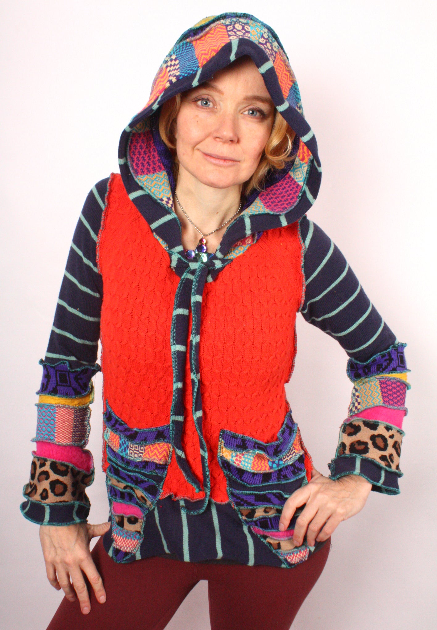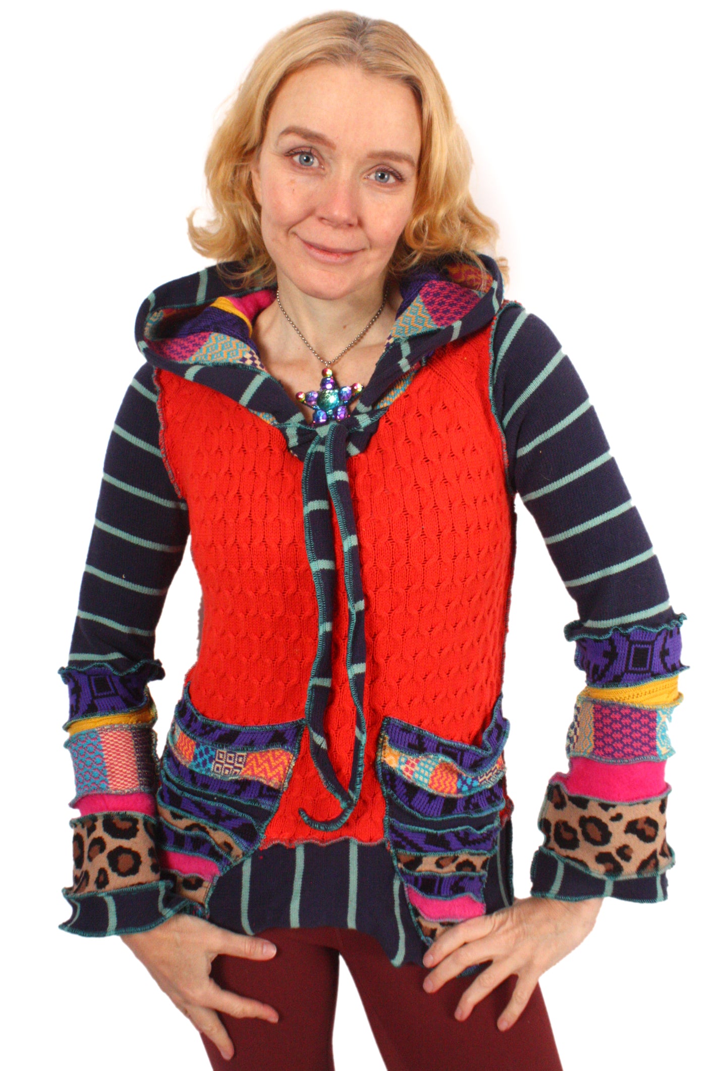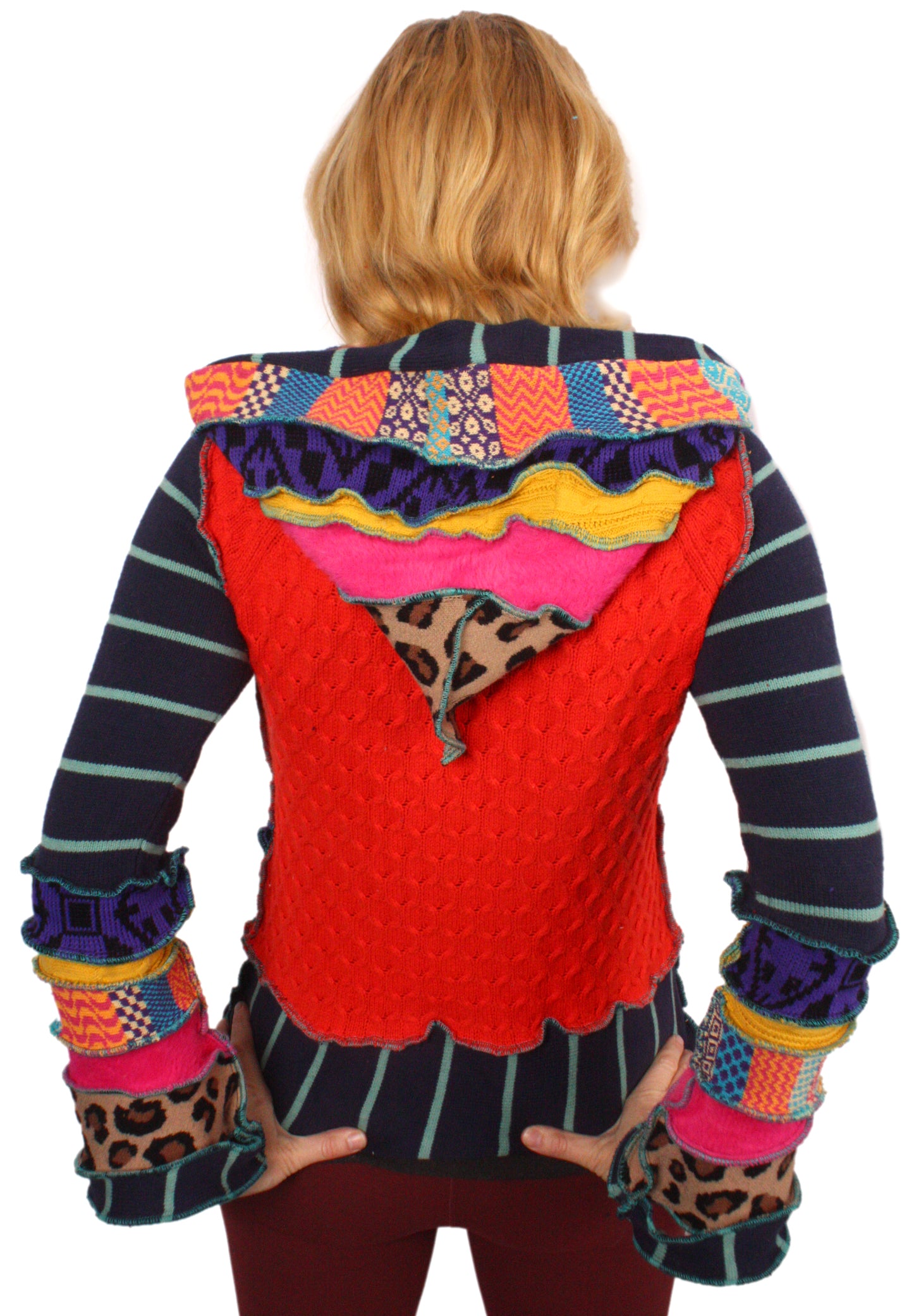 Each Katwise sweater is one-of-a-kind, sewn by me in my attic. They are perfectly imperfect, sometimes borderline wonky. They are all upcycled from sweaters I find in my vast thrift shopping expeditions. There is a huge variety in the texture and stretchiness of these knits, so no two are ever quite alike.